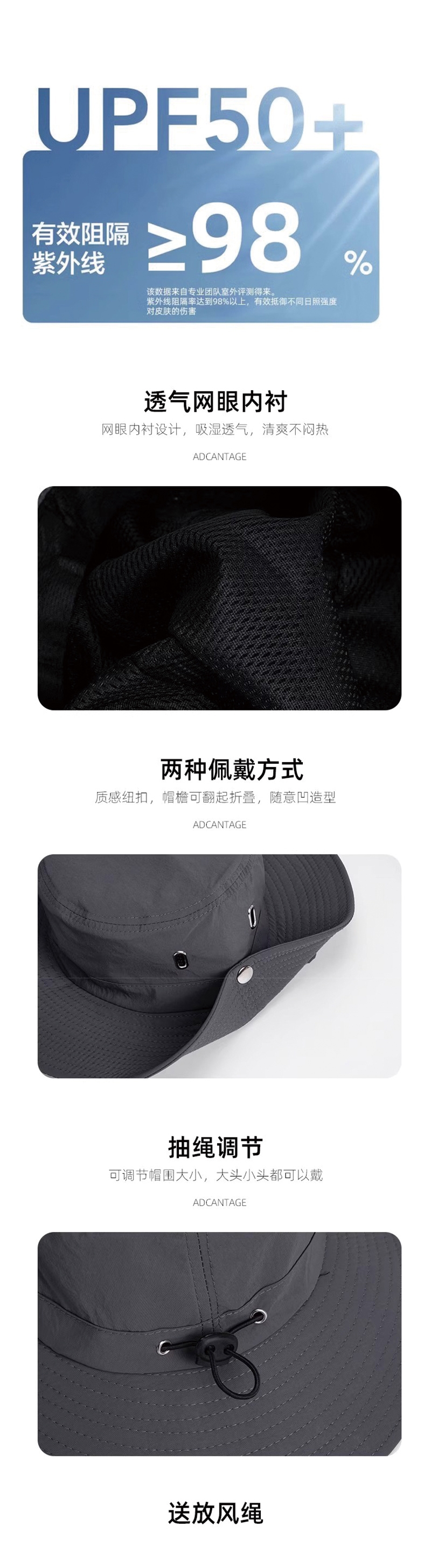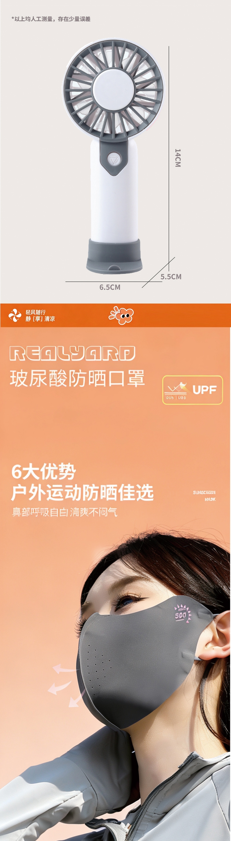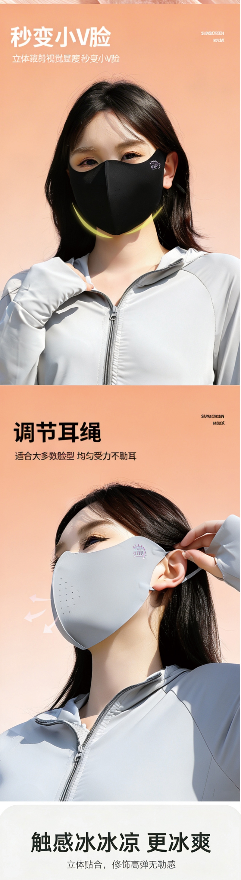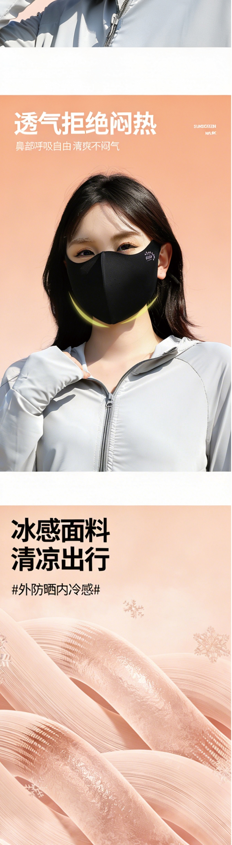 丝面料,凉感防晒高弹性,贴合不紧绷 口罩专业防;专业防晒,全面防护 透气舒适,久戴不闷 ;风扇强劲风力多档可调内置高效电机能够提供强劲而稳定;帽子大帽檐设计,360° 全面防晒优质透气面料