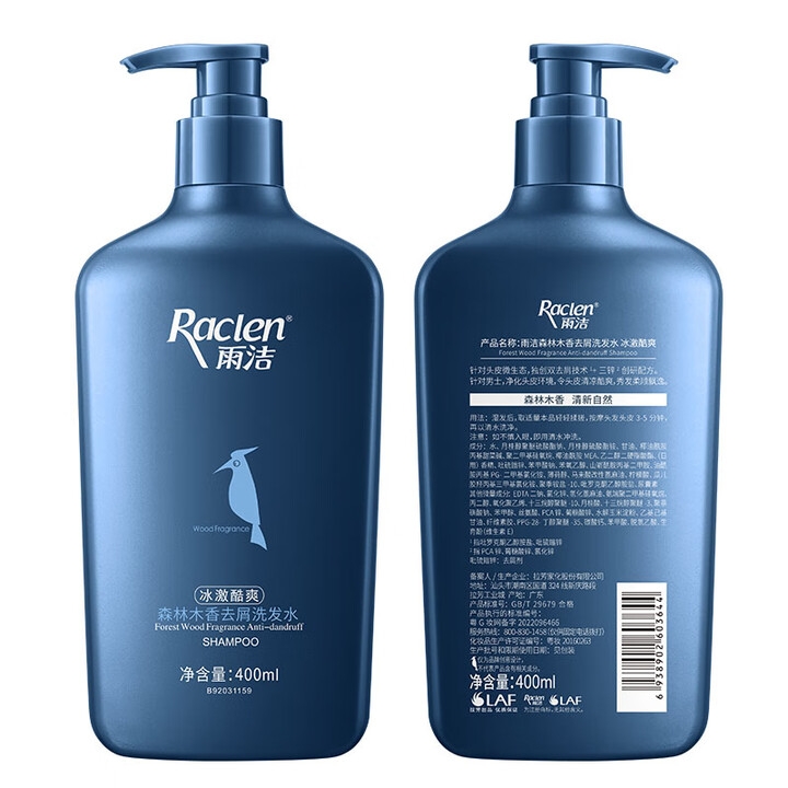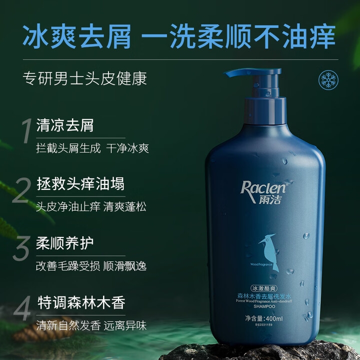 配置清单:雨洁森林木香去屑洗发水(冰激酷爽)400ml 诗朗绿茶氨基酸沐浴露750g
