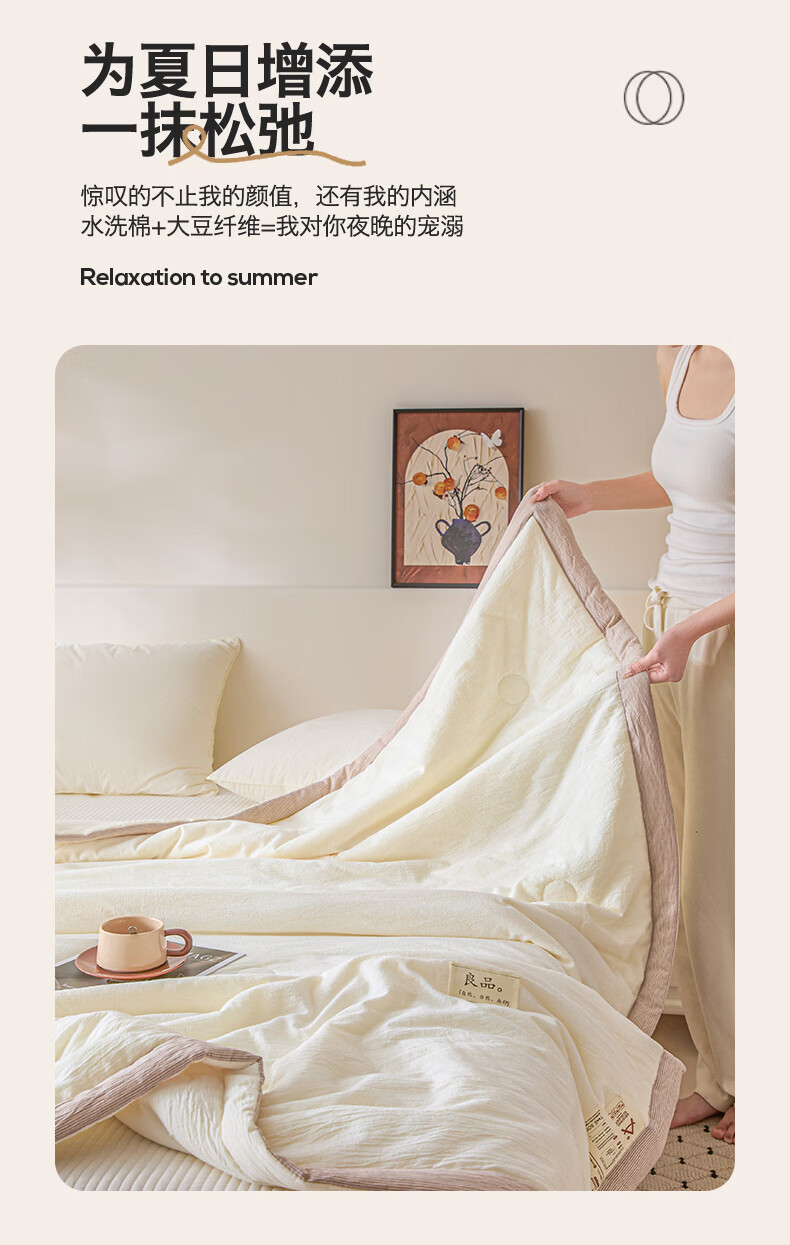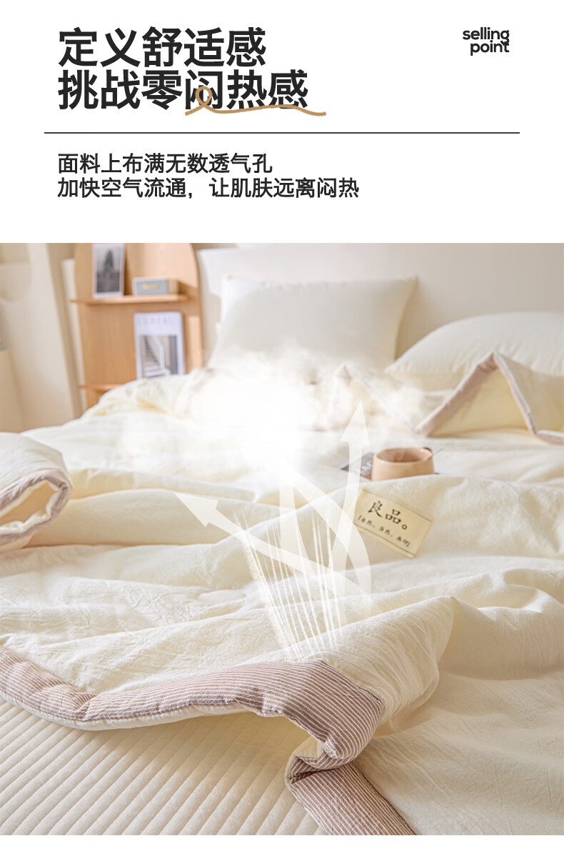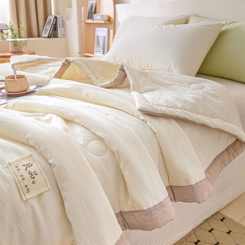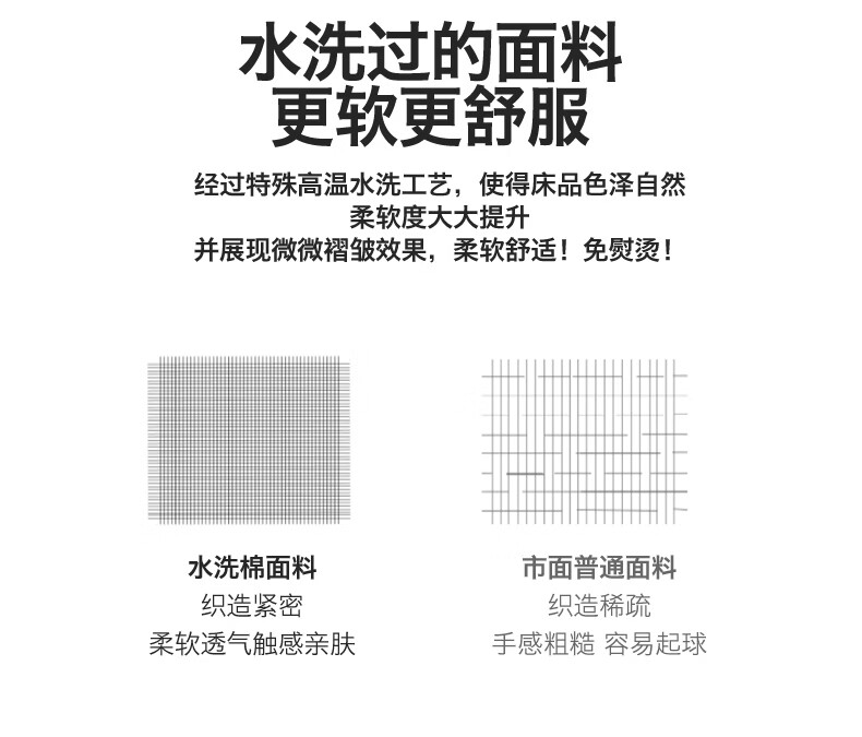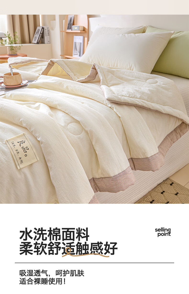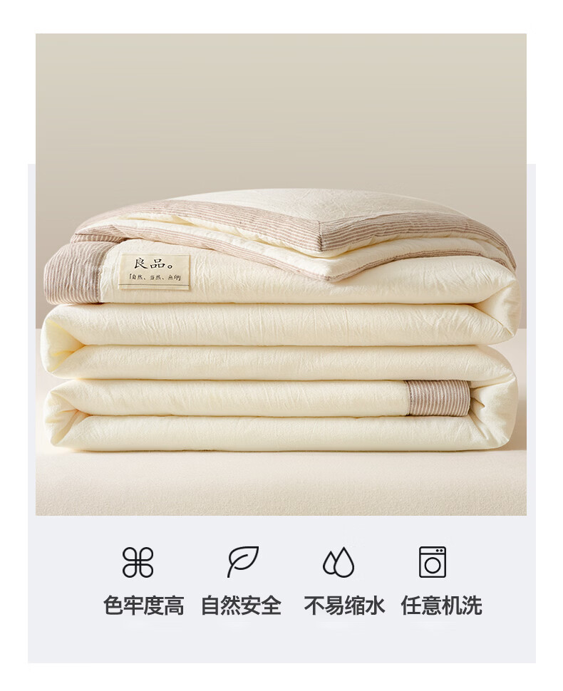 无印风亲肤水洗棉裸肤触感,满足肌肤的柔顺;触感清爽透气耐磨不伤肤四季皆可用享受舒适睡眠;健康舒适纤维,大豆蛋白加工制成媲美羊绒的柔软触感;棉的保暖性,绵软不易结团。