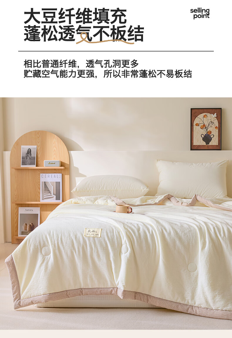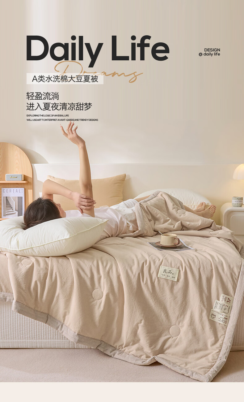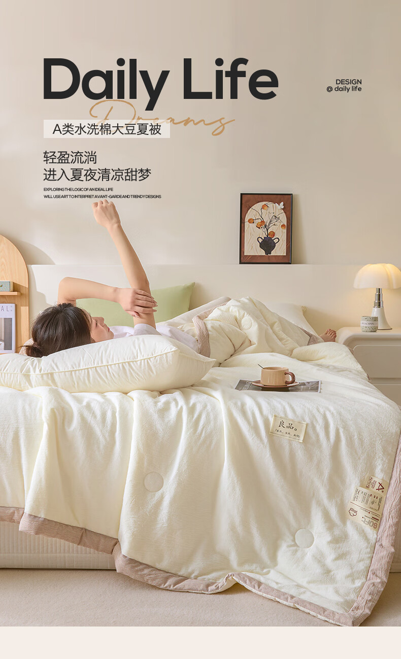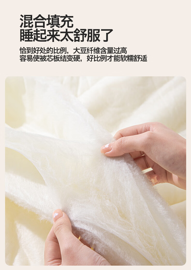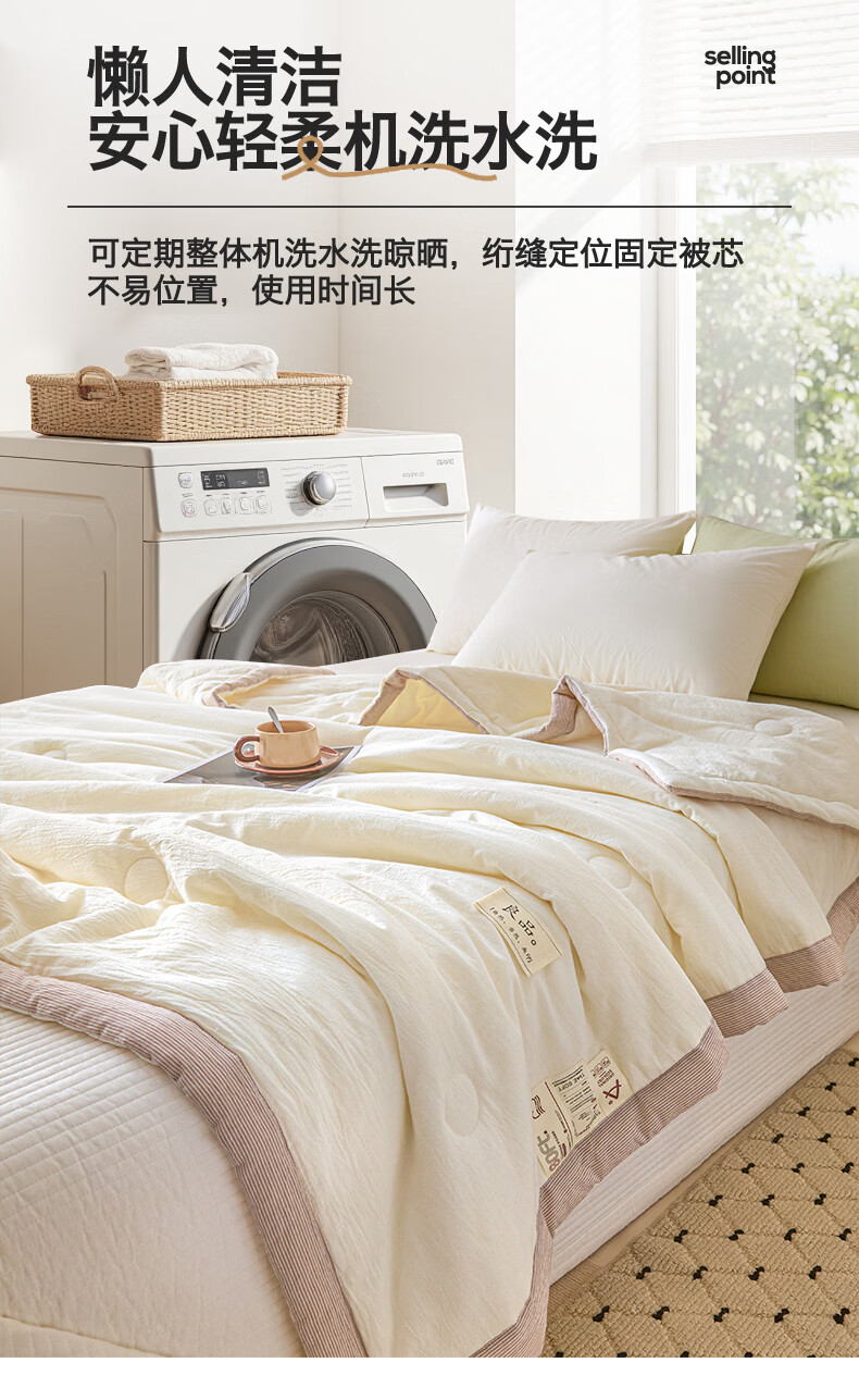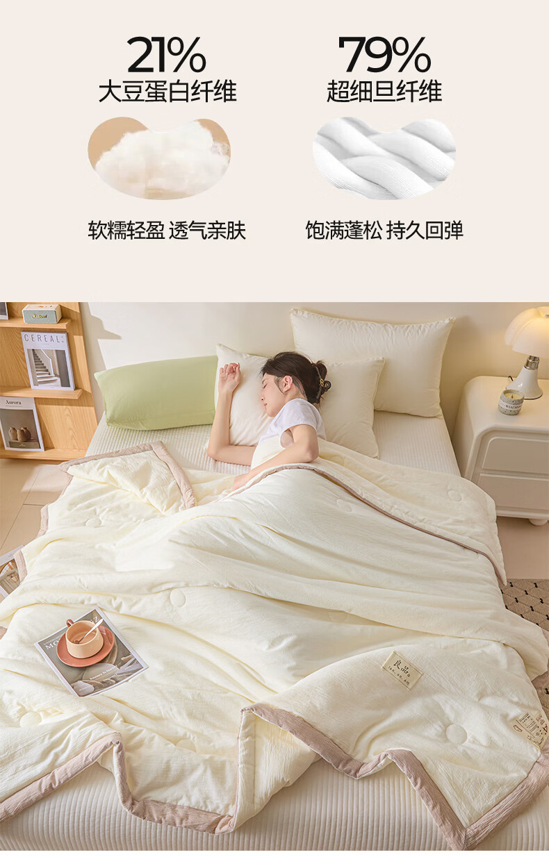 无印风亲肤水洗棉裸肤触感,满足肌肤的柔顺;触感清爽透气耐磨不伤肤四季皆可用享受舒适睡眠;健康舒适纤维,大豆蛋白加工制成媲美羊绒的柔软触感;棉的保暖性,绵软不易结团。