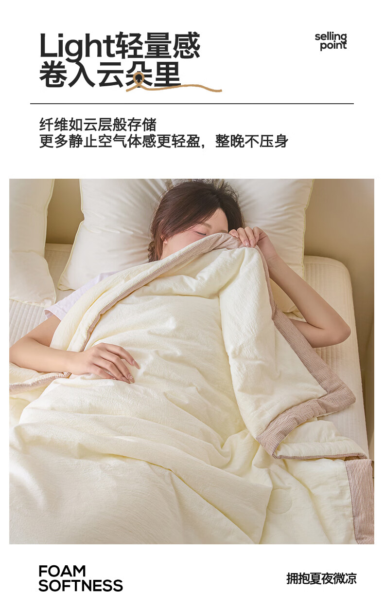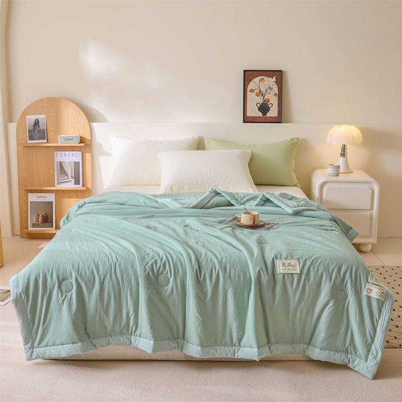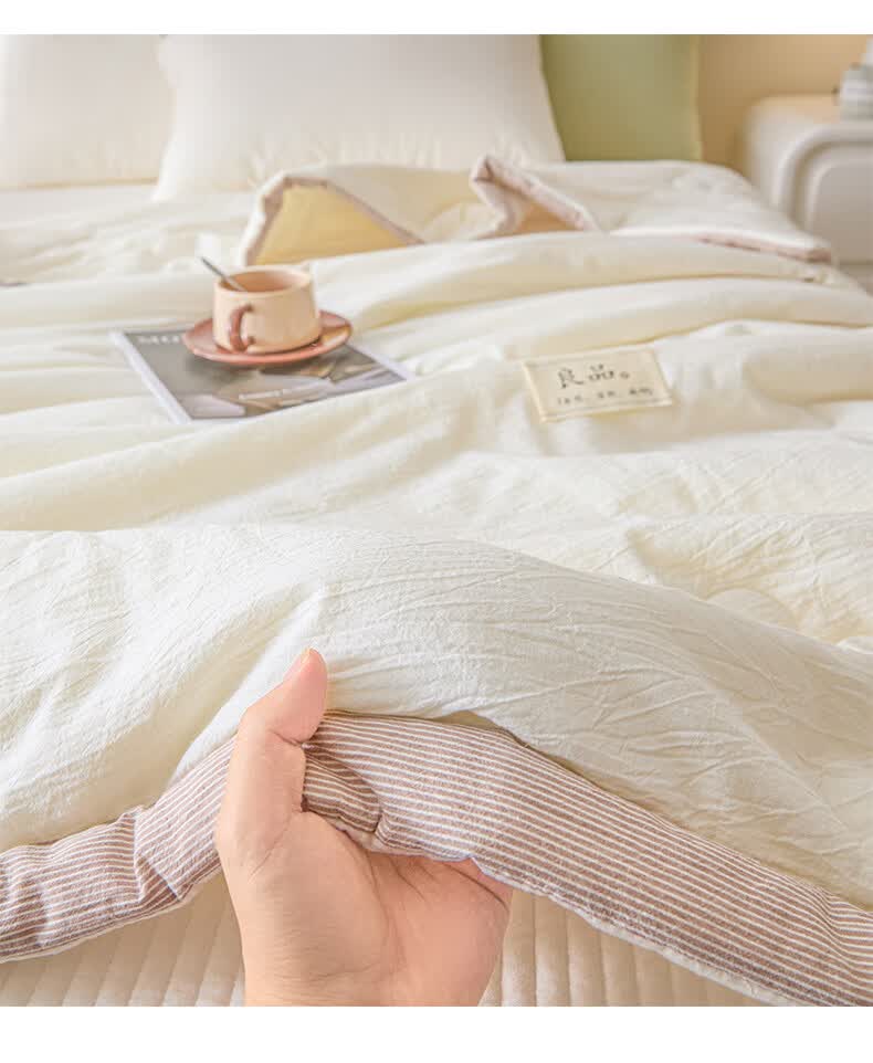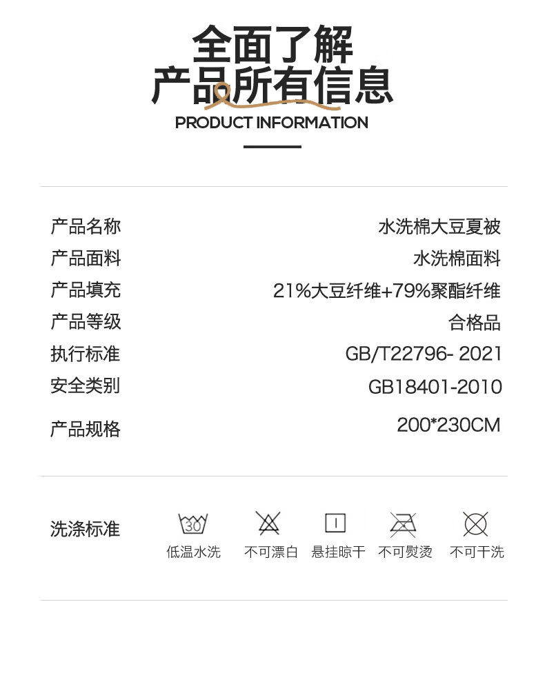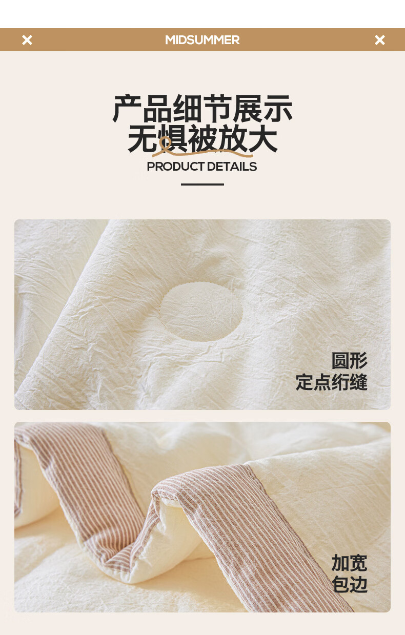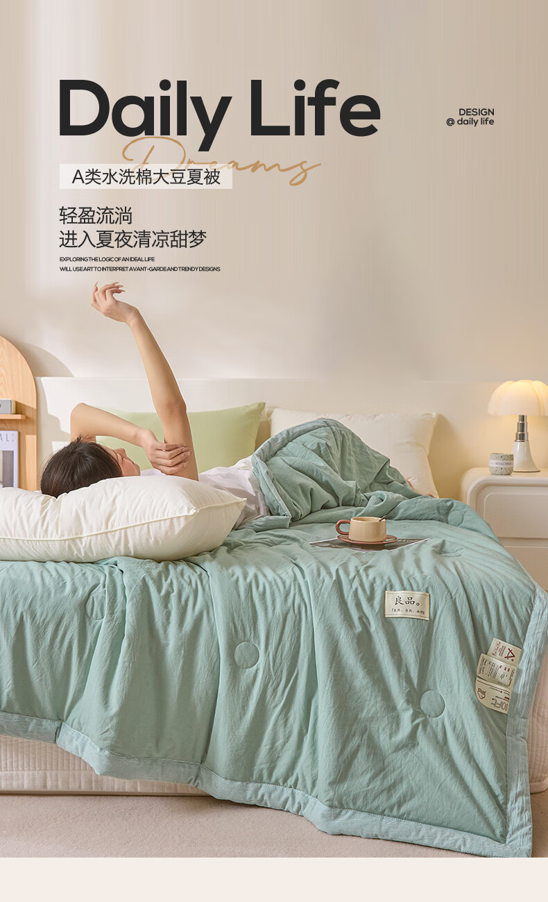 无印风亲肤水洗棉裸肤触感,满足肌肤的柔顺;触感清爽透气耐磨不伤肤四季皆可用享受舒适睡眠;健康舒适纤维,大豆蛋白加工制成媲美羊绒的柔软触感;棉的保暖性,绵软不易结团。