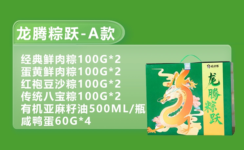 配置:经典鲜肉粽100g*2 蛋黄鲜肉粽100g*2 红袍豆沙粽100g*2 传统八宝粽100g*2 有机亚麻籽油500ml/瓶 高邮咸鸭蛋60g*4