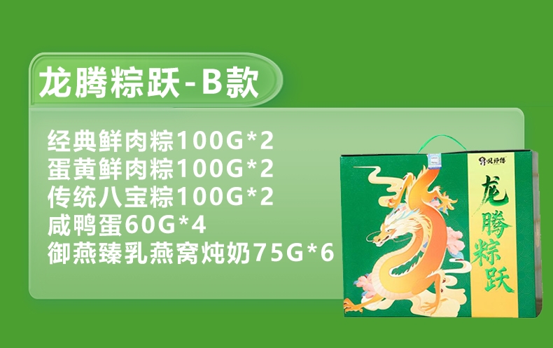配置:经典鲜肉粽100g*2 蛋黄鲜肉粽100g*2 传统八宝粽100g*2 高邮咸鸭蛋60g*4 御燕臻乳燕窝炖奶75g*6