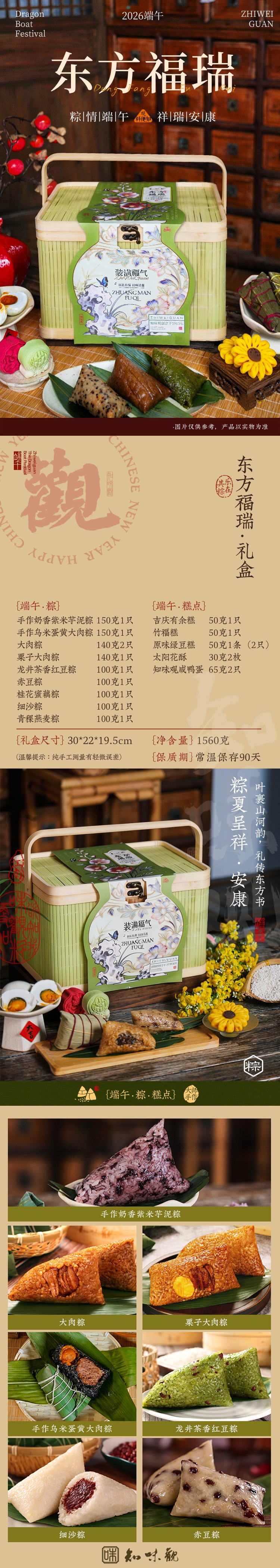 配置清单:150克手作奶香紫米芋泥粽*1只 150克手作乌饭蛋黄大肉粽*1只 140克大肉粽*2 140克栗子大肉粽*1 100克龙井茶香红豆粽*1 100克赤豆粽*1 100克桂花蜜藕粽*1 100克细沙粽*1 100克青稞燕麦粽*1 50克吉庆有余*1 只 50克竹福糕*1只 50克原味绿豆糕*1条(2只) 30克太阳花酥*2枚 65克知味观咸鸭蛋*2只