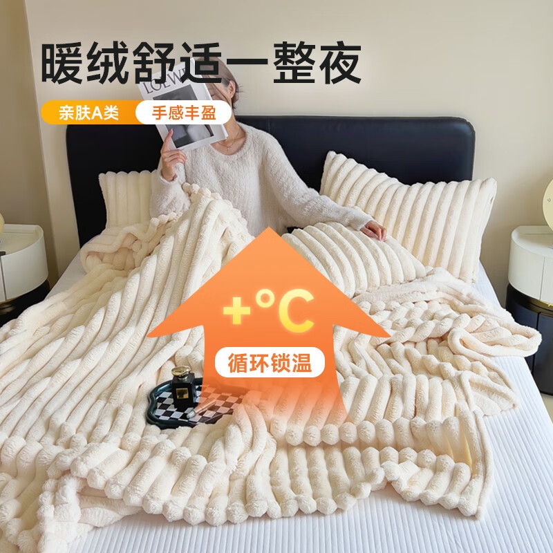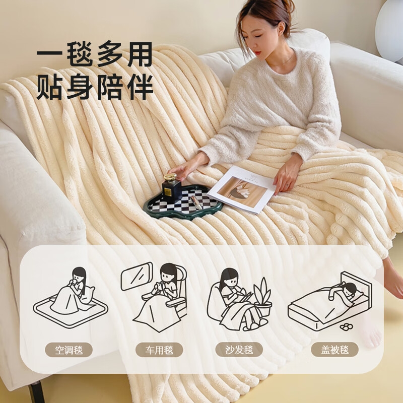 甄选兔毛绒面料,细腻柔软,触感如婴儿肌肤;时尚粗条纹理,集凹凸肌理感、糯感、造型感于一体;亲肤四季多功能盖毯,一毯多用,可铺可盖,得心应手