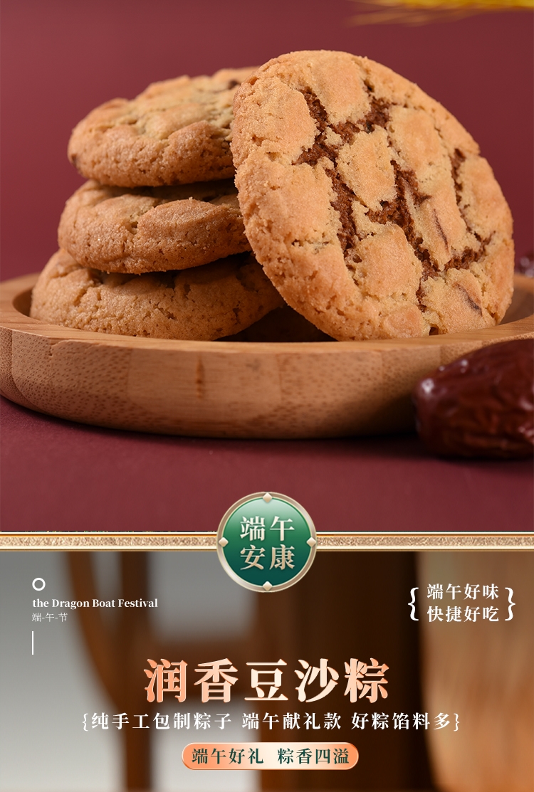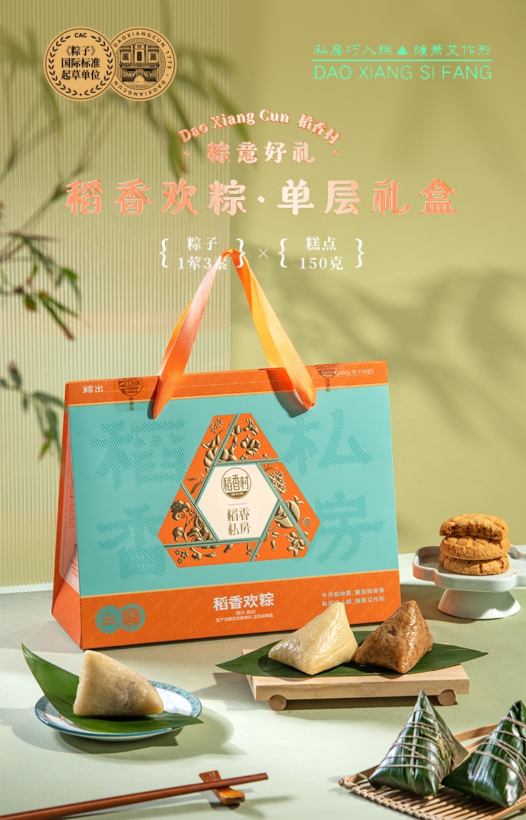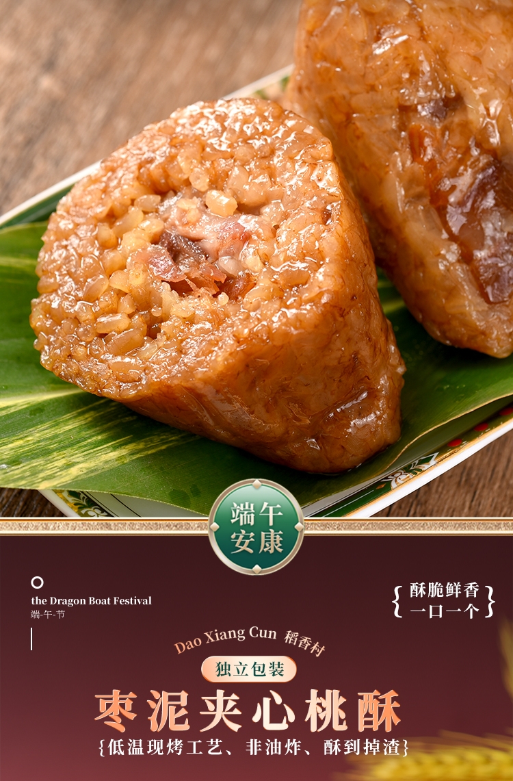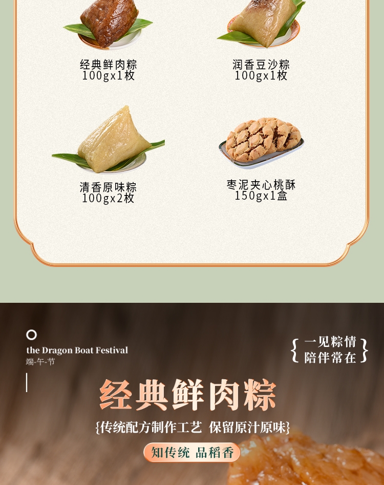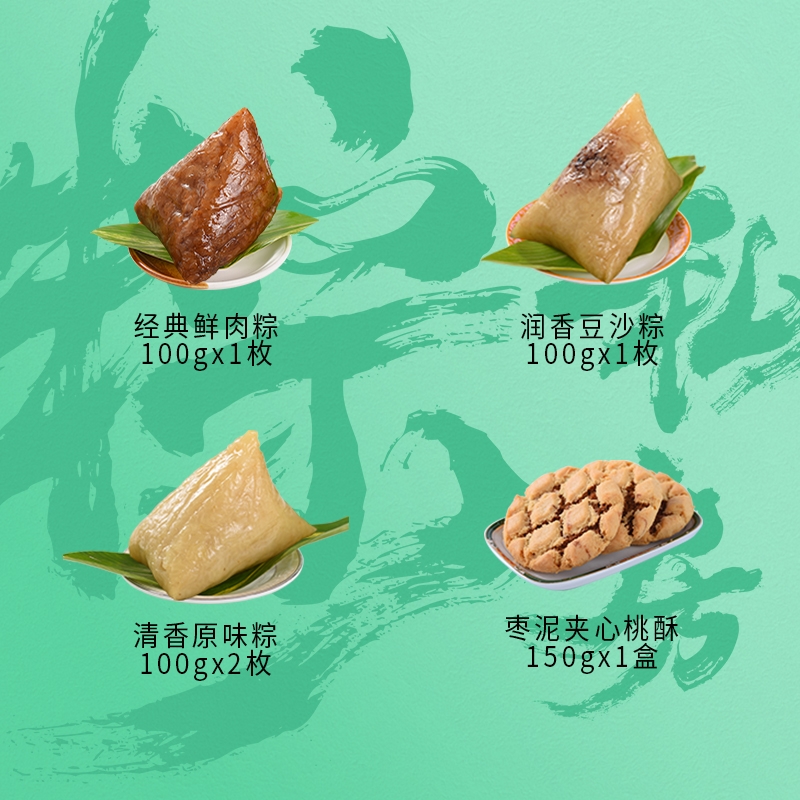 配置:经典鲜肉粽100g*1枚 润香豆沙粽100g*1枚 清香原味粽100g*2枚 枣泥夹心桃酥150g*1盒