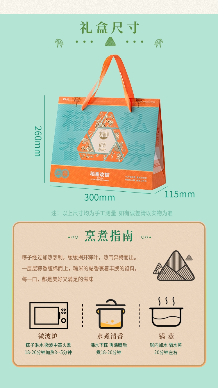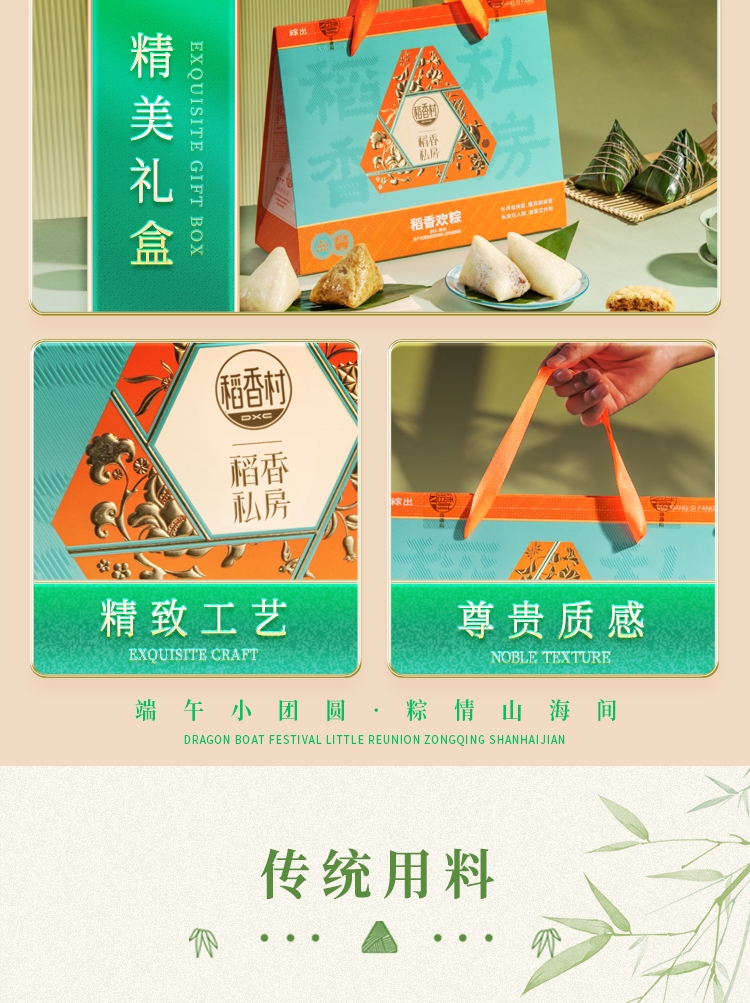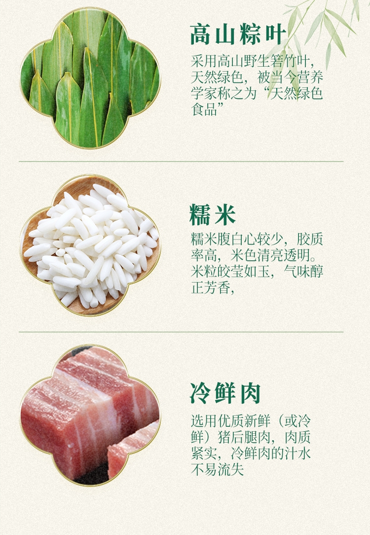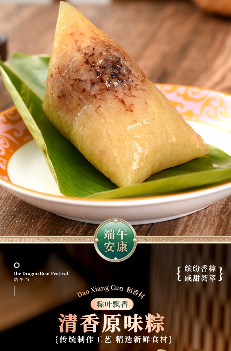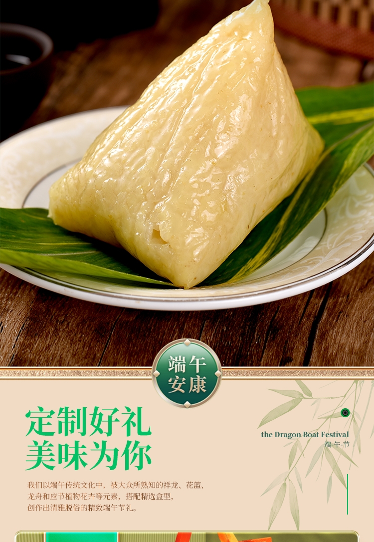 内馅丰富,粒粒饱满 ;端午好味 快捷好吃 ;缤纷鲜粽 咸甜荟萃 ;精致工艺 尊贵质感