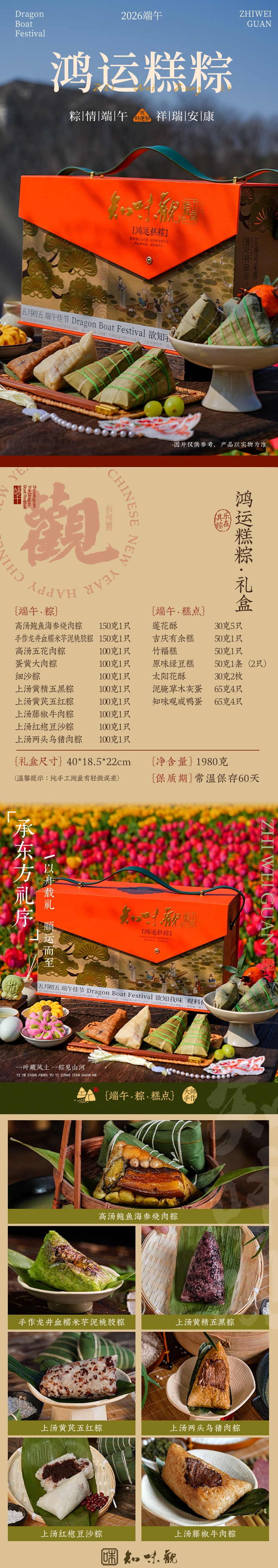 配置清单:150克高汤鲍鱼海参烧肉粽*1只 150克手作龙井血糯米芋泥桃胶粽*1 100克高汤五花肉粽*1 100克蛋黄大肉粽*1 100克细沙粽*1 100克上汤黄精五黑粽*1只 100克上汤黄芪五红粽*1只 100克上汤藤椒牛肉粽*1只 100克上汤红袍豆沙粽*1只 100克上汤两头乌猪肉粽*1只 莲花酥30克*5只 50克吉庆有余*1 只 50克竹福糕*1只 50克原味绿豆糕*1条(2只) 30克太阳花酥*2枚 65克泥腌草木灰蛋*4只 65克知味观咸鸭蛋*4只