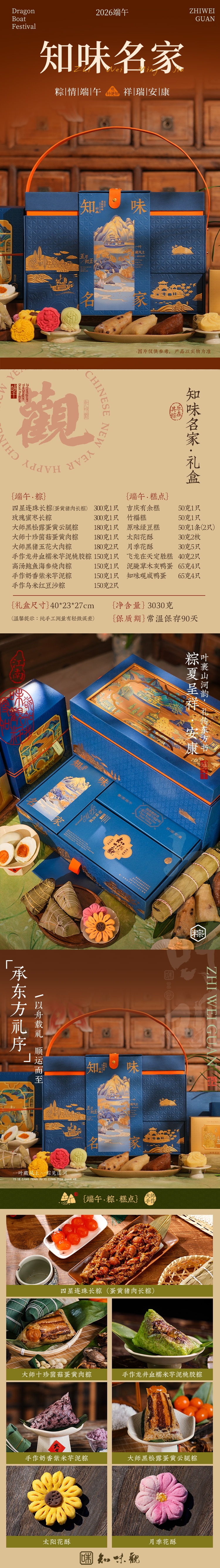 配置清单:300克四星连珠长粽(蛋黄猪肉长粽)*1只 300克玫瑰蜜枣长粽*1只 180克大师黑松露蛋黄云腿粽*1只 180克大师十珍菌菇蛋黄肉粽*1只 180克大师黑猪五花大肉粽*2只 150克手作龙井血糯米芋泥桃胶粽*1只 150克高汤鲍鱼海参烧肉粽*1只 150克手作奶香紫米芋泥粽*1只 150克手作乌饭红豆沙粽*2只 50克吉庆有余*1 只 50克竹福糕*1只 50克原味绿豆糕*1条(2只) 30克太阳花酥*2枚 30克月季花酥*5枚 40克飞龙在天定胜糕*2 65克泥腌草木灰鸭蛋*4只 65克知味观咸鸭蛋*4只