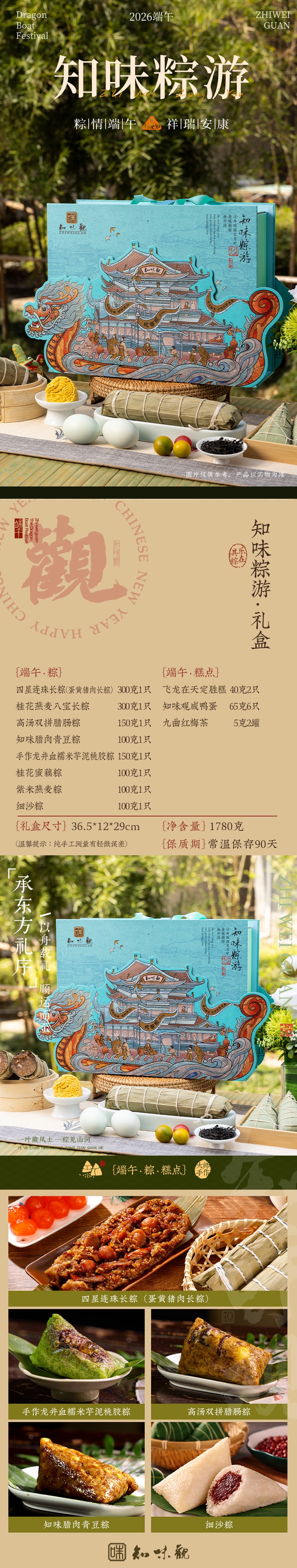 配置清单:300克四星连珠长粽(蛋黄猪肉长粽)*1 300克桂花燕麦八宝长粽*1 150克高汤双拼腊肠粽*1 100克知味腊肉青豆粽*1 150克手作龙井血糯米芋泥桃胶粽*1 100克桂花蜜藕粽*1 100克紫米燕麦粽*1 100克细沙粽*1 40克飞龙在天定胜糕*2只 65克知味观咸鸭蛋*6只 5克九曲红梅茶*2罐