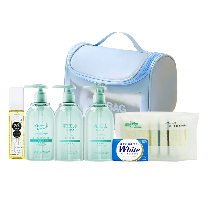 配置清单:1.花王护发洗发露220ml*1 2.花王香氛沐浴露220ml*1 3.花王护发素220ml*1 4.花王牛奶香氛香皂130g*1(颜色随机) 5.洁丽雅毛巾73*34cm*1(封口袋包装 颜色随机) 6.龙虎花露水90ml*1 7.大容量防水旅行洗漱包