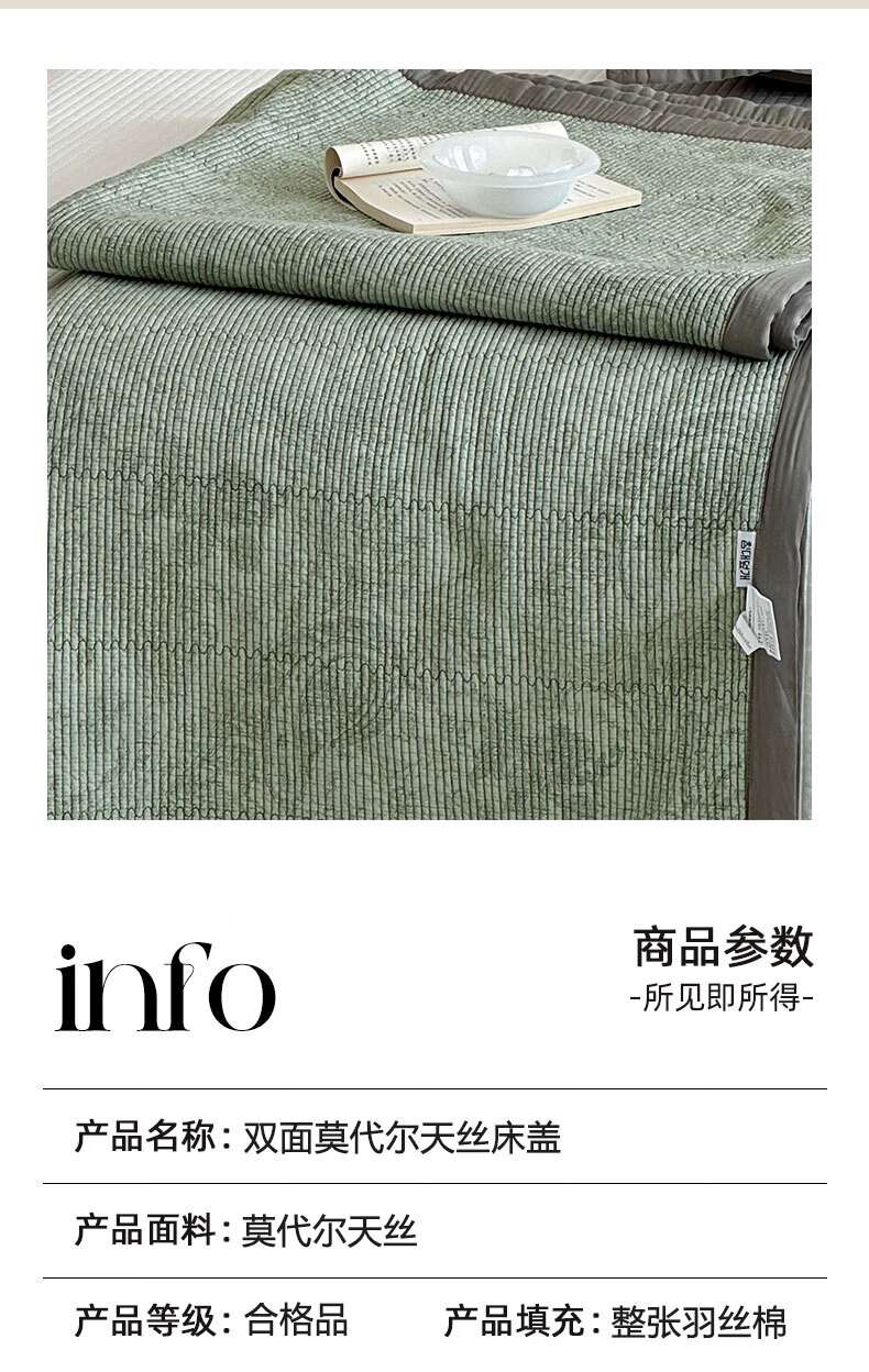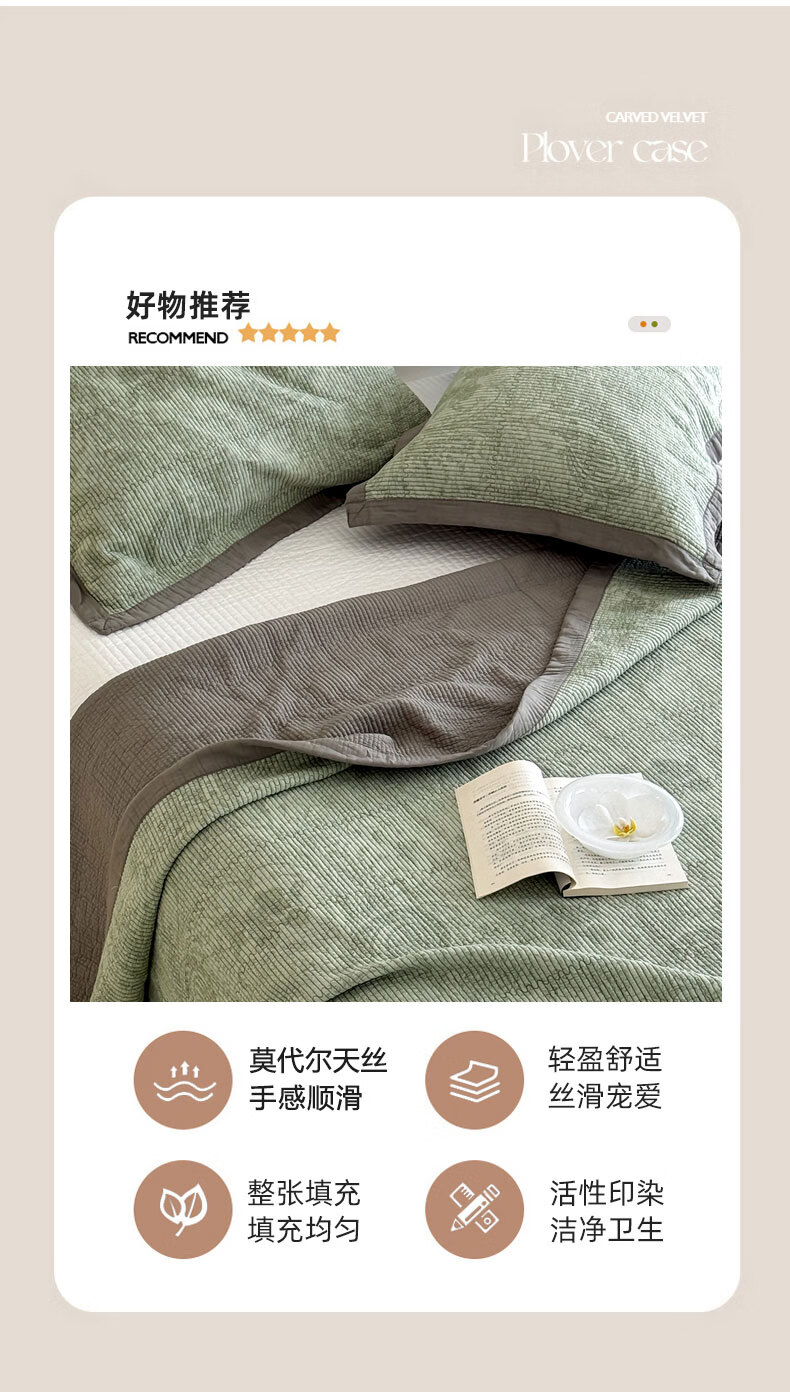 甄选莫代尔面料织造,丝滑细腻,手感柔软,;裸睡无拘无束,呵护肌肤。可铺可垫,功能多用,;80%棉花纤维填充,蓬松舒适,有效防止填充物变形;低饱和度色系搭配凸显画面层次感格调感,瞬间提升质感;