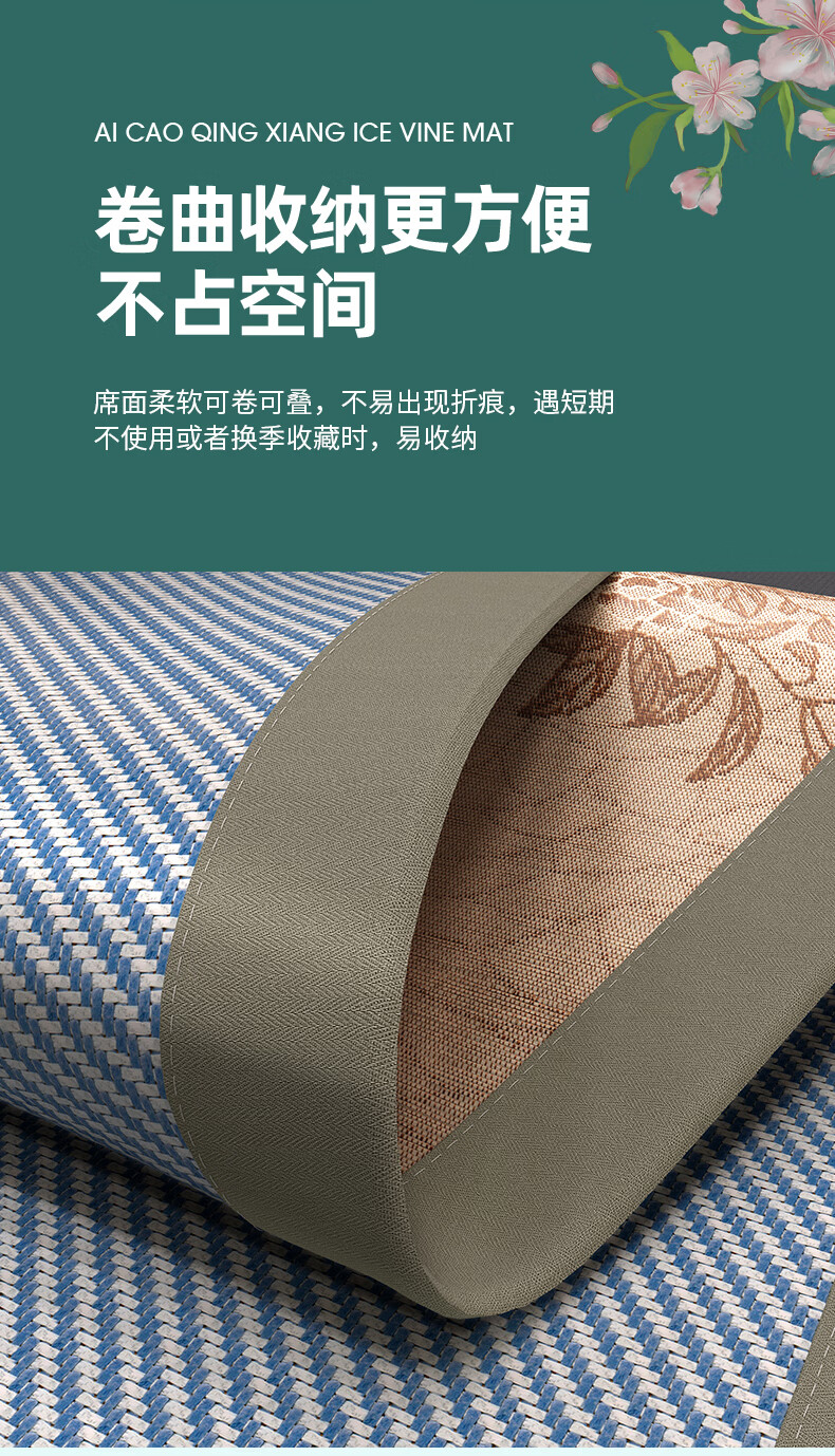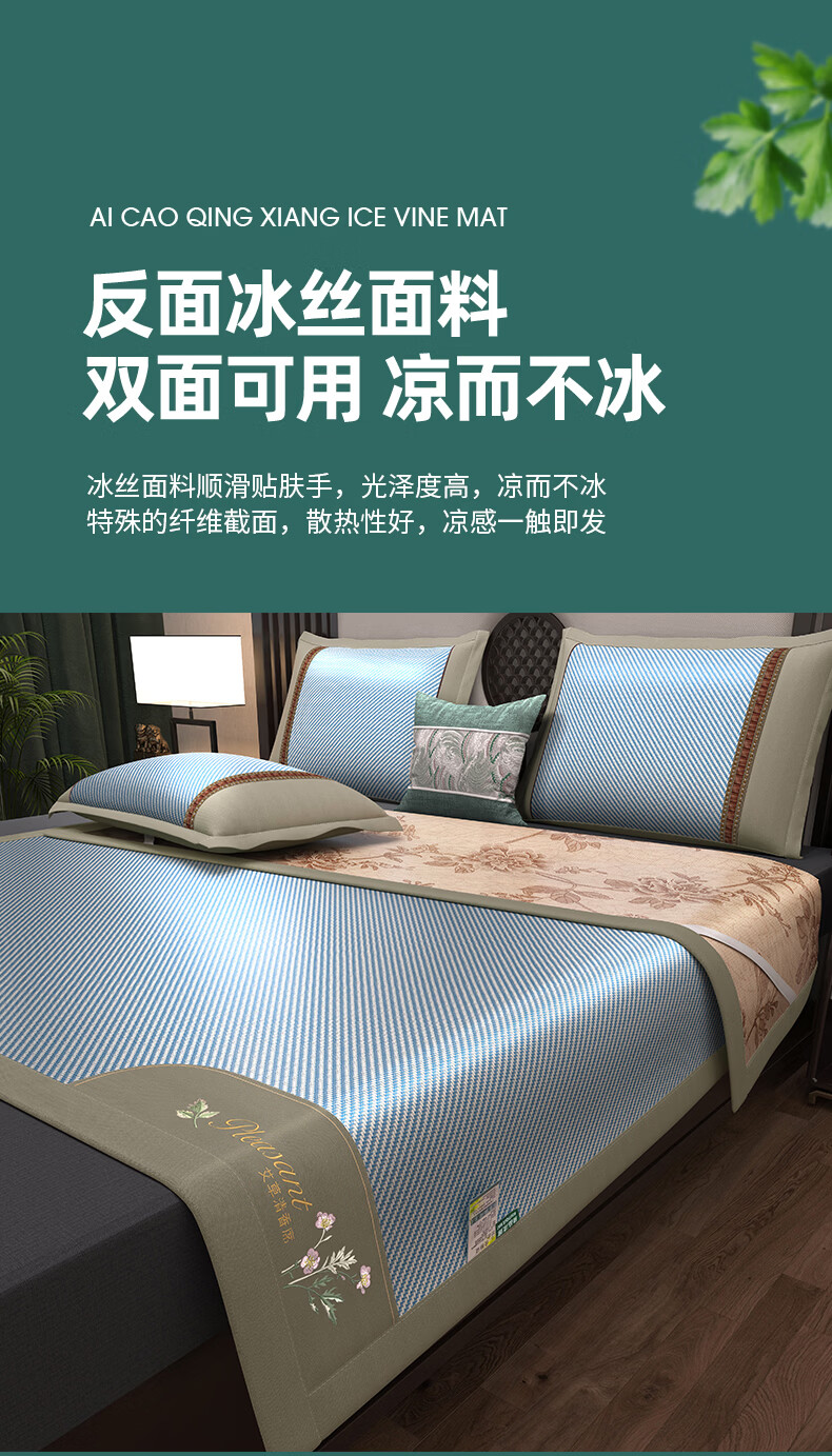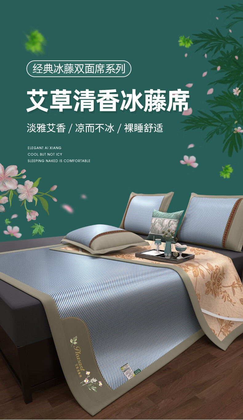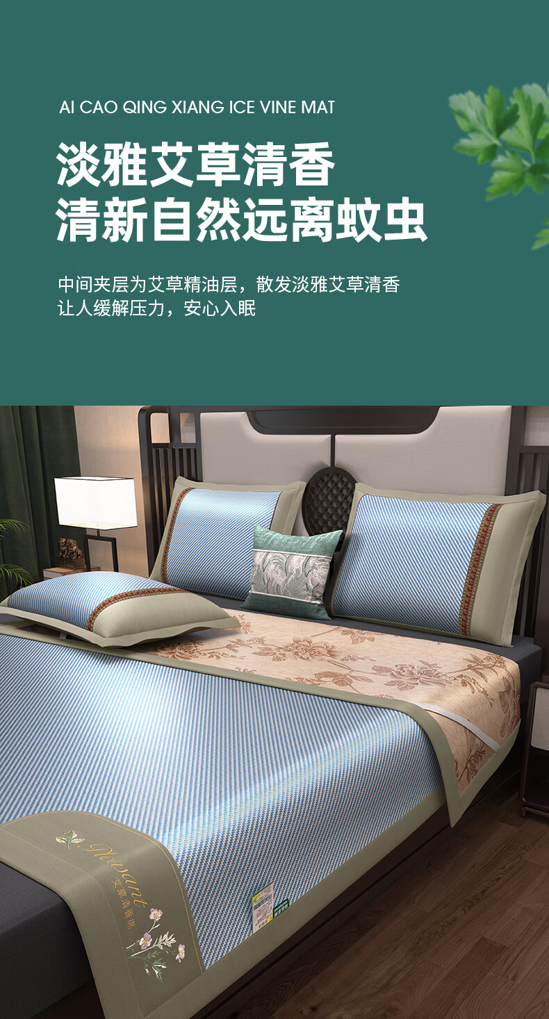 凉席正面天然艾草因子配搭凉感藤条纤维面料;采用藤草粉碎打成浆,高温高压多道复杂工序加工成条;加密编织而成,舒适凉爽。高密度编织工艺经纬交织席面;光滑无毛刺水质感细腻柔顺睡醒身上没有压痕。