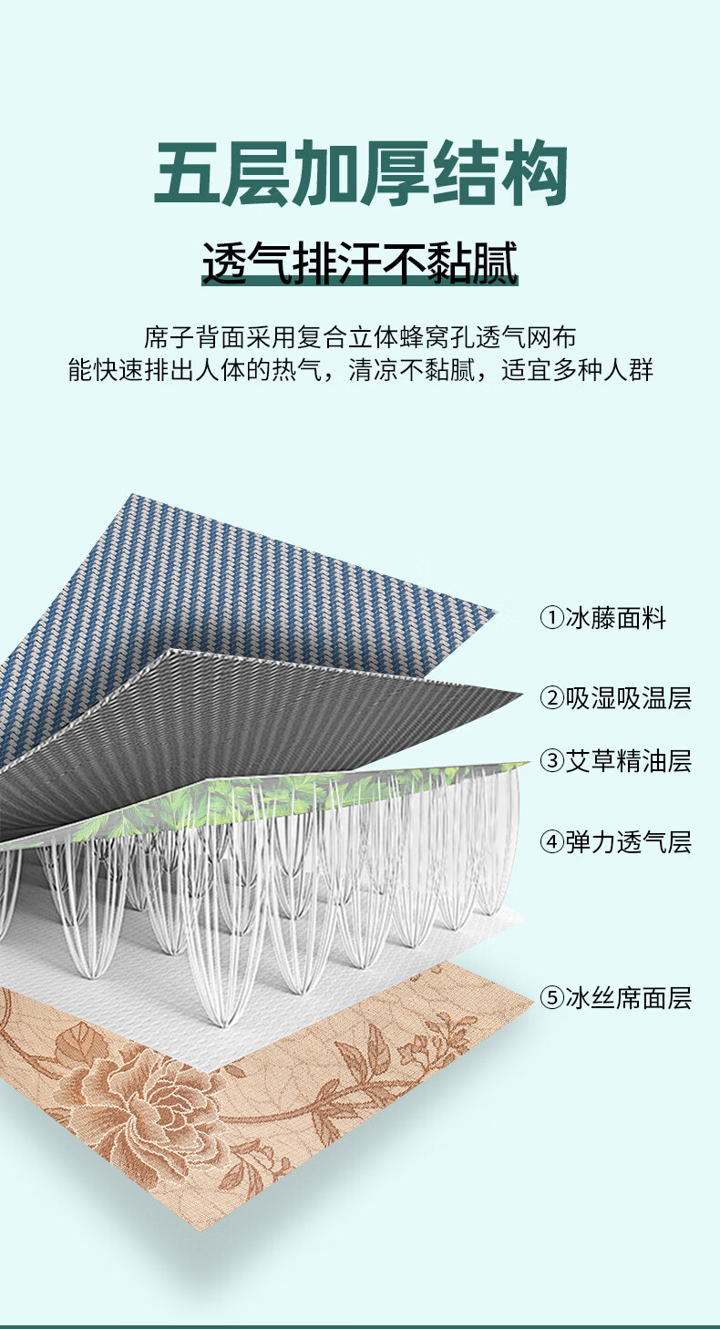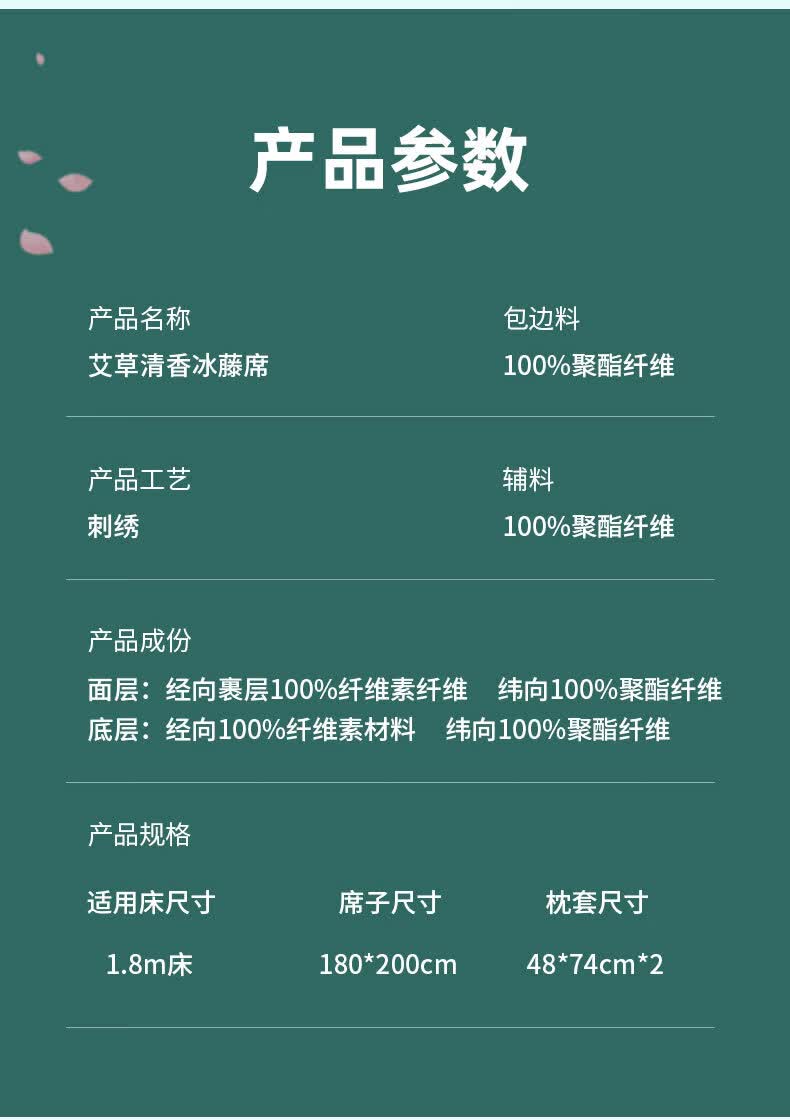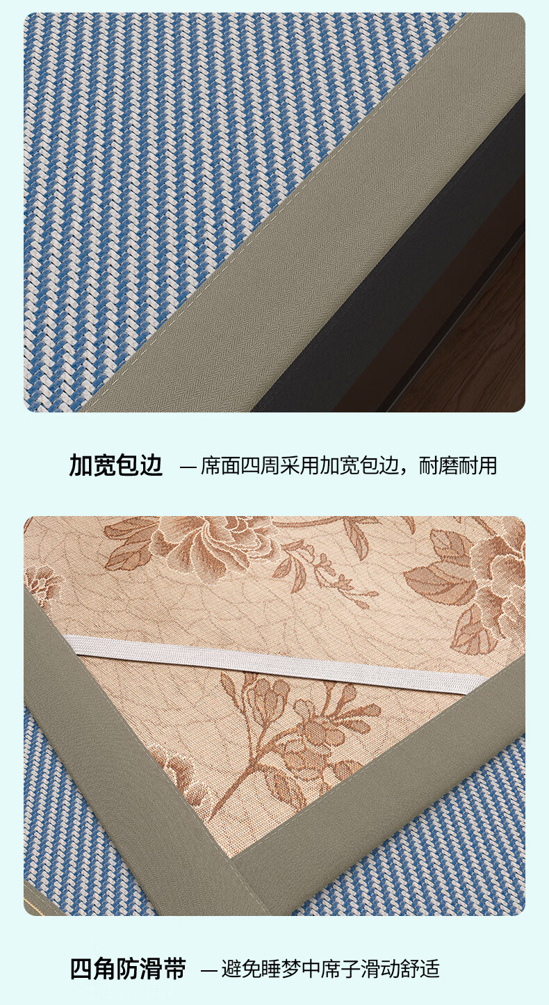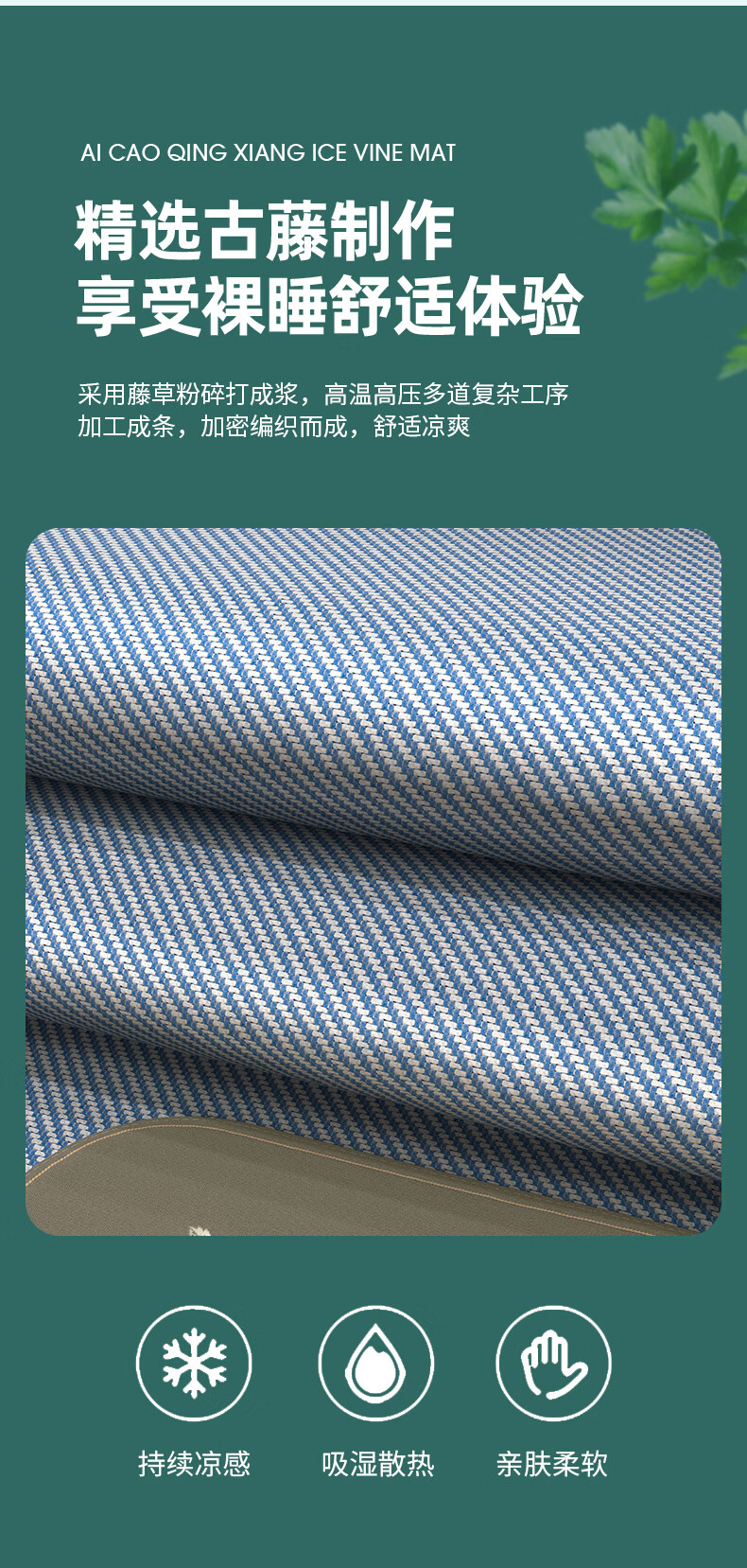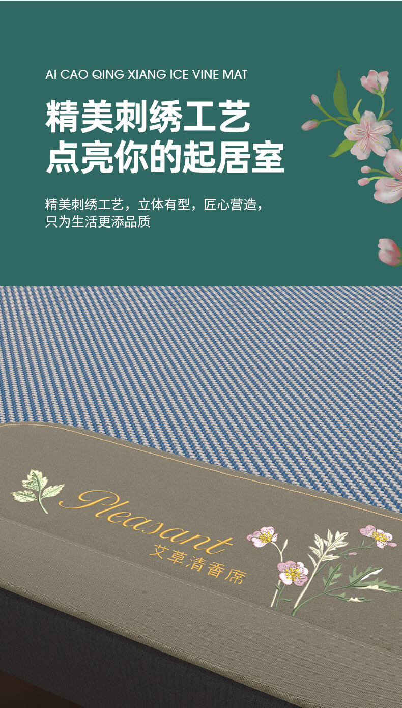 凉席正面天然艾草因子配搭凉感藤条纤维面料;采用藤草粉碎打成浆,高温高压多道复杂工序加工成条;加密编织而成,舒适凉爽。高密度编织工艺经纬交织席面;光滑无毛刺水质感细腻柔顺睡醒身上没有压痕。
