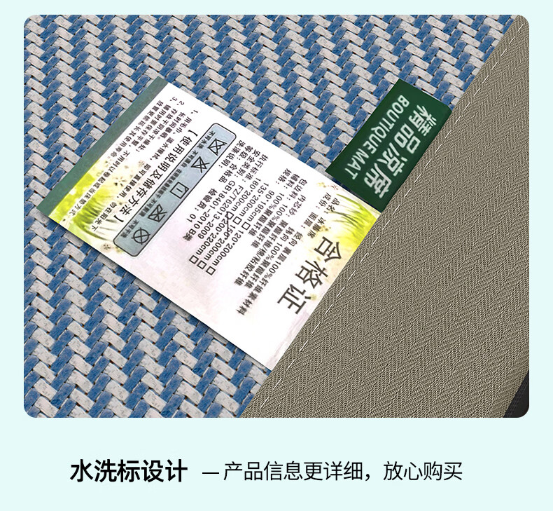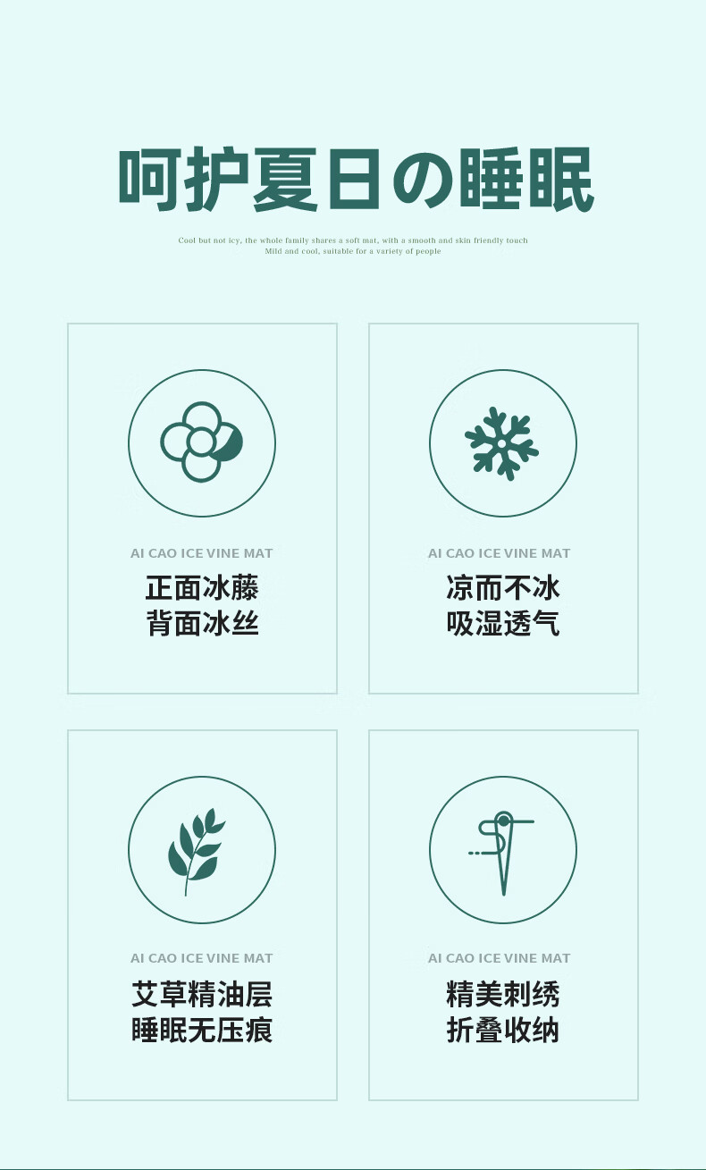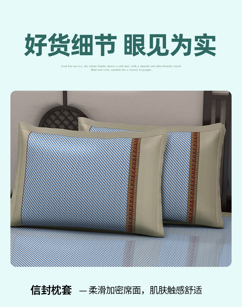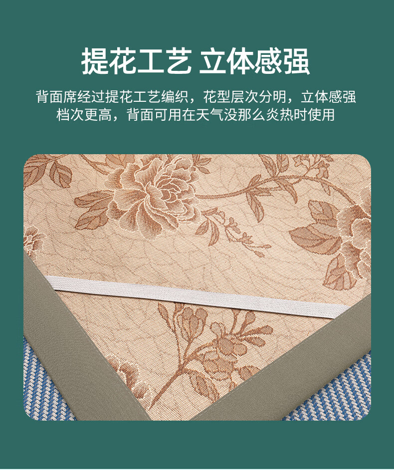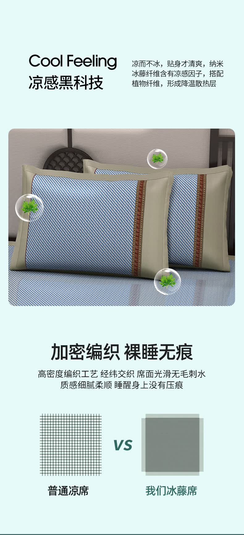 凉席正面天然艾草因子配搭凉感藤条纤维面料;采用藤草粉碎打成浆,高温高压多道复杂工序加工成条;加密编织而成,舒适凉爽。高密度编织工艺经纬交织席面;光滑无毛刺水质感细腻柔顺睡醒身上没有压痕。