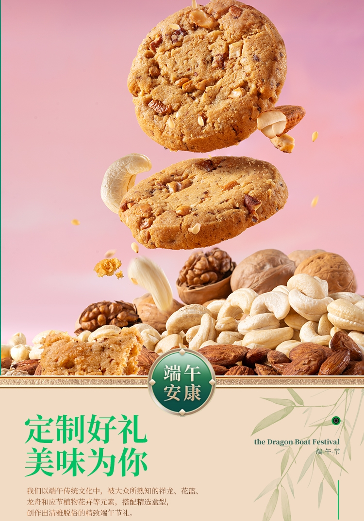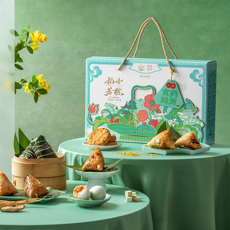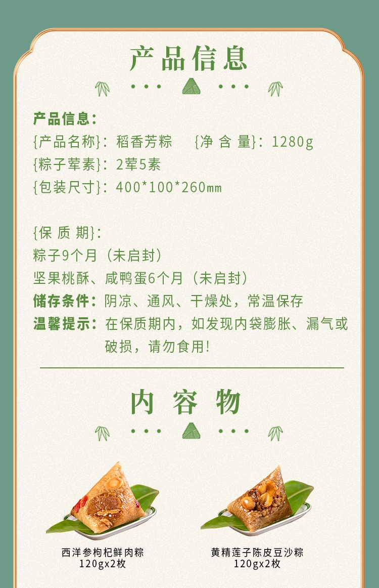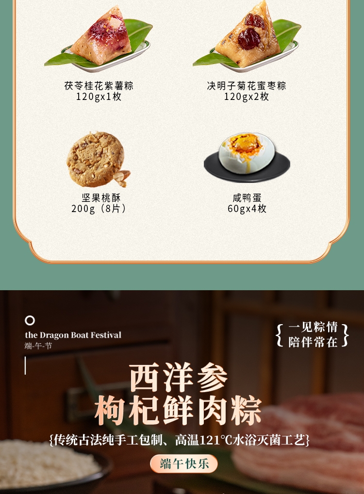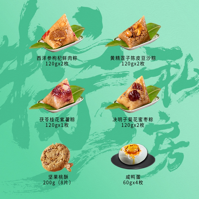 配置:西洋参枸杞鲜肉粽120g*2枚 黄精莲子陈皮豆沙粽120g*2枚 决明子菊花蜜枣粽120g*2枚 茯苓桂花紫薯粽120g*1枚 坚果桃酥200g(8片) 咸鸭蛋240g(1盒)