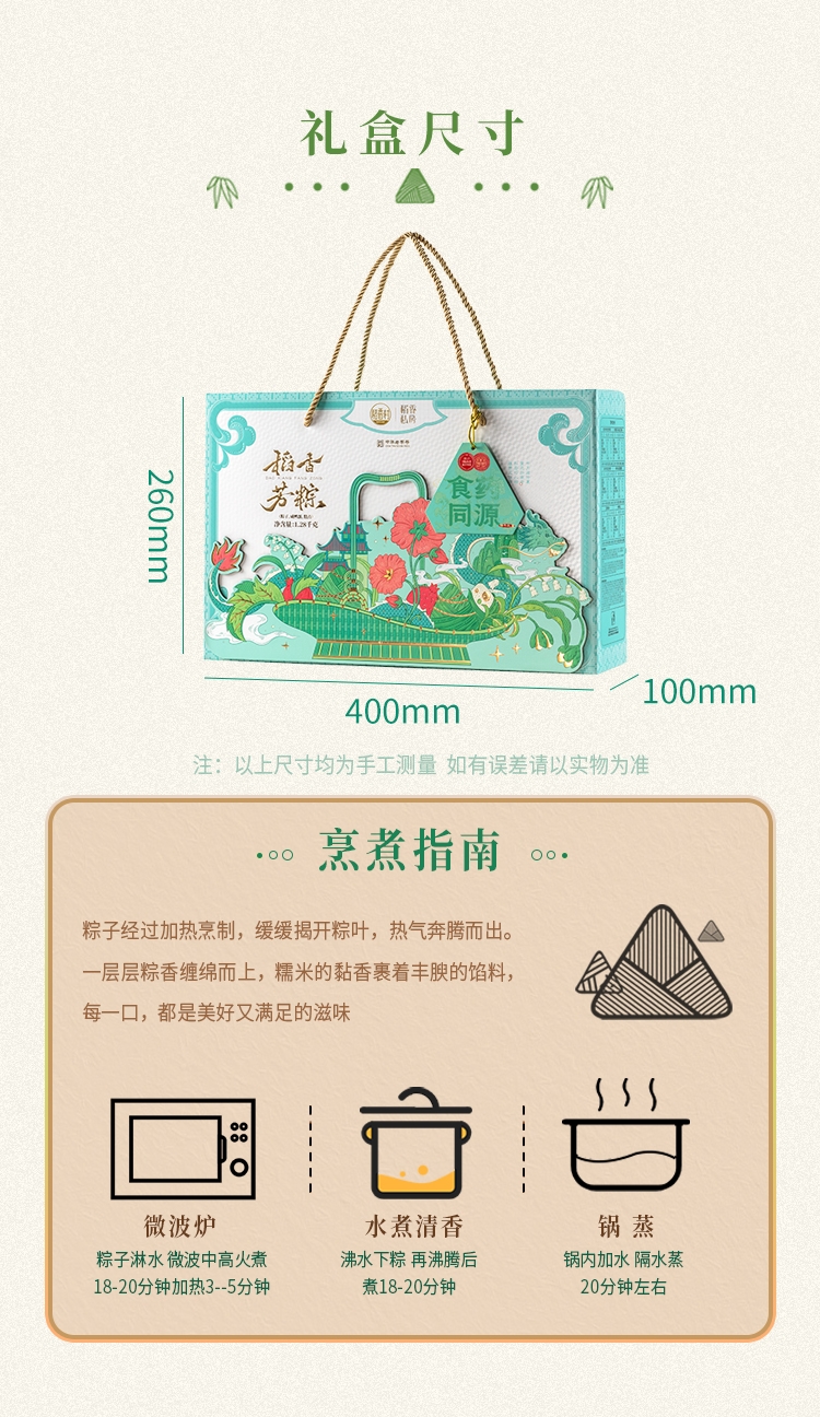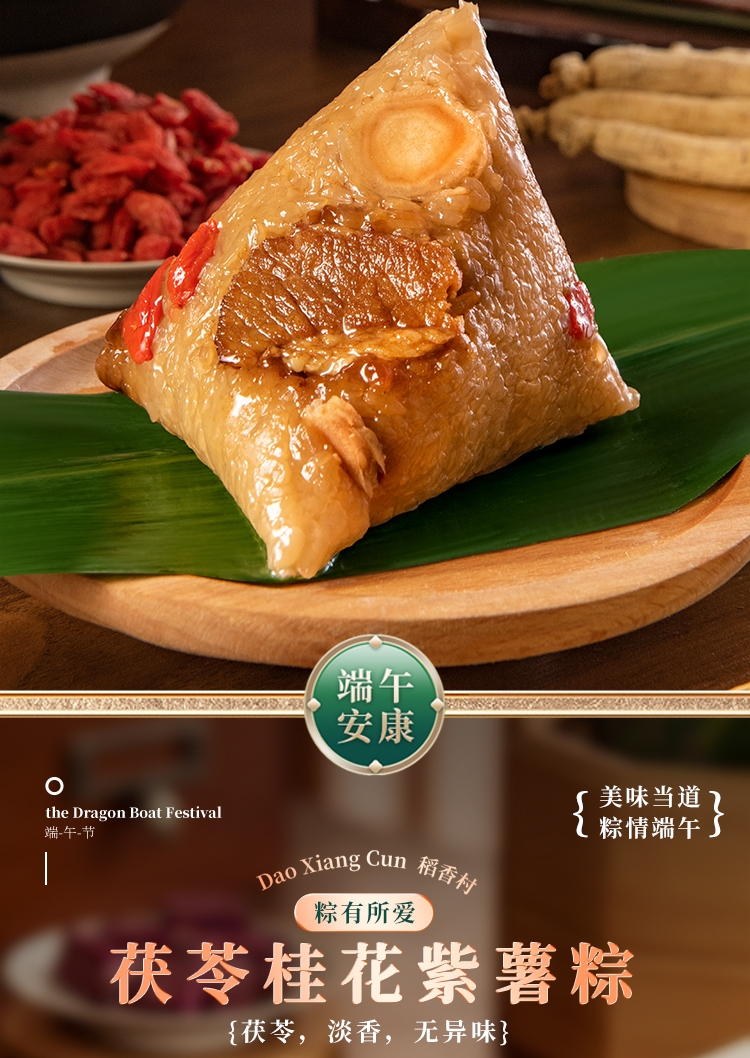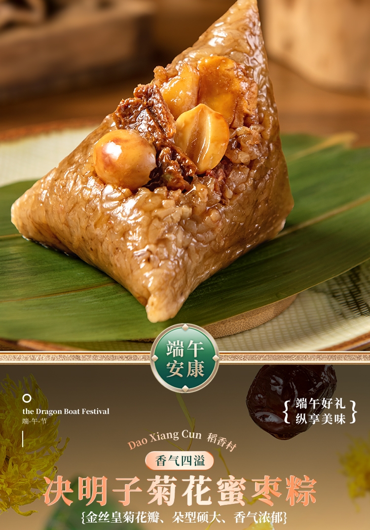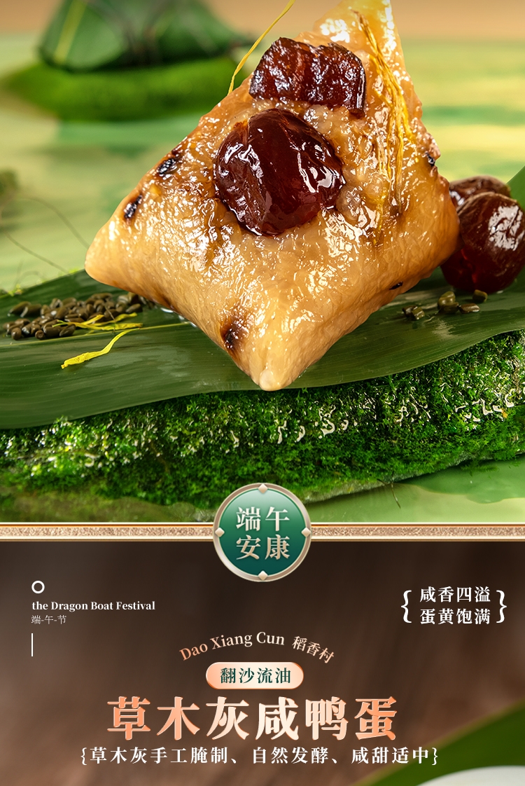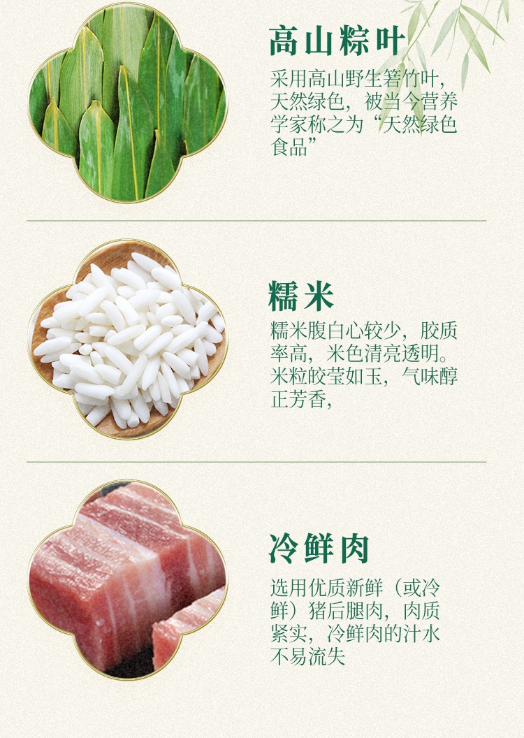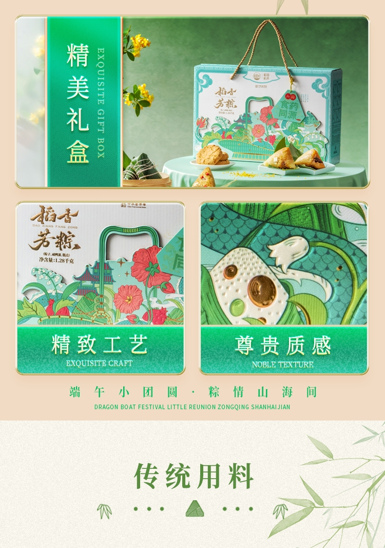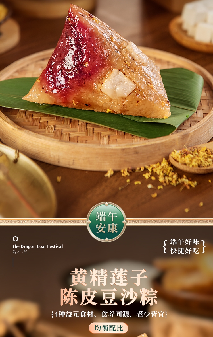 内馅丰富,粒粒饱满 端午好味 快捷好吃;缤纷鲜粽 咸甜荟萃 ;精致工艺 尊贵质感