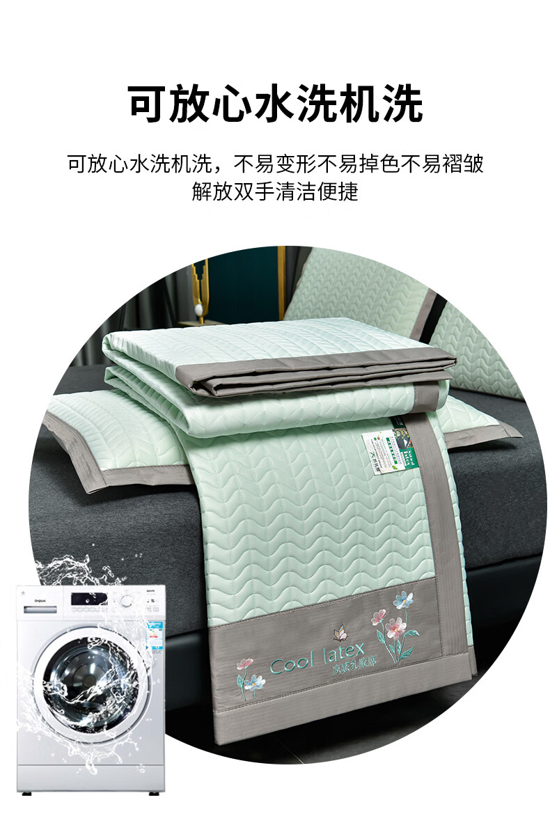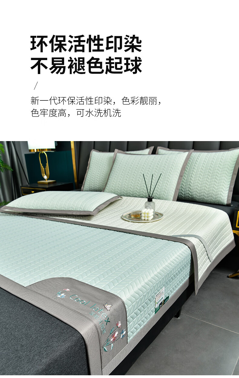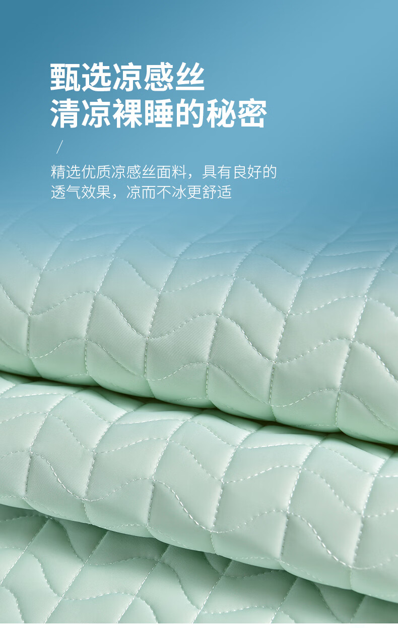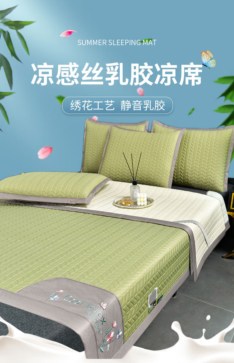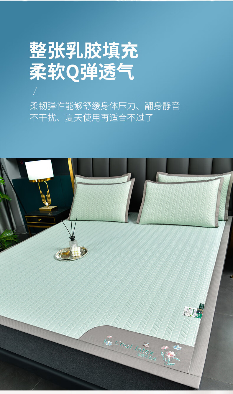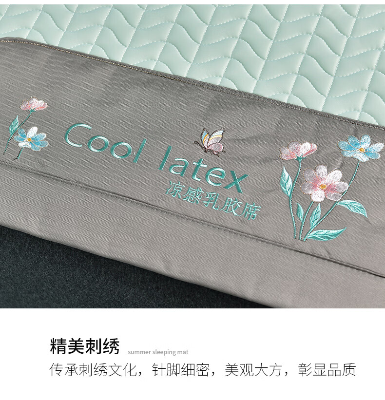 凉感丝面料,凉而不冰,乳胶填充,环保印染,;刺绣工艺,支持机洗。席面光滑,适合裸睡,透气凉爽;整张乳胶填充柔软Q弹透气;柔韧弹性能够舒缓身体压力、翻身静音不干扰
