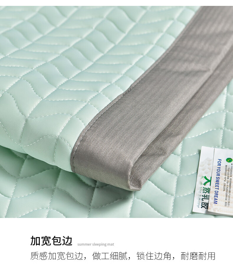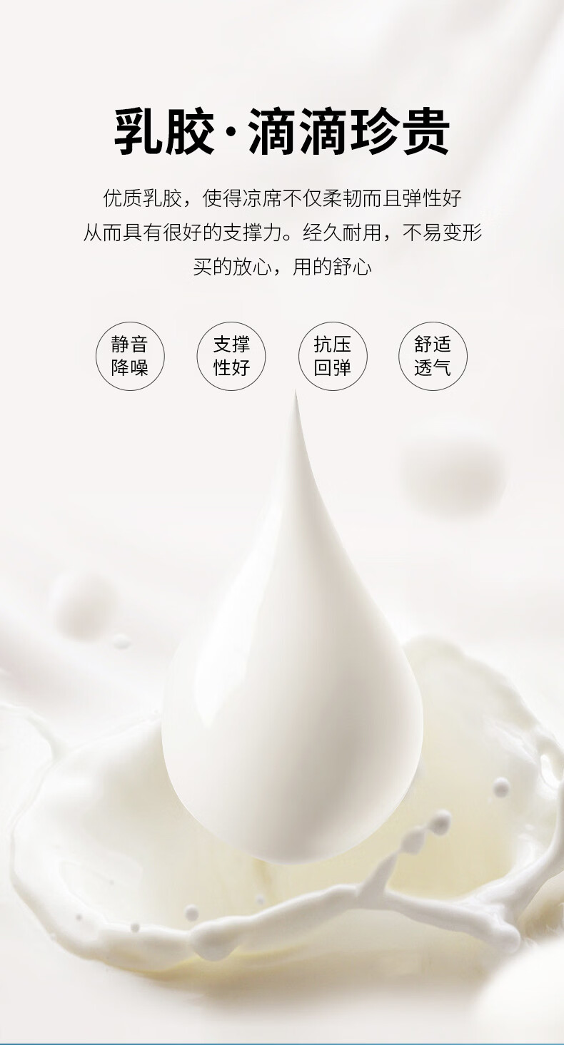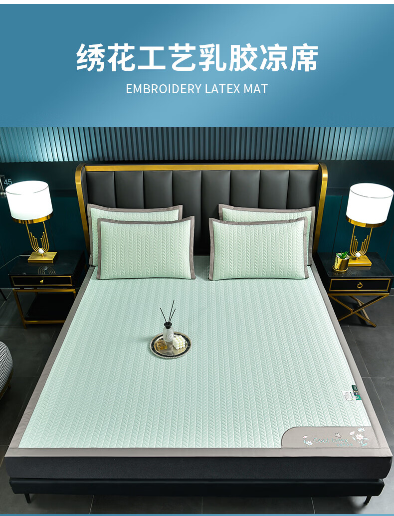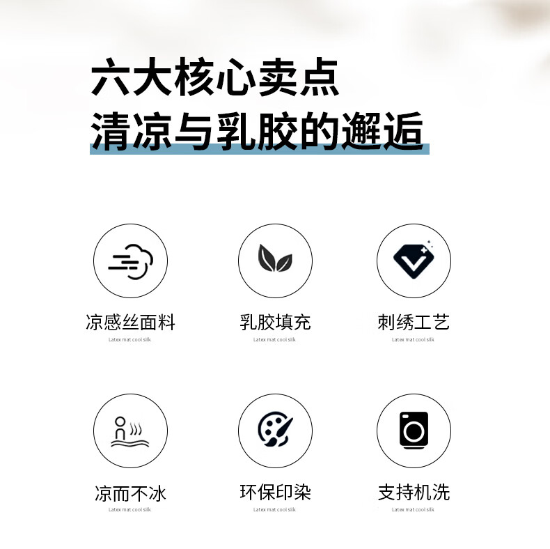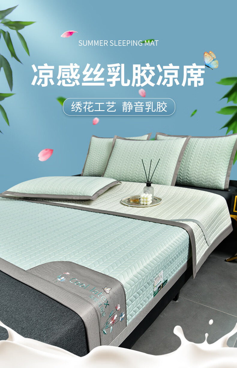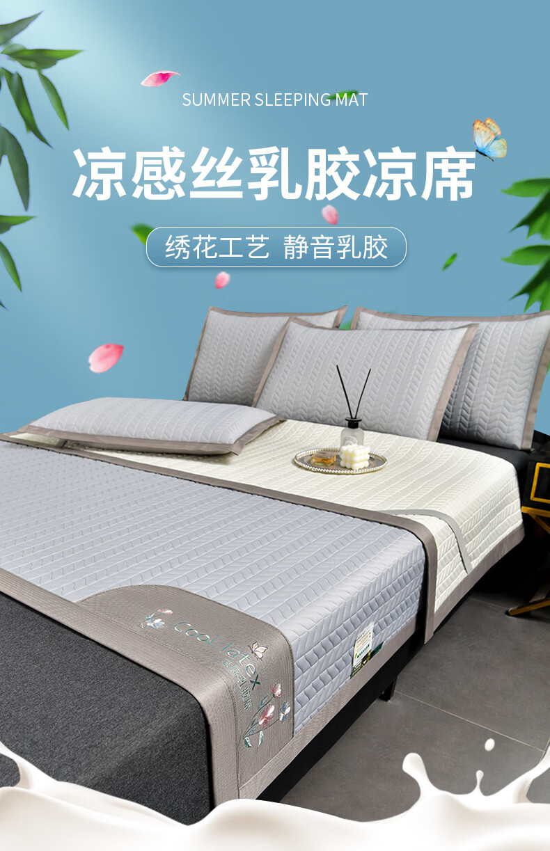 凉感丝面料,凉而不冰,乳胶填充,环保印染,;刺绣工艺,支持机洗。席面光滑,适合裸睡,透气凉爽;整张乳胶填充柔软Q弹透气;柔韧弹性能够舒缓身体压力、翻身静音不干扰