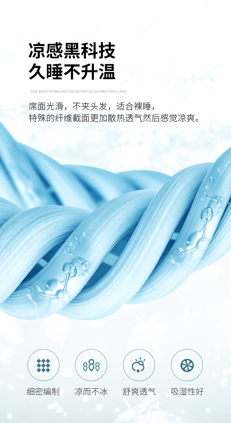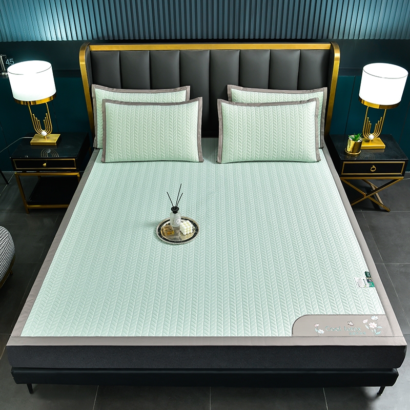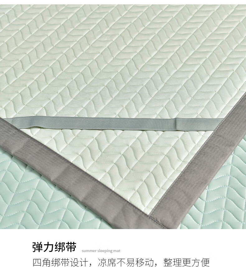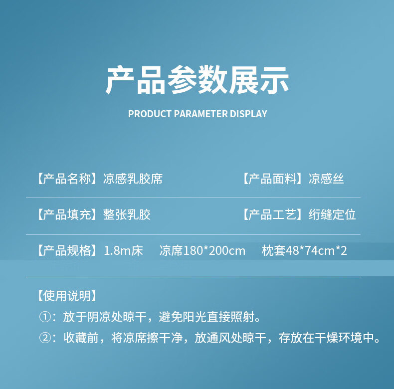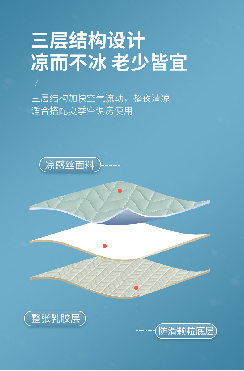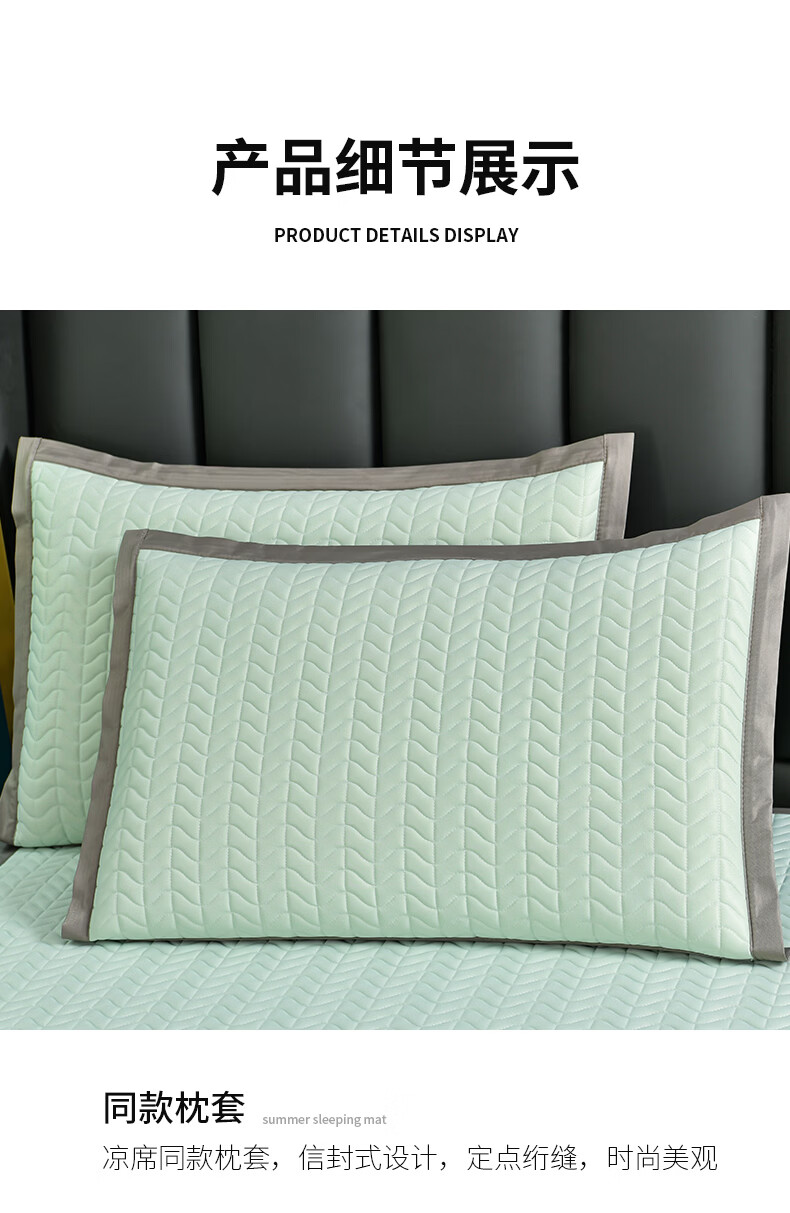 凉感丝面料,凉而不冰,乳胶填充,环保印染,;刺绣工艺,支持机洗。席面光滑,适合裸睡,透气凉爽;整张乳胶填充柔软Q弹透气;柔韧弹性能够舒缓身体压力、翻身静音不干扰