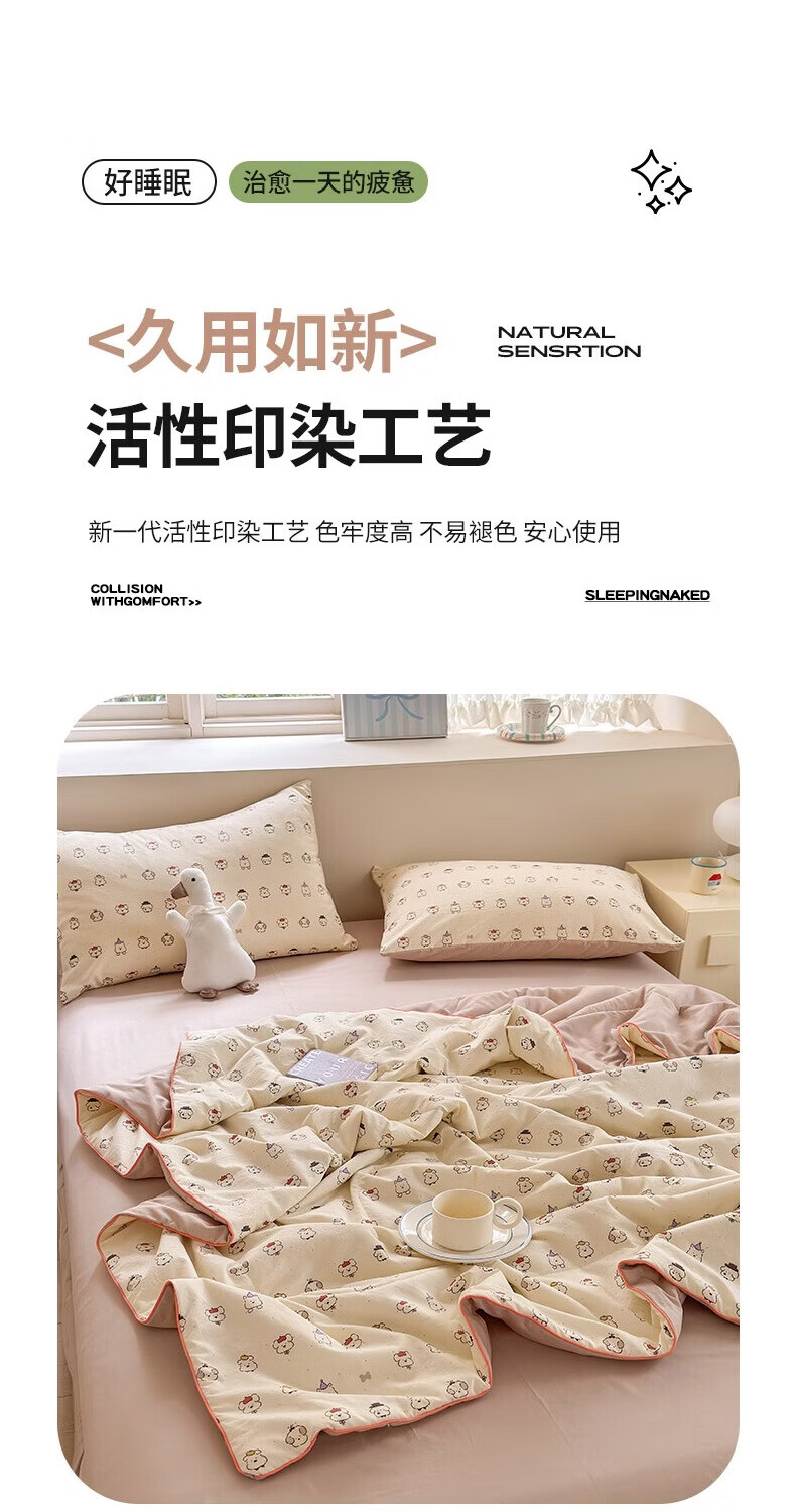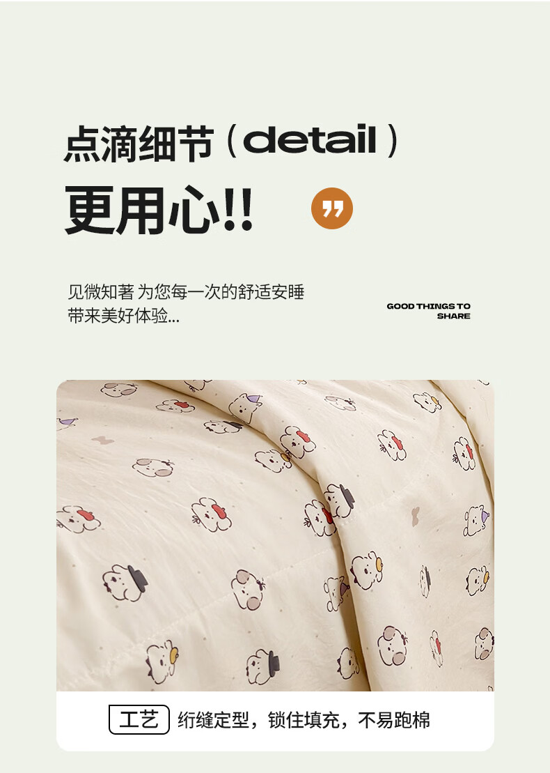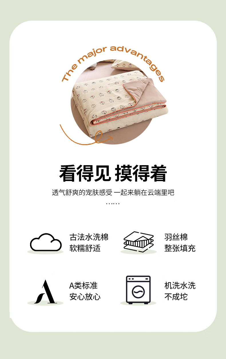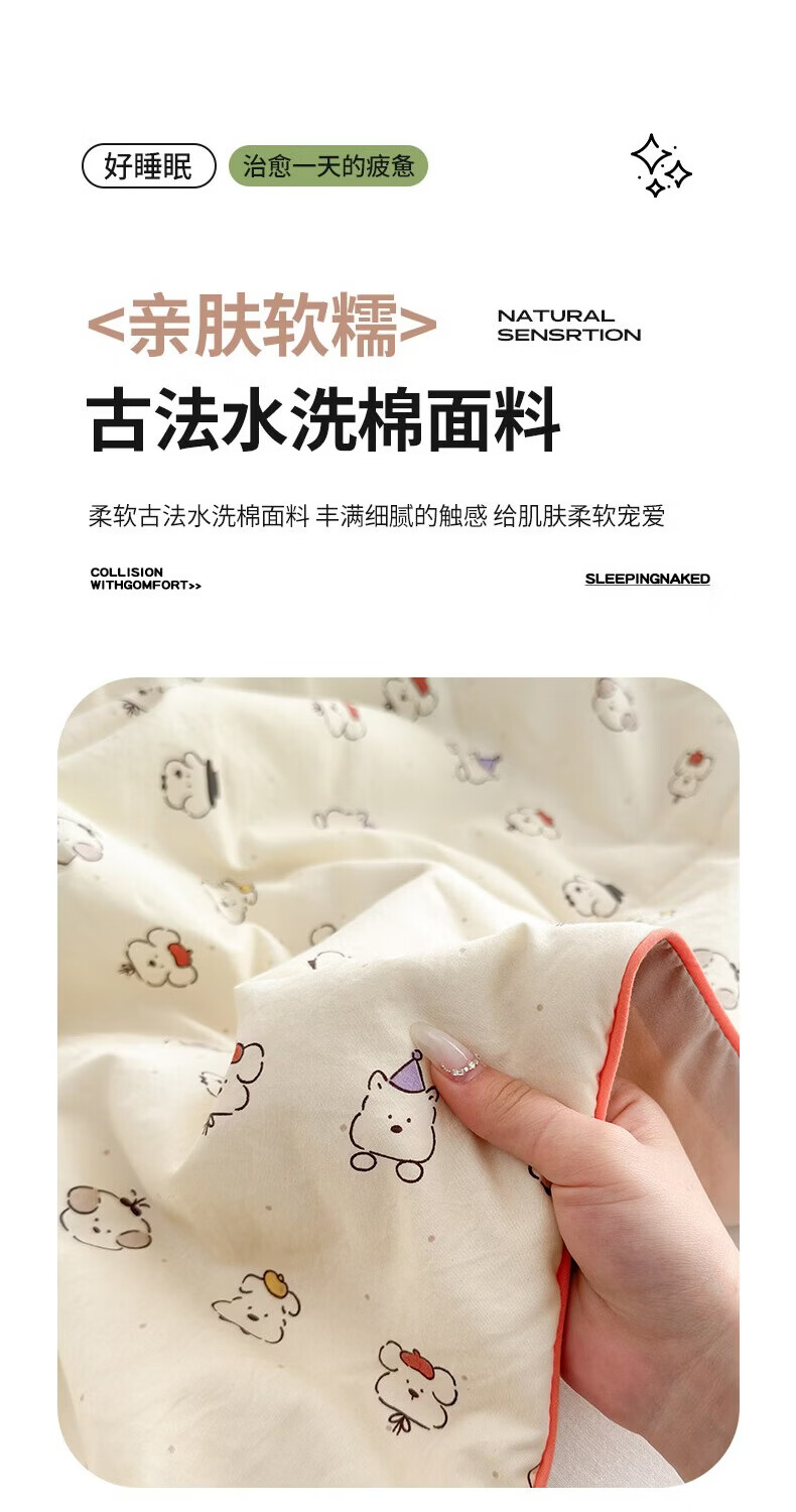 古法水洗棉面料,仿全棉的软糯触感,柔软蓬松;像云朵裹身,亲肤不扎身;清新治愈;颜值拉满,适配各种卧室风格;易打理不费心,抗皱