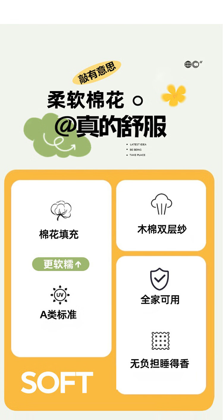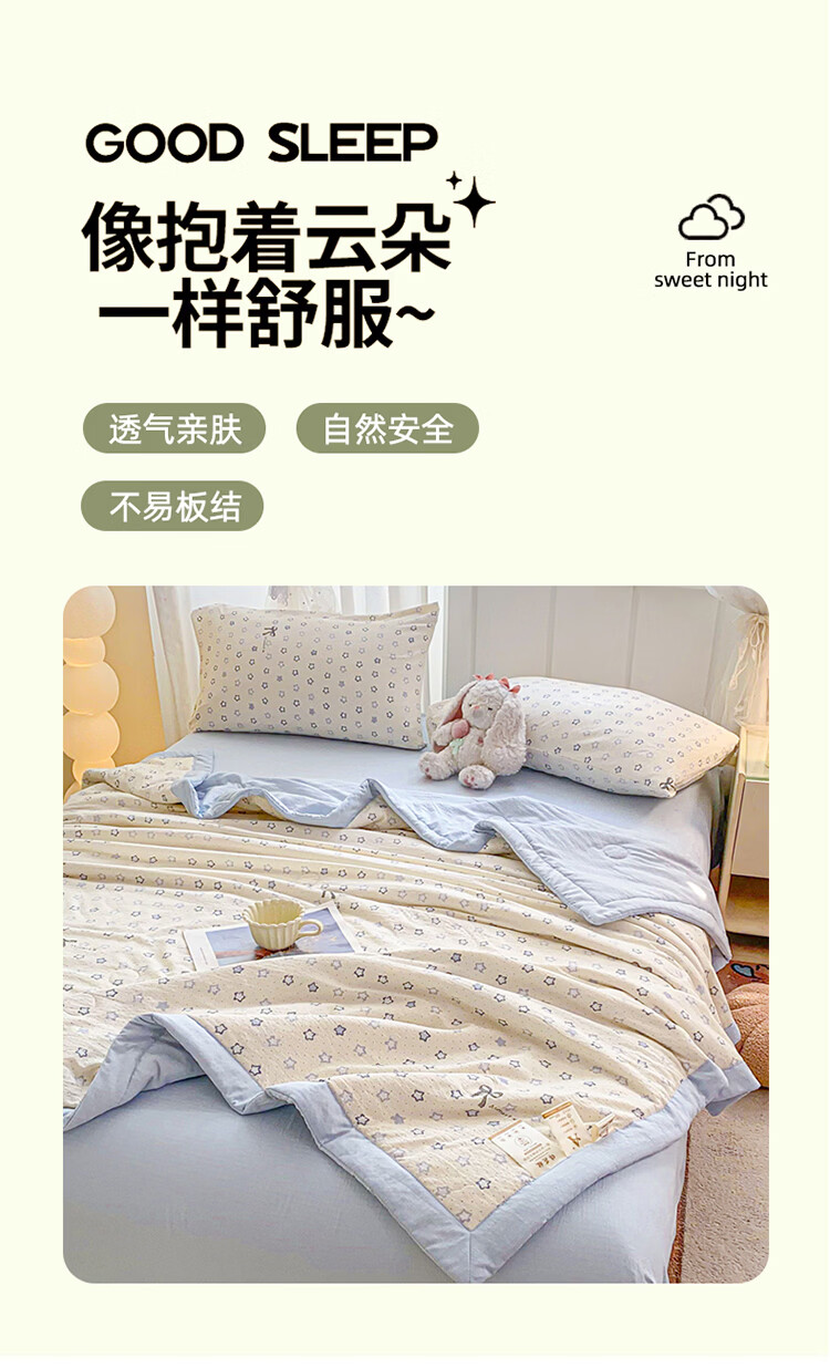 甄选双层纱面料,自带空气感蓬松肌理,摸起来软而不塌;透气不闷汗,空调房不凉、常温不闷;10% 棉花 + 90% 整张棉黄金填充