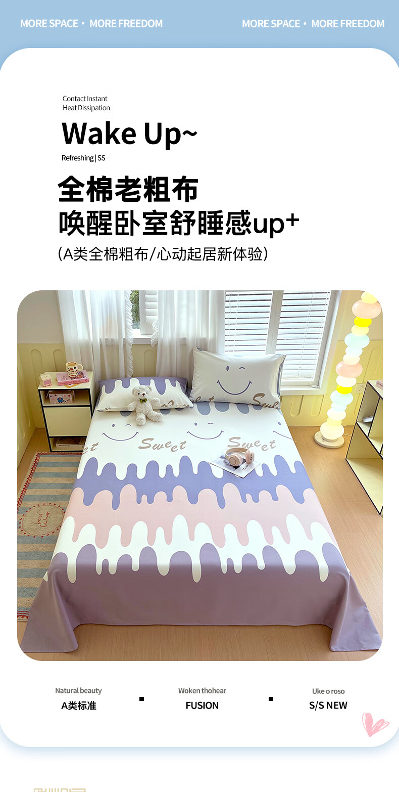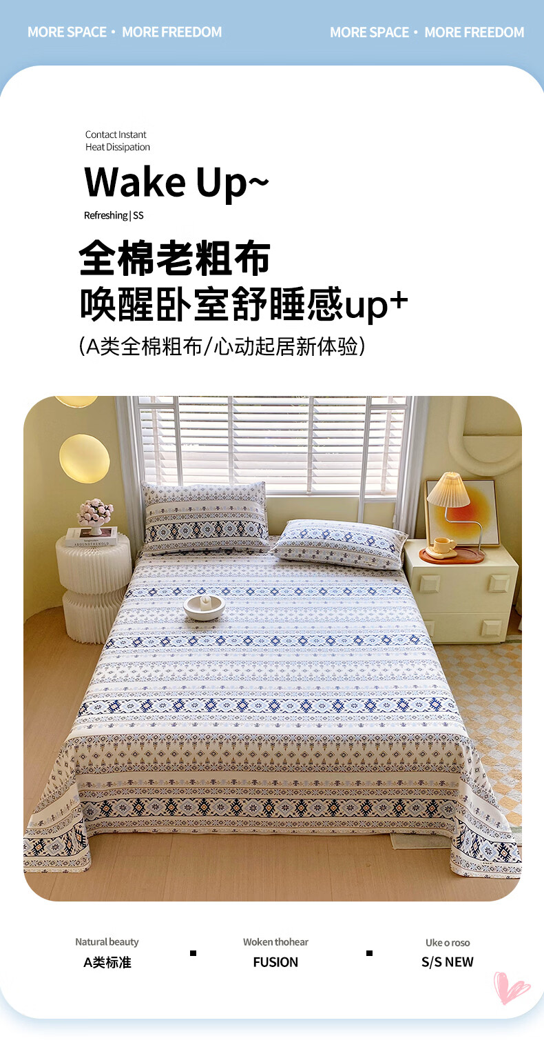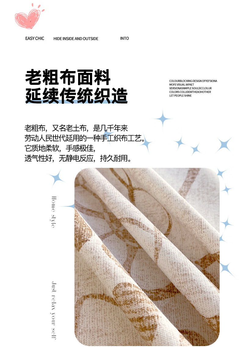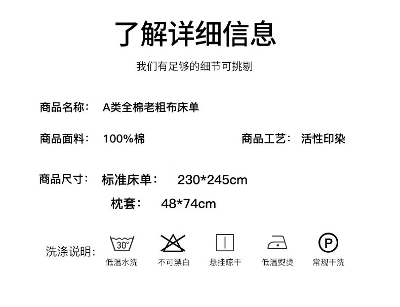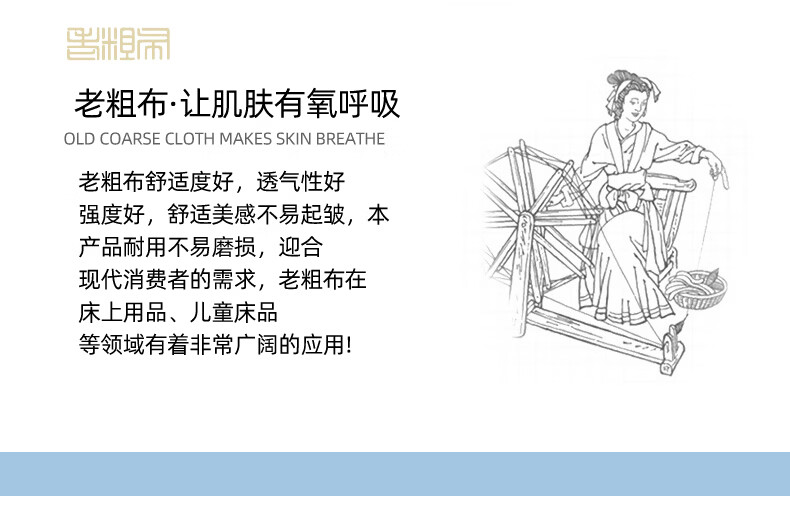 100%全棉老粗布·让肌肤有氧呼吸,老粗布舒适度好;透气性好强度好,舒适美感不易起皱,;本产品耐用不易磨损,迎合现代消费者的需求,;老粗布在床上用品、儿童床品等领域有着非常广阔的应用