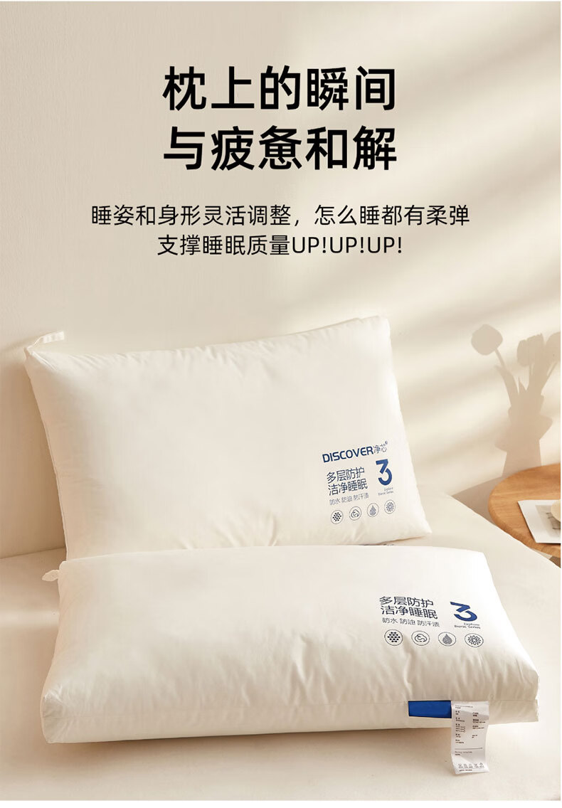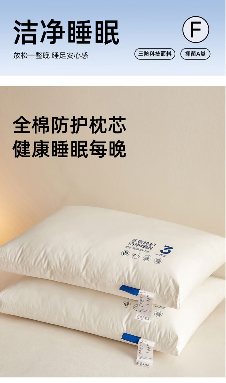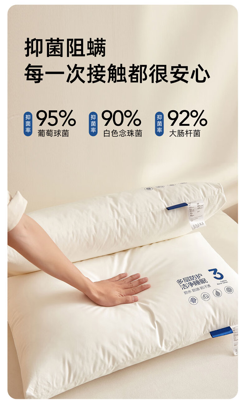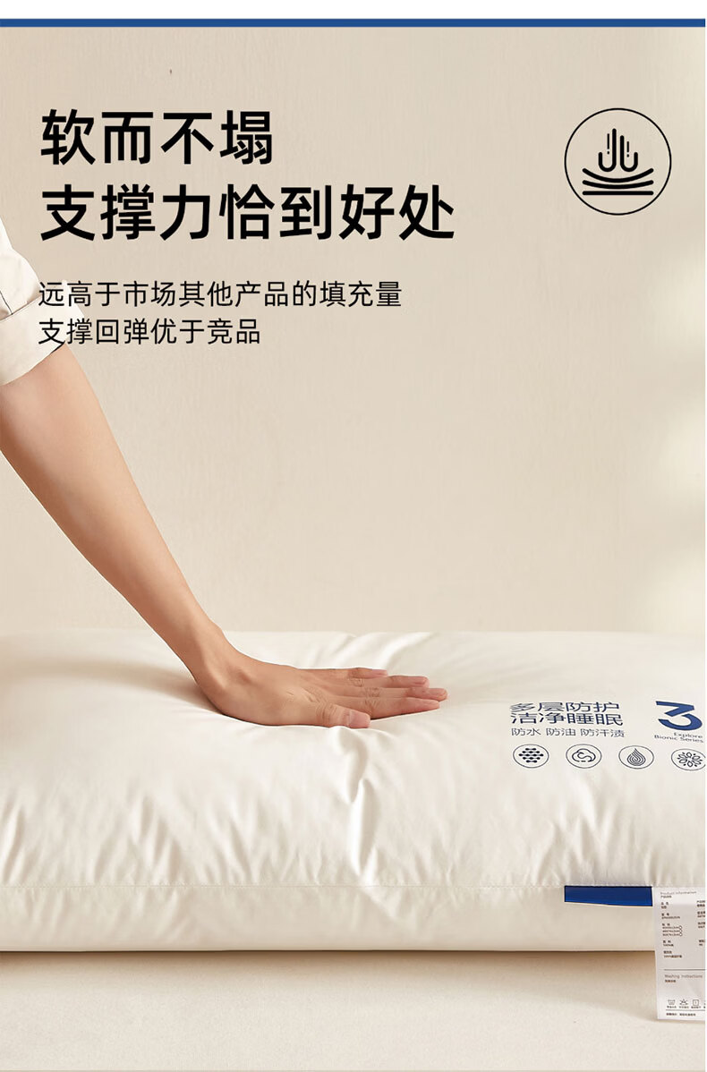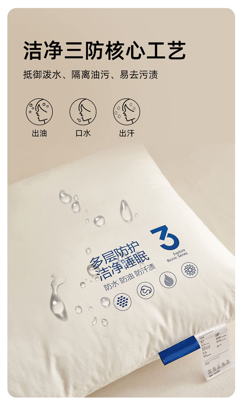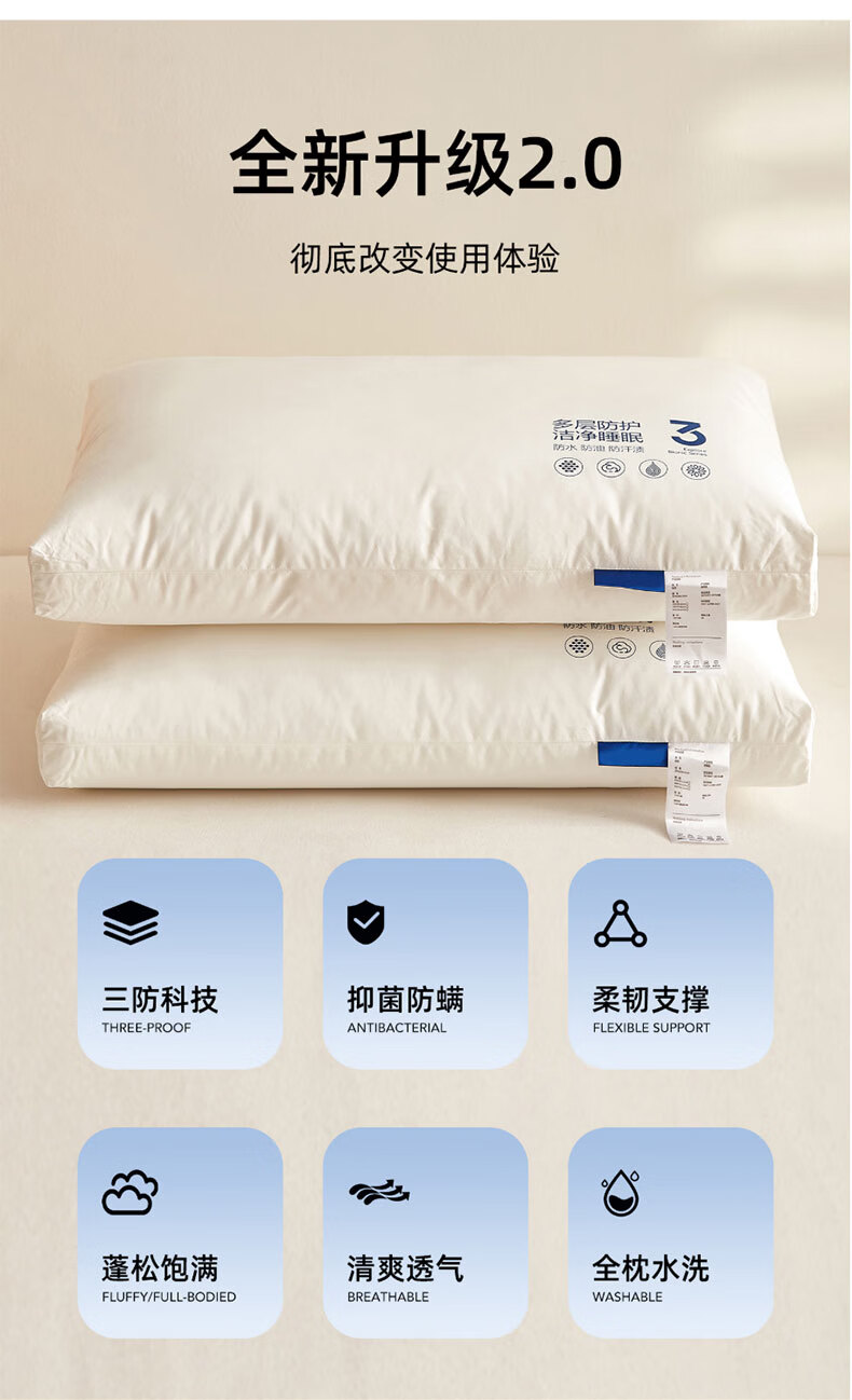 全新升级2.0,彻底改变使用体验,三防科技;蓬松饱满,抑菌防螨,清爽透气,柔韧支撑;全枕水洗,安全标准每一晚的休憩都安心