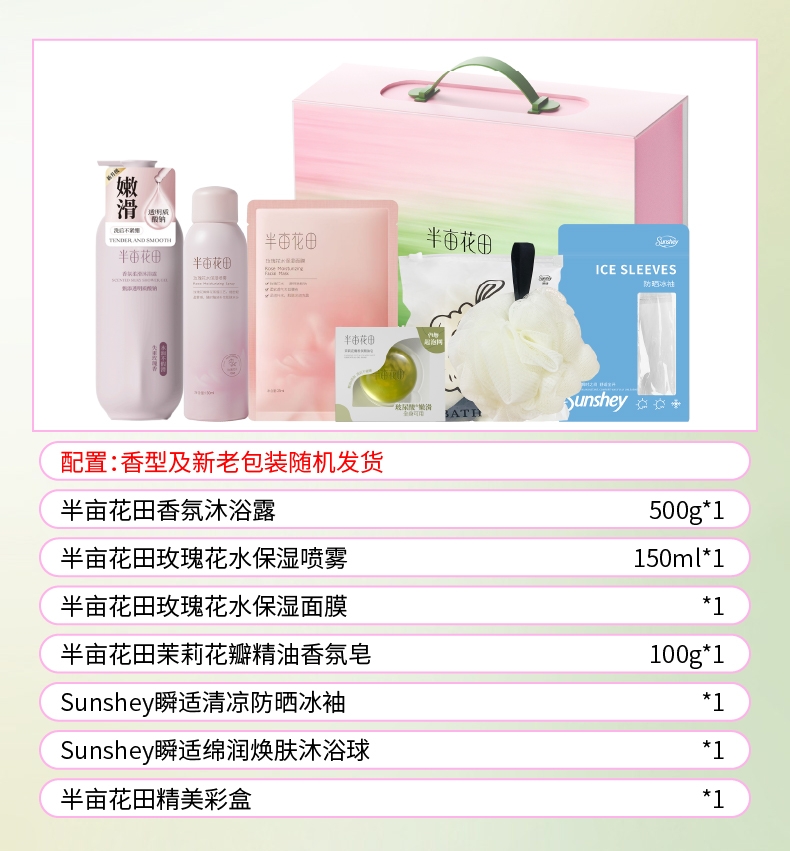 配置清单:半亩花田香氛沐浴露500g*1 半亩花田玫瑰花水保湿喷雾150ml*1 半亩花田玫瑰花水保湿面膜*1片 半亩花田茉莉花瓣精油香氛皂100g*1 Sunshey瞬适清凉防晒冰袖*1 Sunshey瞬适绵润焕肤沐浴球*1 半亩花田精美彩盒*1