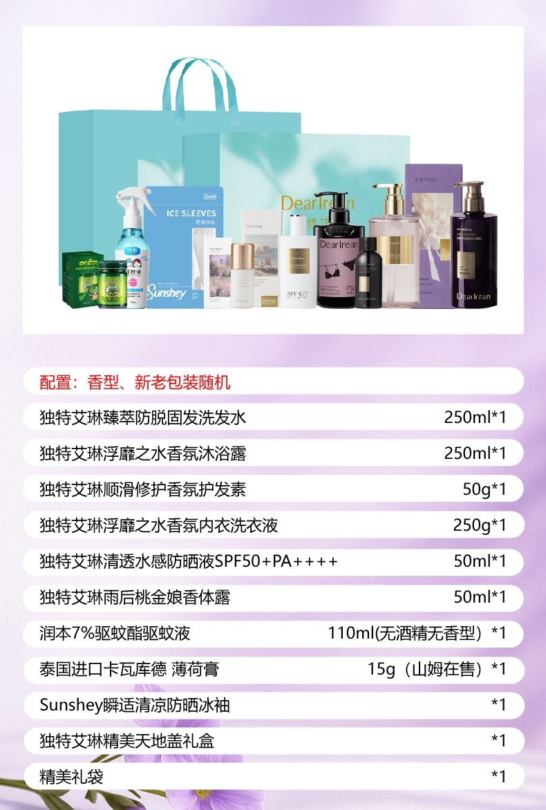 配置清单:规格配置:香型随机 独特艾琳臻萃防脱固发洗发水250ml*1 独特艾琳浮靡之水香氛沐浴露250ml*1 独特艾琳顺滑修护香氛护发素50g*1 独特艾琳浮靡之水香氛内衣洗衣液250g*1 独特艾琳清透水感防晒液SPF50+PA++++50ml*1 独特艾琳雨后桃金娘香体露50ml*1 润本7%驱蚊酯驱蚊液110ml(无酒精无香型)*1 泰国进口卡瓦库德 薄荷膏15g(山姆在售)*1 Sunshey瞬适清凉防晒冰袖*1 独特艾琳精美天地盖礼盒*1 精美礼袋*1