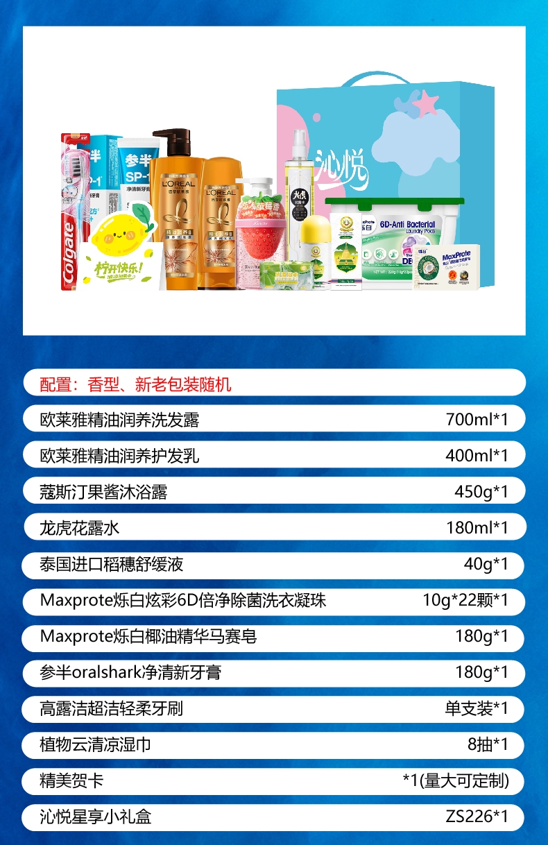 配置清单:配置明细:香型随机 欧莱雅精油润养洗发露700ml*1 欧莱雅精油润养护发乳400ml*1 蔻斯汀果酱沐浴露450g*1 龙虎黄柏花露水180ml*1 泰国进口稻穗舒缓液40g*1 Maxprote烁白炫彩6D倍净除菌洗衣凝珠10g*22颗*1 Maxprote烁白椰油精华马赛皂180g*1 参半oralshark净清新牙膏180g*1 高露洁超洁轻柔牙刷单支装*1 植物云清凉湿巾8抽*1 精美贺卡*1(量大可定制) 沁悦星享小礼盒ZS226*1