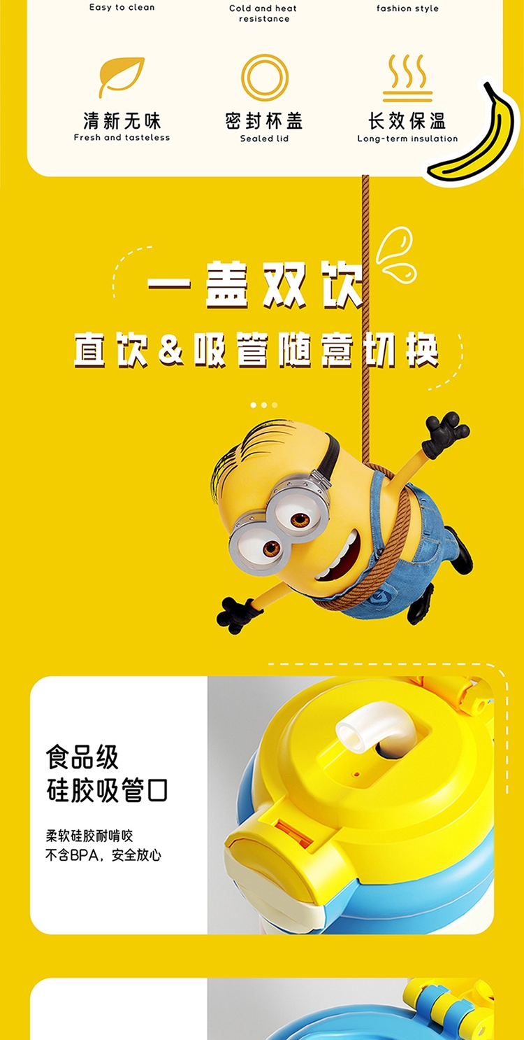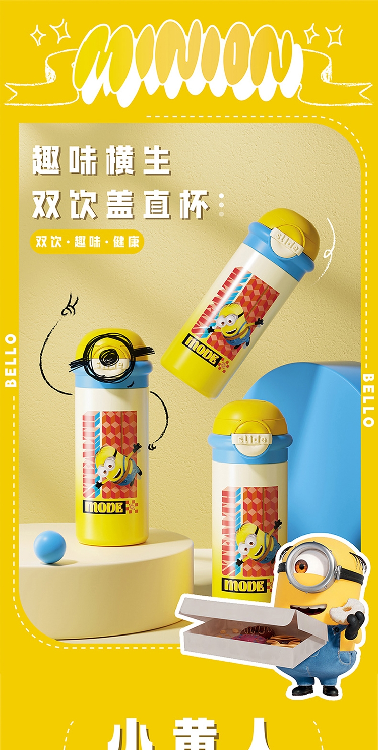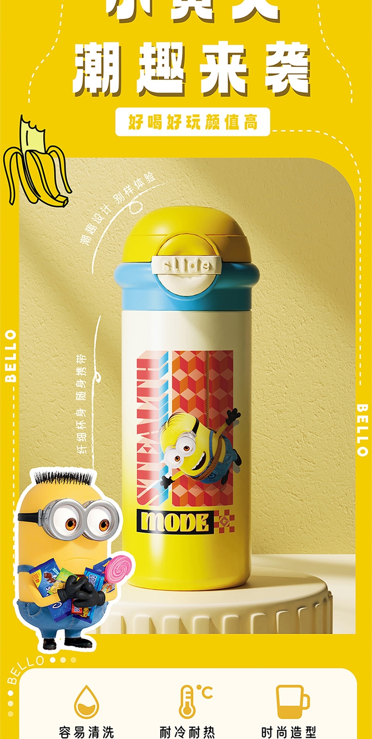 杯身印有经典的小黄人图案,色彩鲜艳、造型可爱;杯子采用高品质材料制成,确保了产品的耐用性和安全性;具备保温功能,采用双层真空设计,能有效保持水温