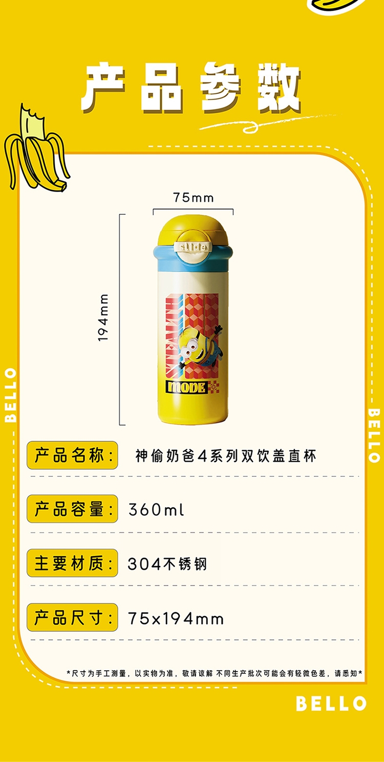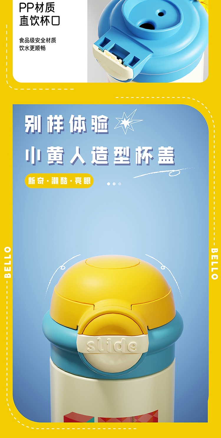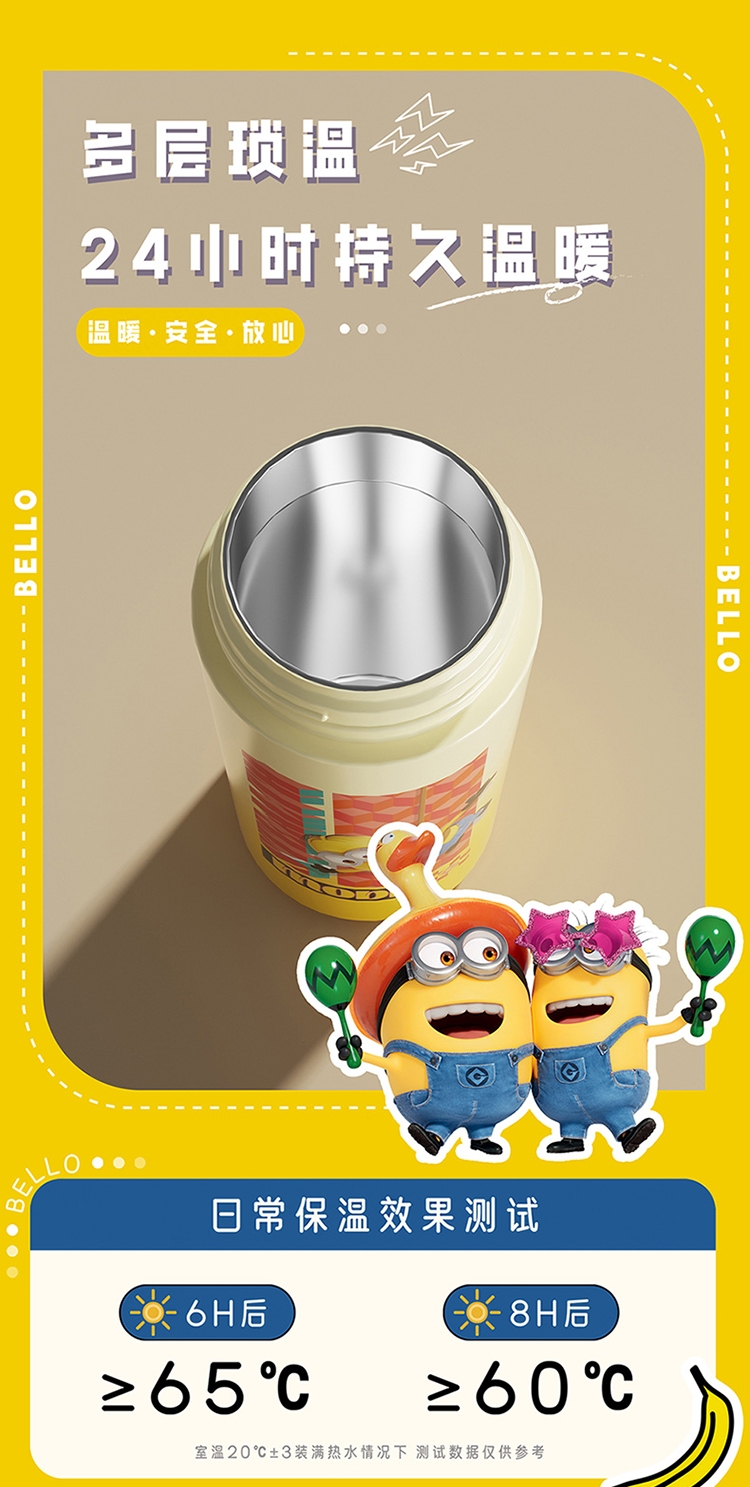 杯身印有经典的小黄人图案,色彩鲜艳、造型可爱;杯子采用高品质材料制成,确保了产品的耐用性和安全性;具备保温功能,采用双层真空设计,能有效保持水温