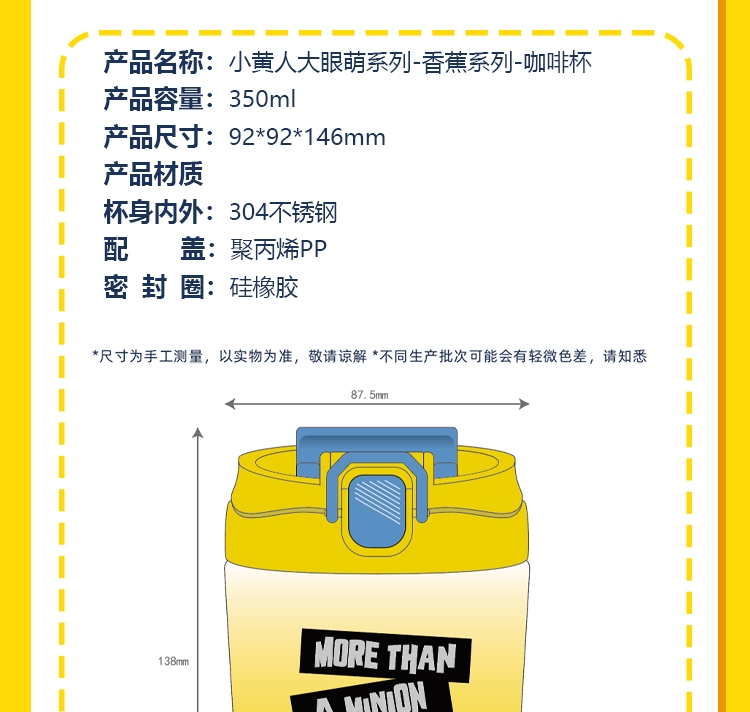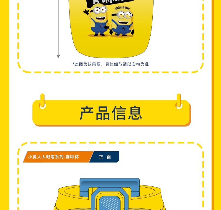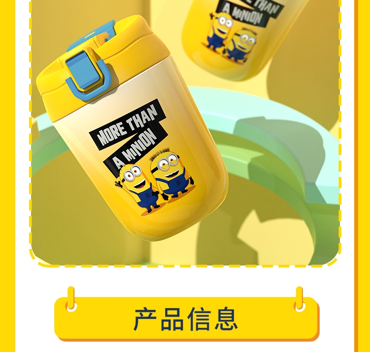 采用明亮的黄色为主色调,搭配活泼的小黄人图案,使咖;选用高质量的不锈钢材质,确保咖啡杯的耐用性和安全性;结合真空隔热技术,长时间的保温或保冷效果