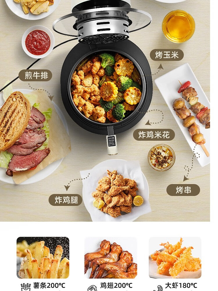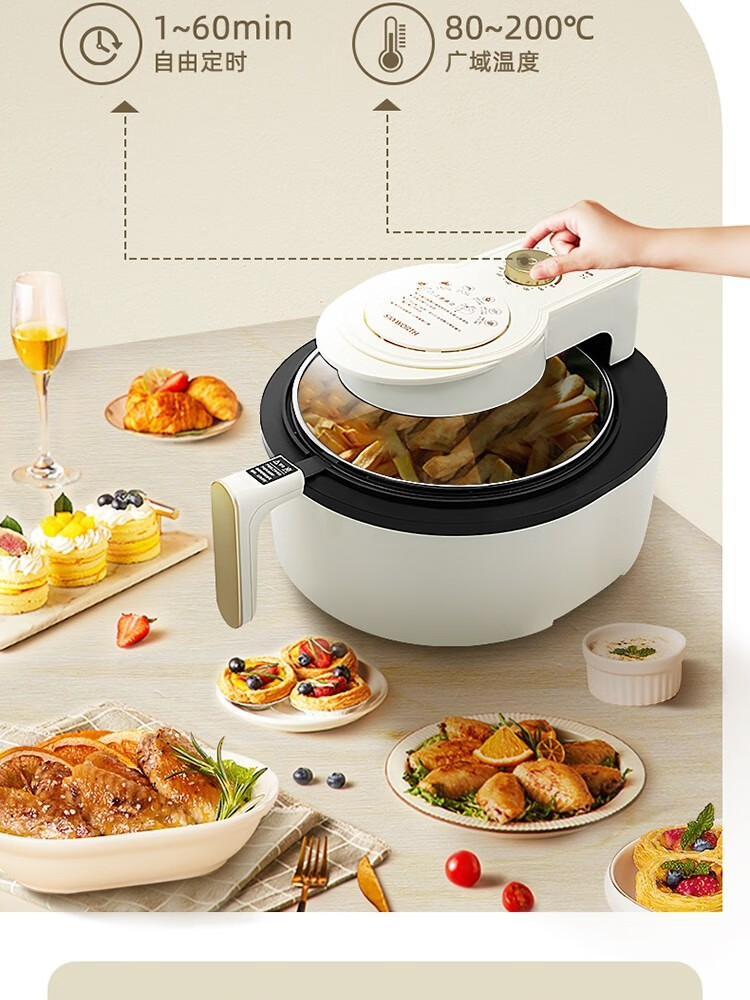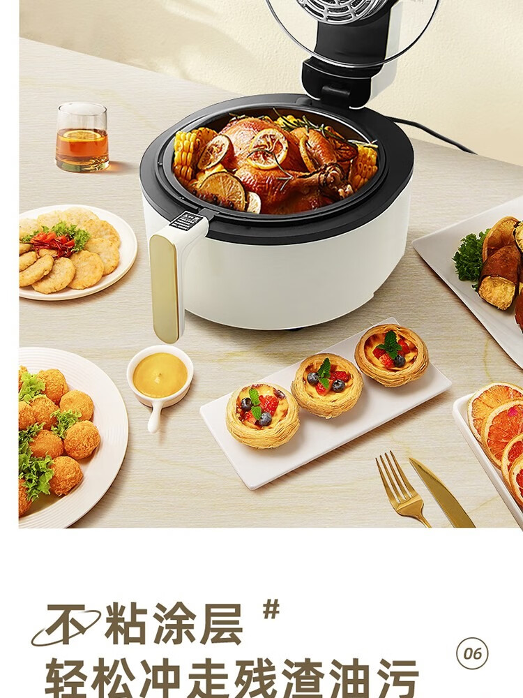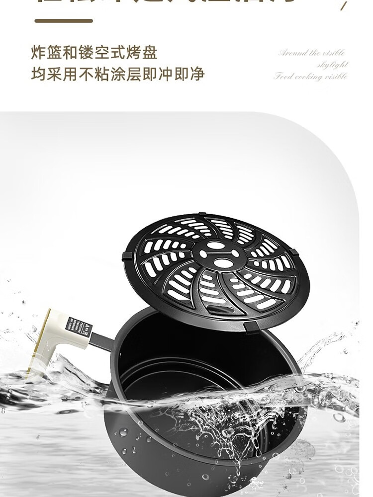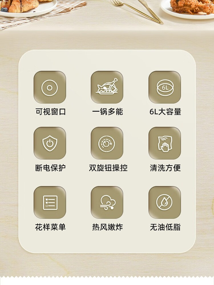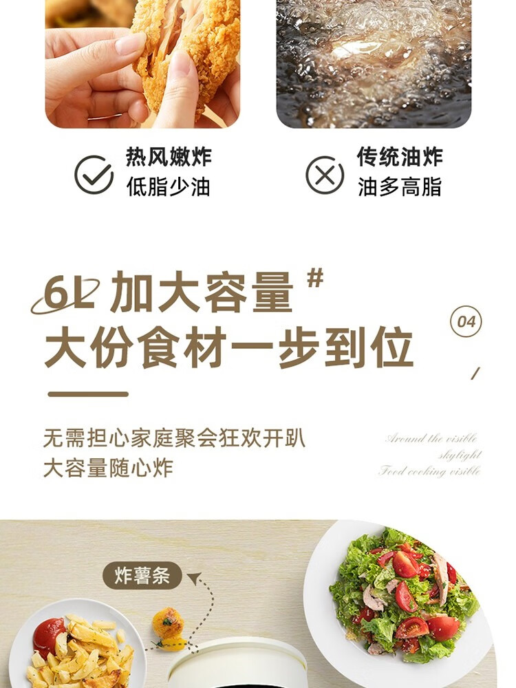 6L大容量可视化空气炸锅;食品接触级不沾锅涂层,久用不沾容清洁;长效控时、精准控温