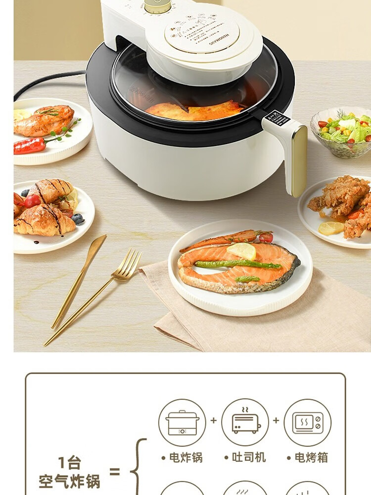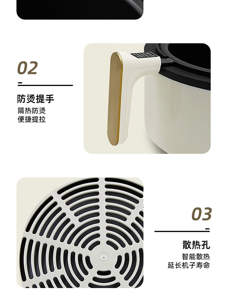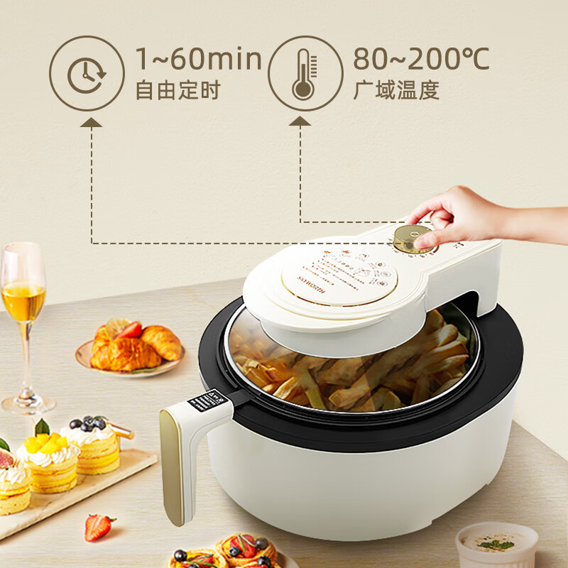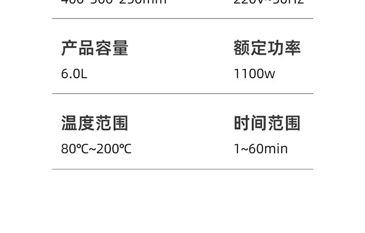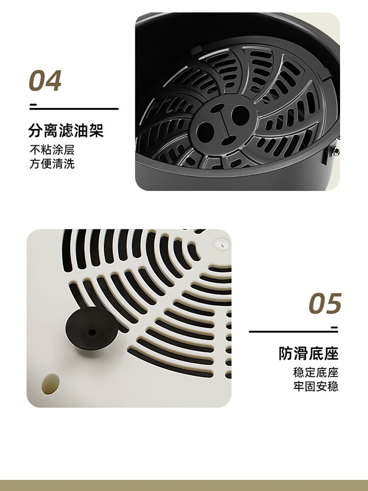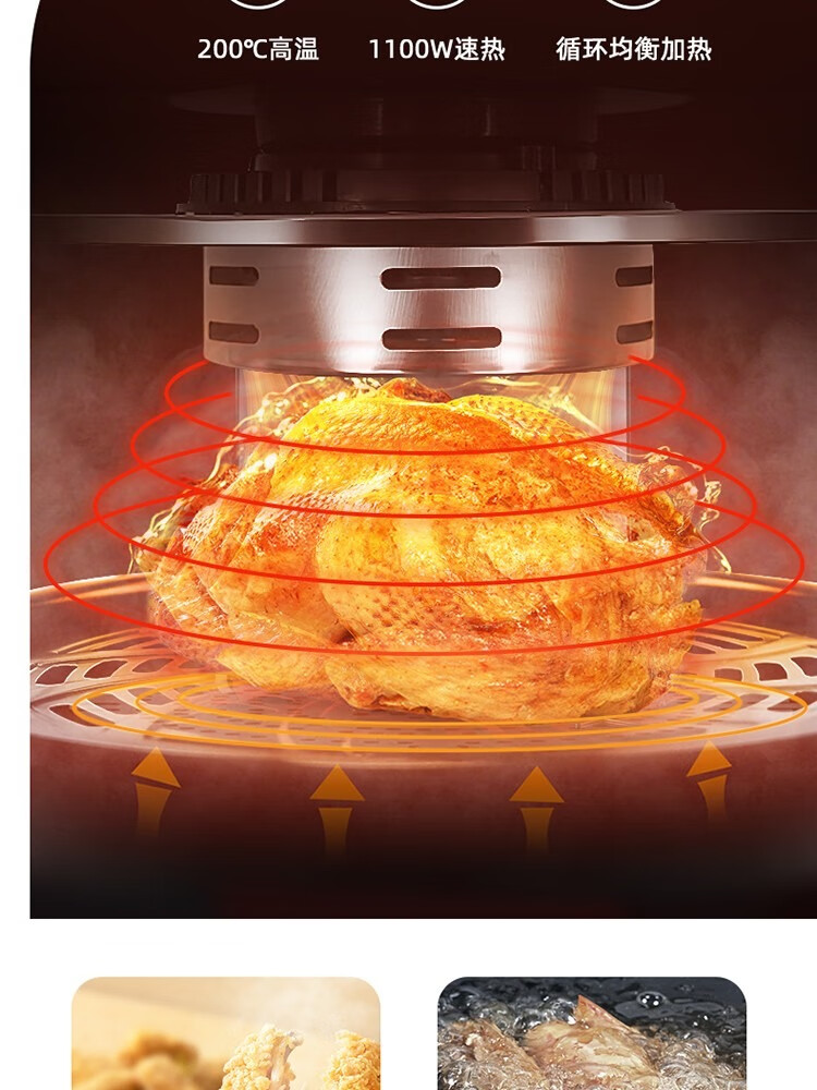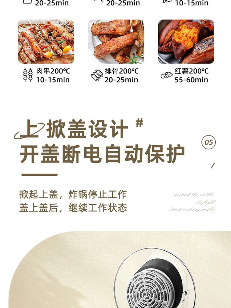 6L大容量可视化空气炸锅;食品接触级不沾锅涂层,久用不沾容清洁;长效控时、精准控温