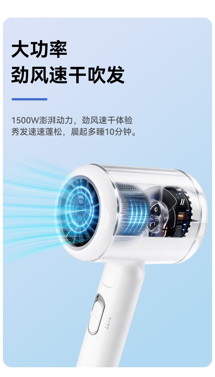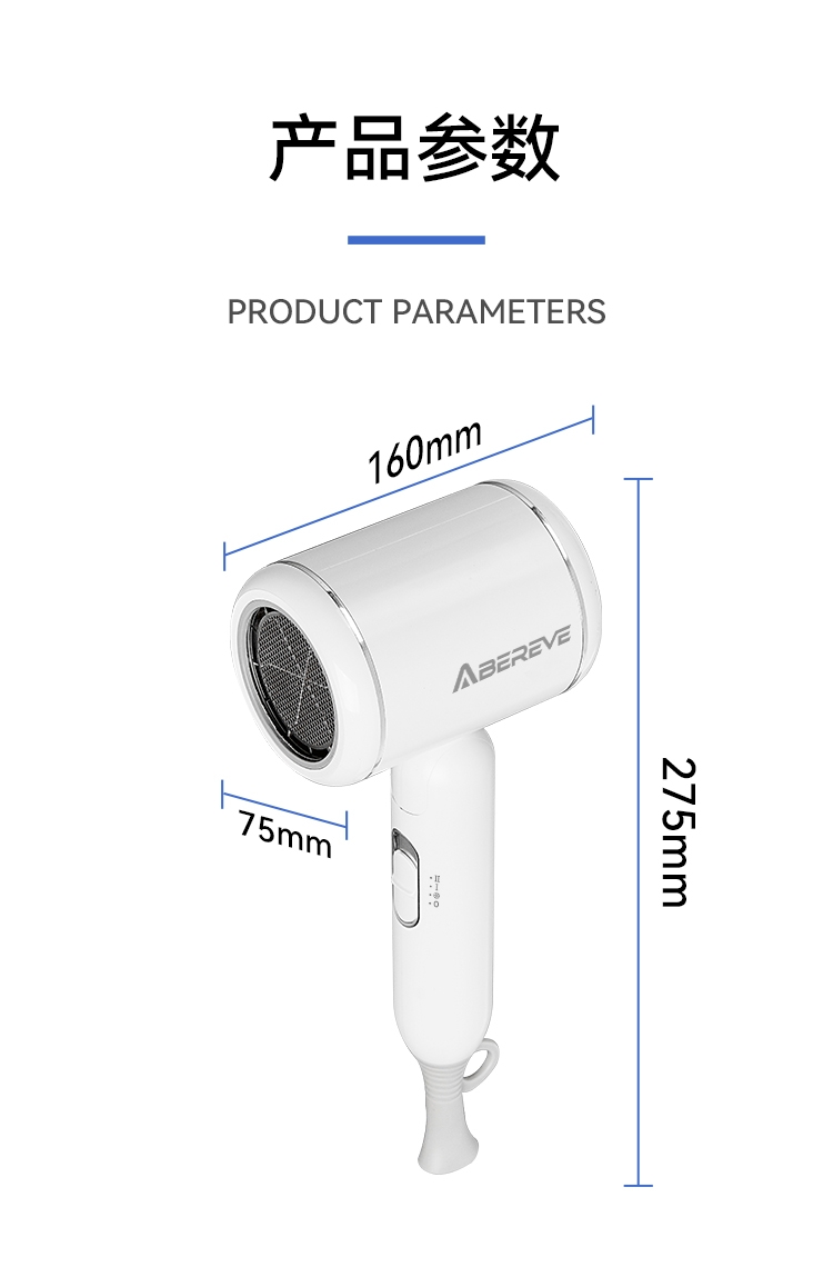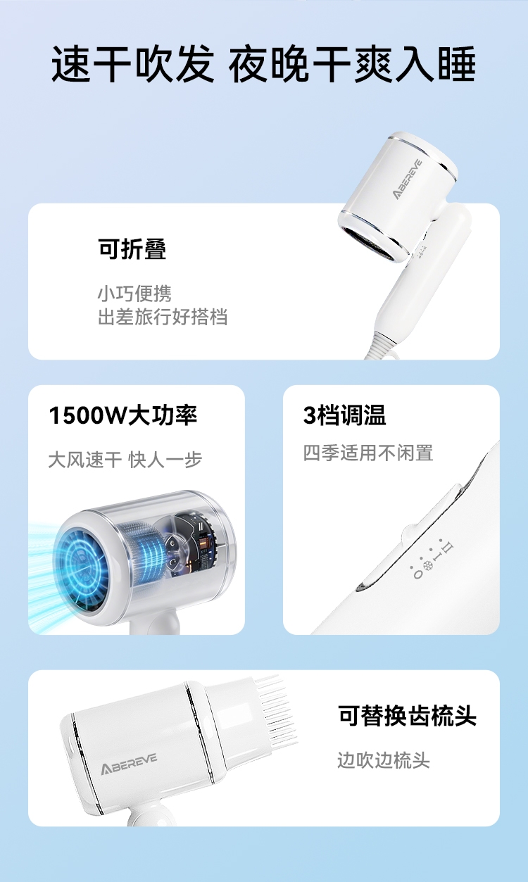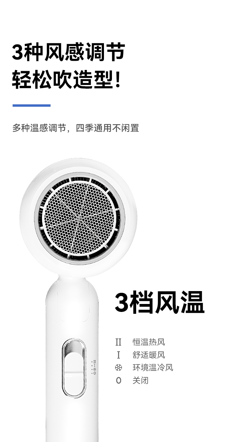 便携折叠手柄设计 小巧机身;1500w大功率 大风力速干造型;多档风温调节 3档调节 四季适用