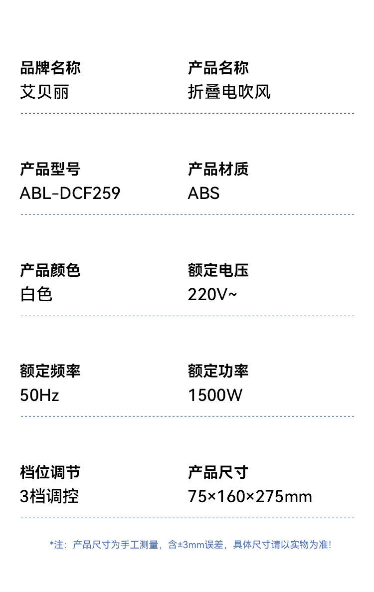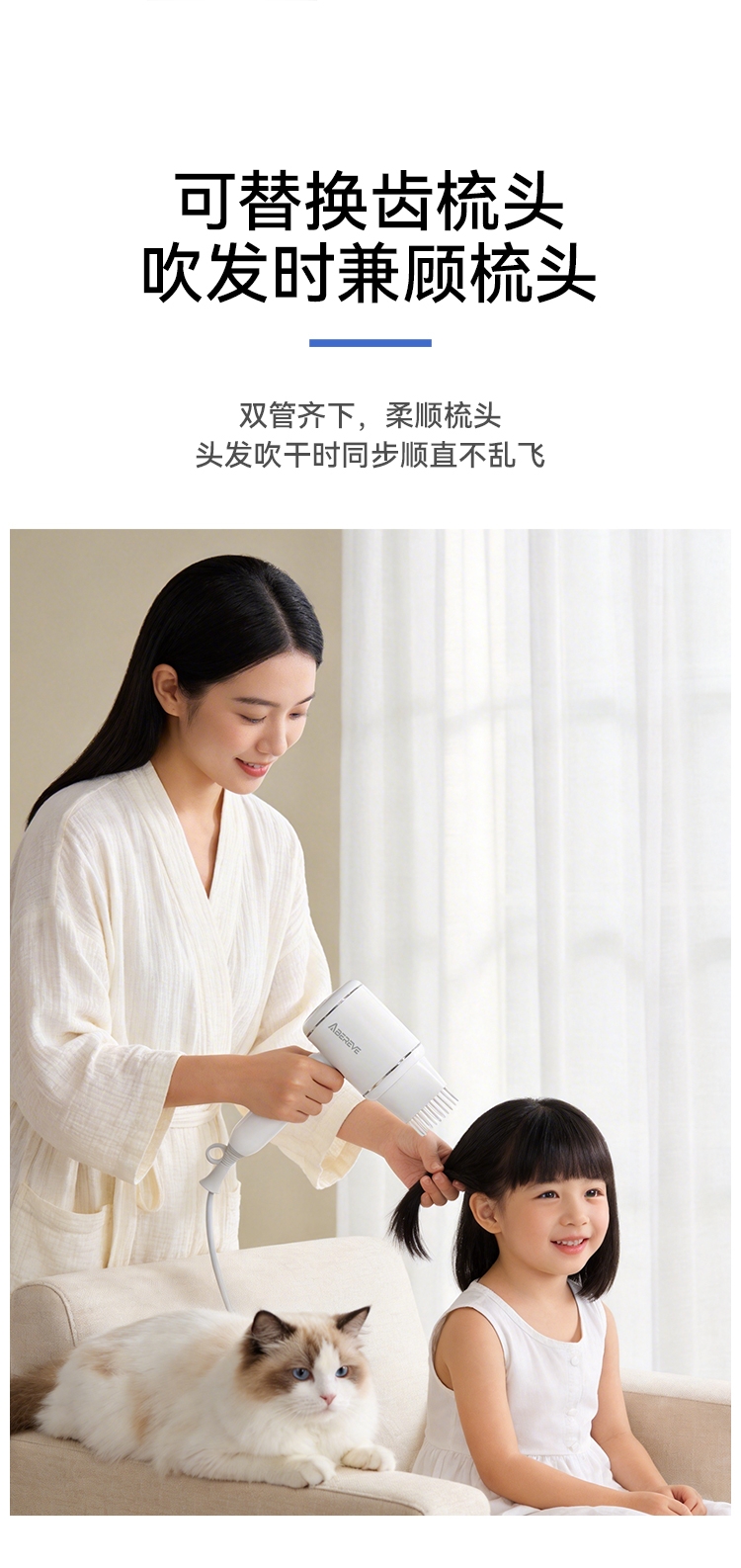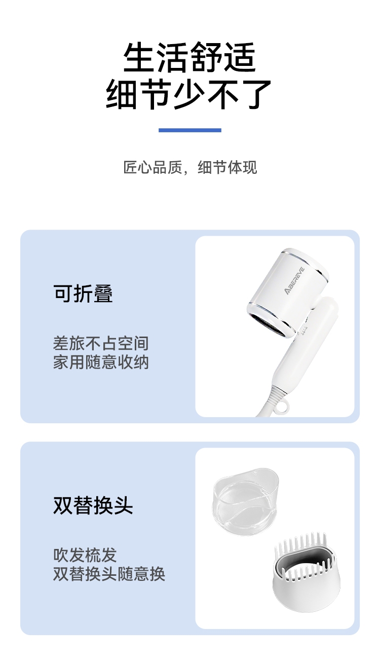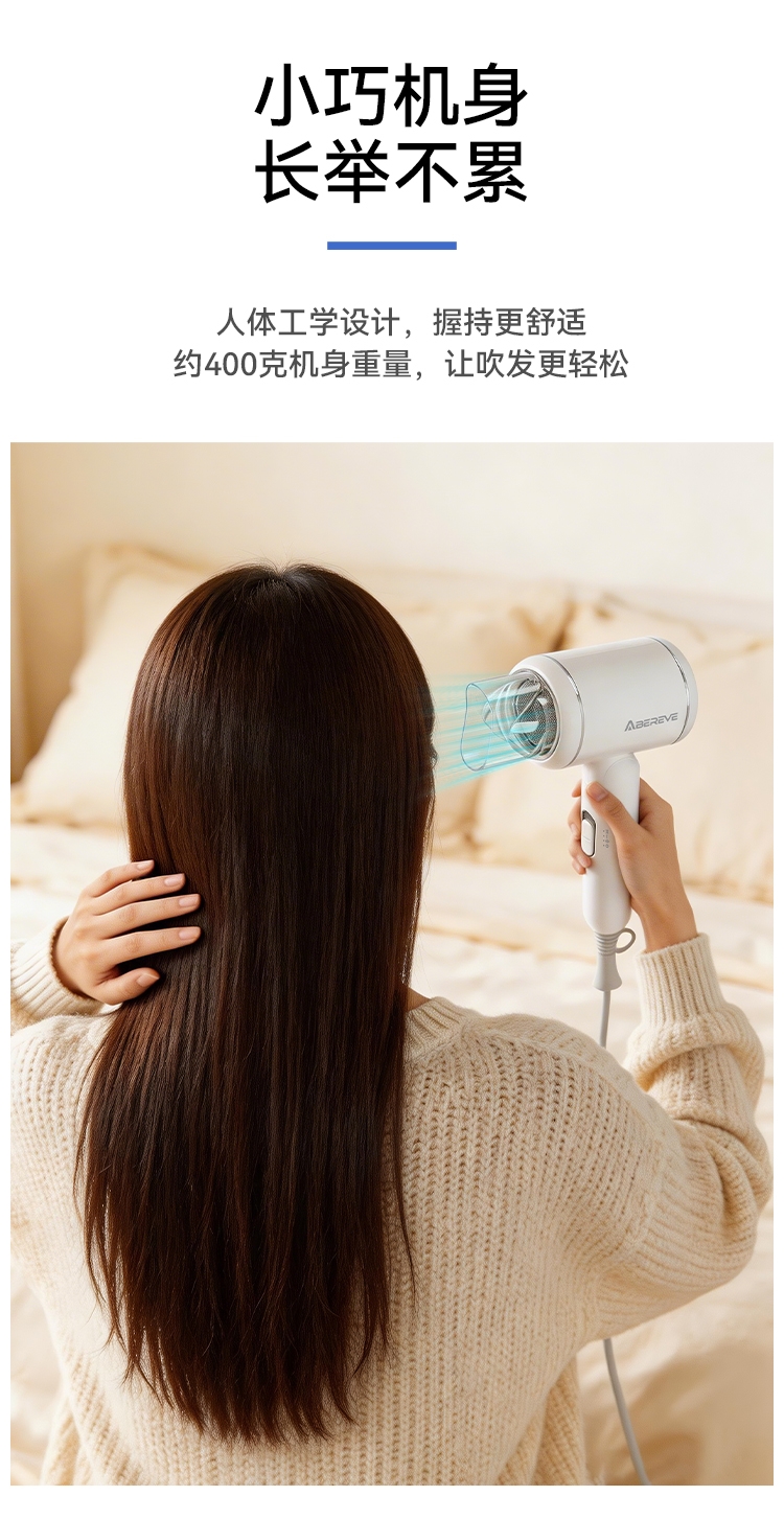 便携折叠手柄设计 小巧机身;1500w大功率 大风力速干造型;多档风温调节 3档调节 四季适用