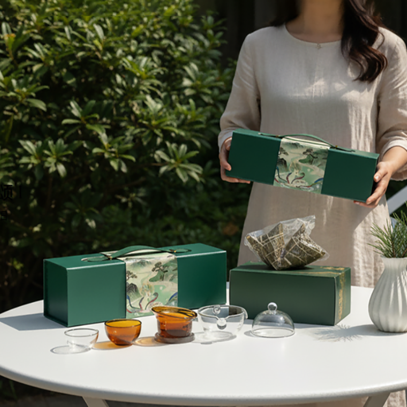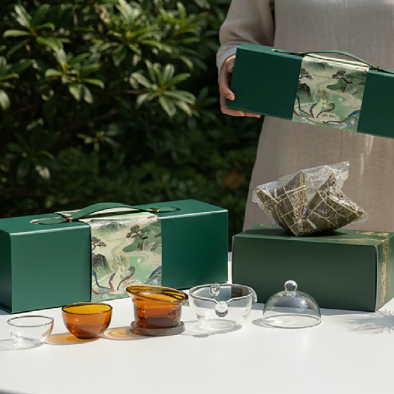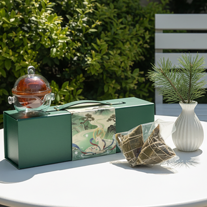 以「福气安康」为吉祥寓意,设计精巧便携实用;茶具质感温润;粽品传统美味