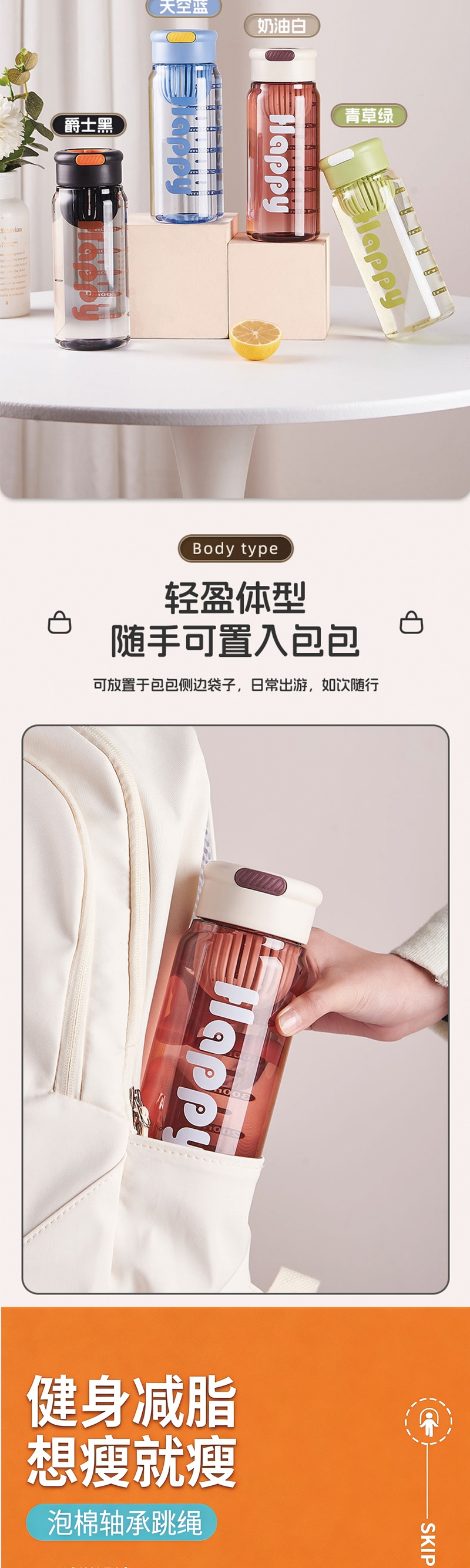 大容量随行水杯通透安心茶汤、饮品状态一目了然 ;双用负重跳绳顺滑不绕绳舒适握持:人体工学防滑手柄;运动毛巾可压缩收纳,体积小巧不占地;户外竞技飞盘专业标准安全耐造个性设计