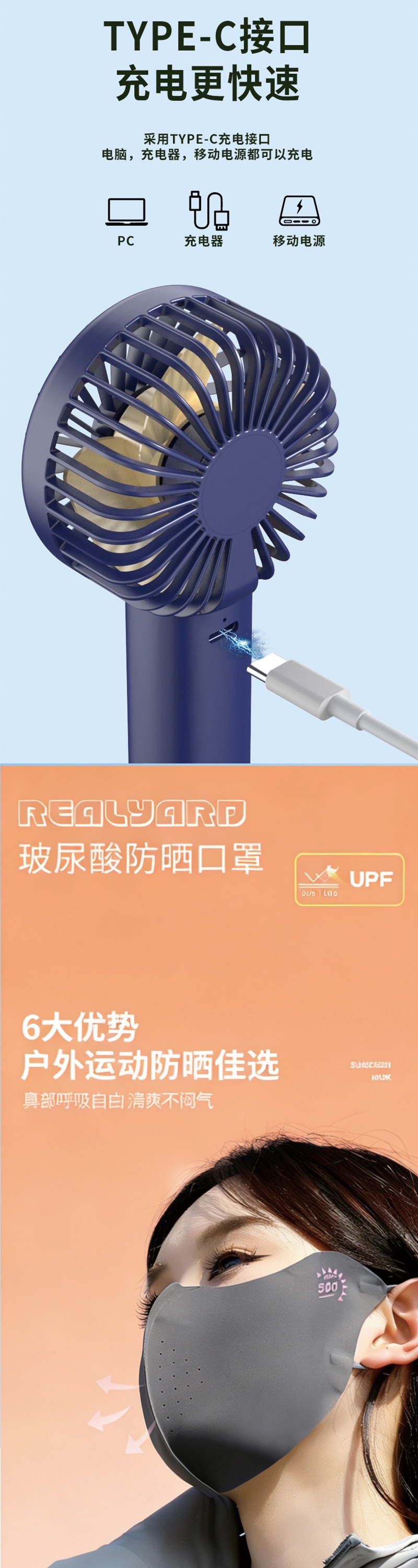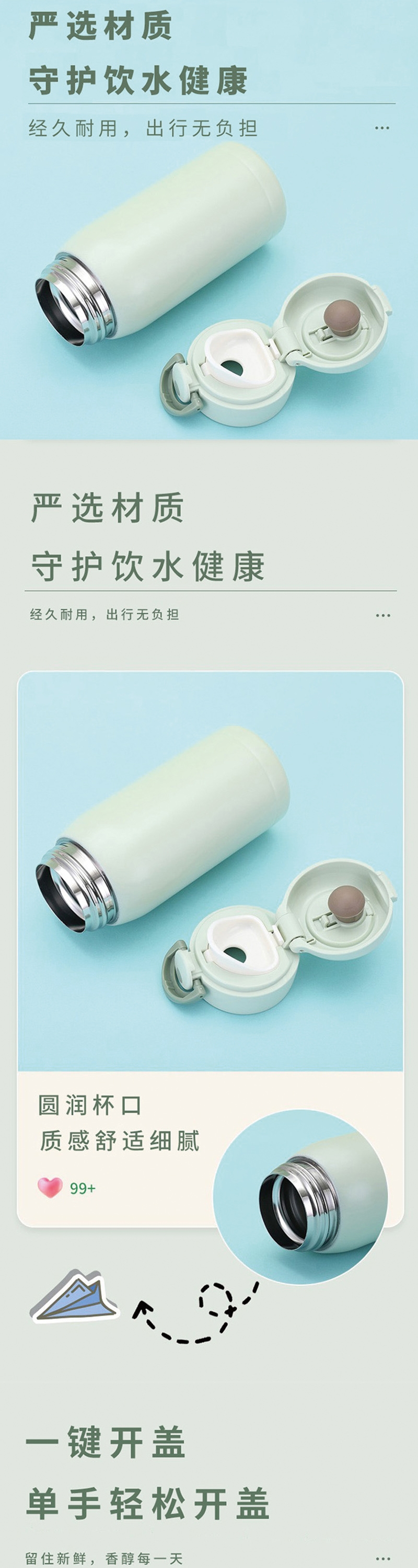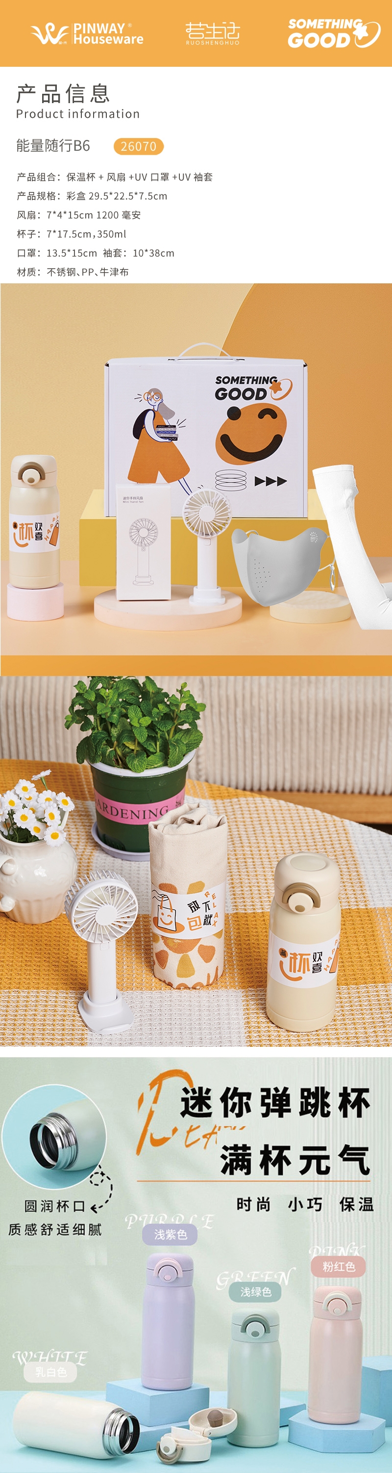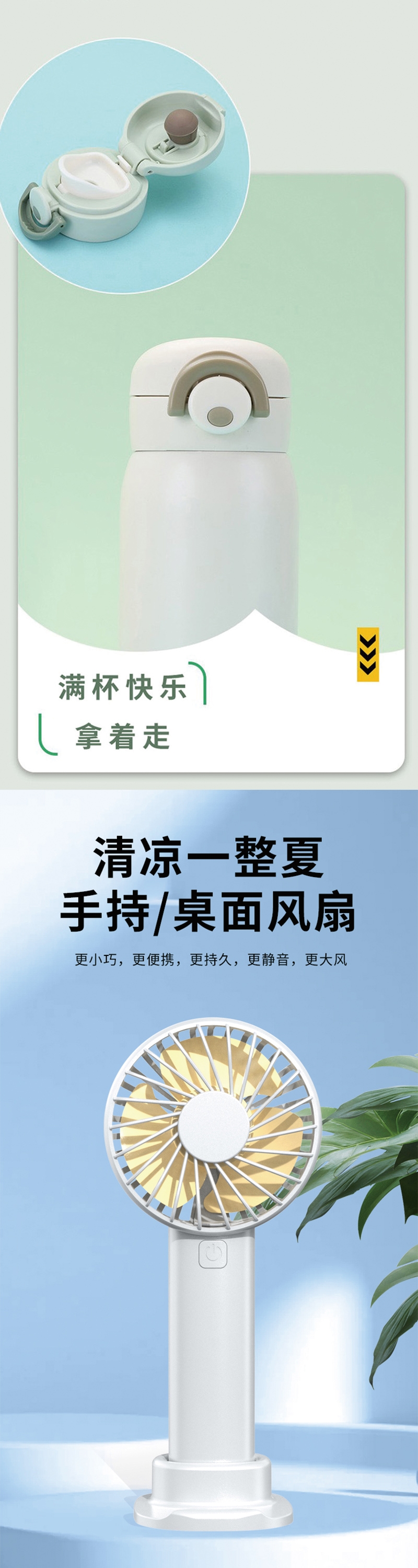 保温杯贴心细节:弹跳开盖单手就能操作饮水更防呛;迷你便携风扇强劲风力轻巧随行静音低噪;防护口罩立体剪裁高效防护亲肤舒适;冰丝防晒袖套专业防晒凉感透气贴合不紧绷
