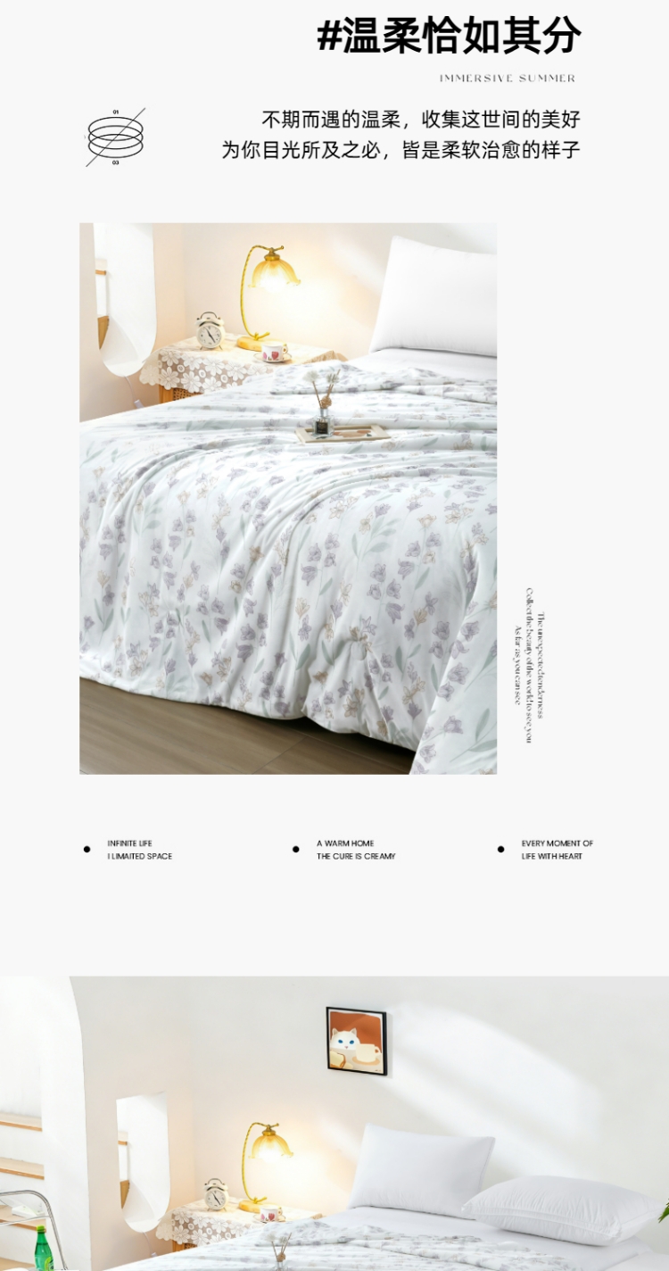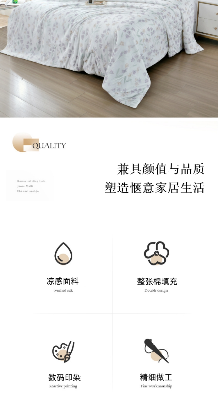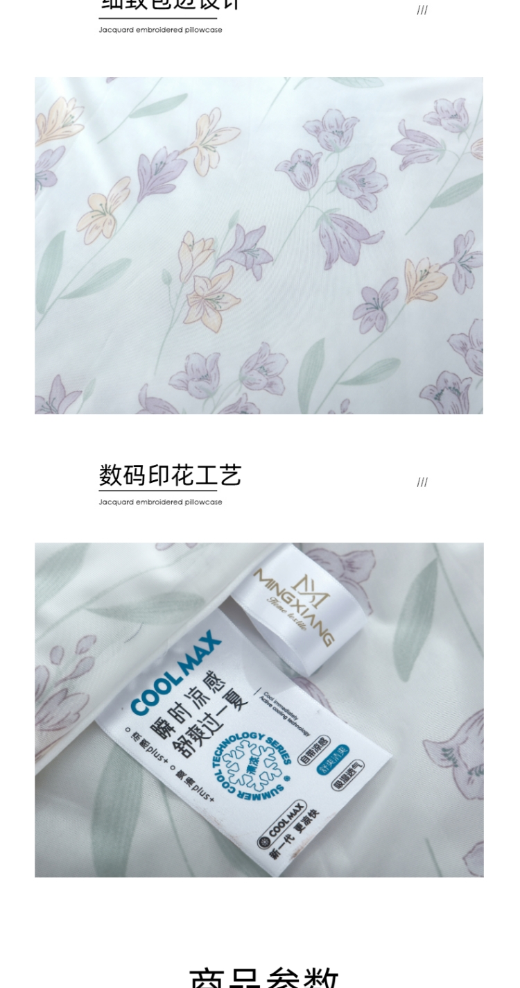 产品采用凉感纱线,更加清凉舒适;;数码印染工艺,色彩鲜明大气,不褪色不掉色;电脑精致绗缝,机洗不变形,耐用性好