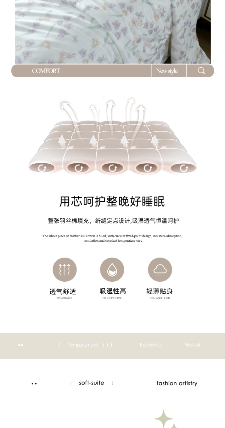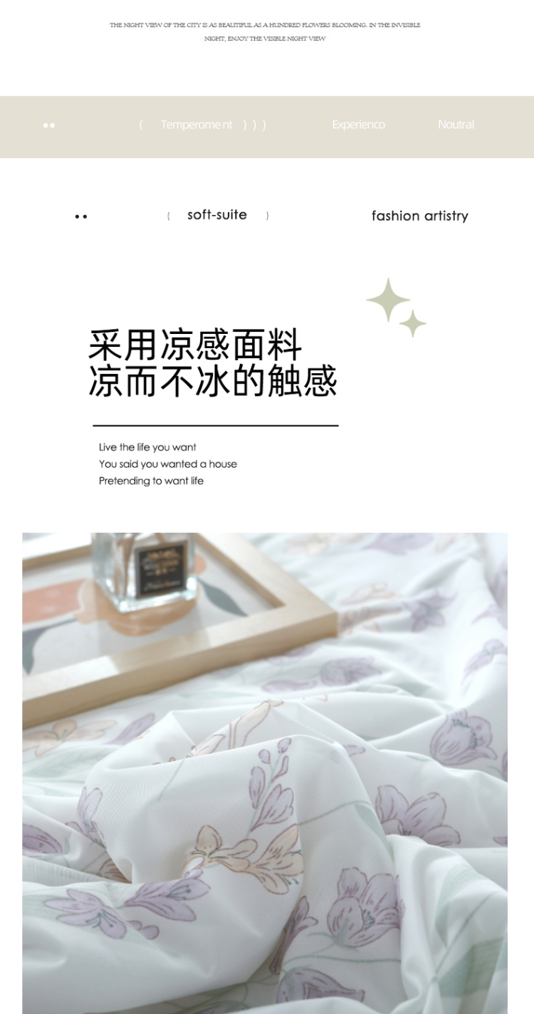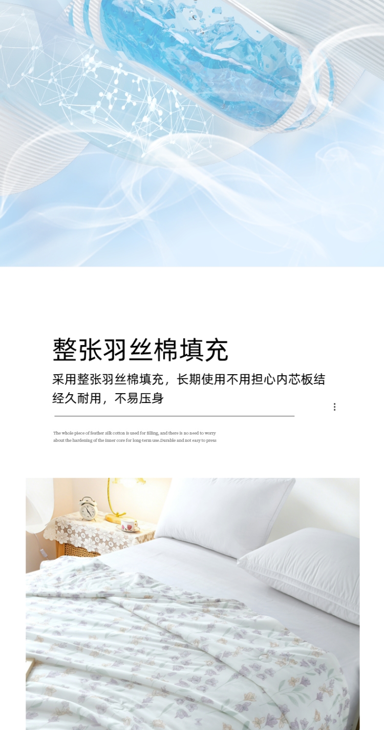产品采用凉感纱线,更加清凉舒适;;数码印染工艺,色彩鲜明大气,不褪色不掉色;电脑精致绗缝,机洗不变形,耐用性好