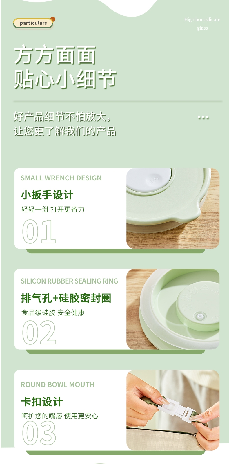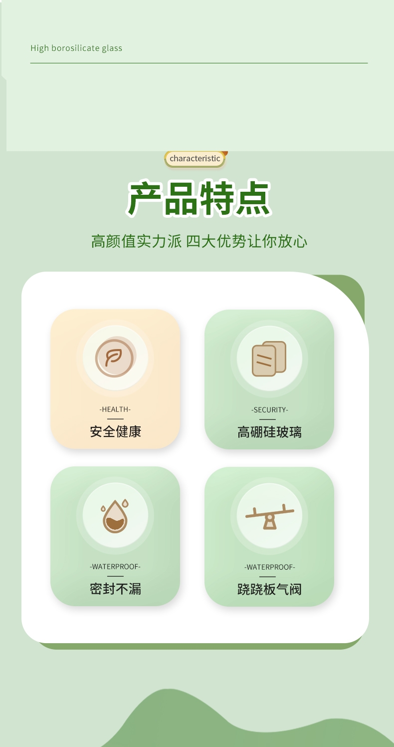 高硼硅玻璃材质通透性好,极佳耐热性和耐寒性;;轻量化处理,重量减轻了50%以上,使用更加便捷;;将保温功能隐于极简时尚的包型之中