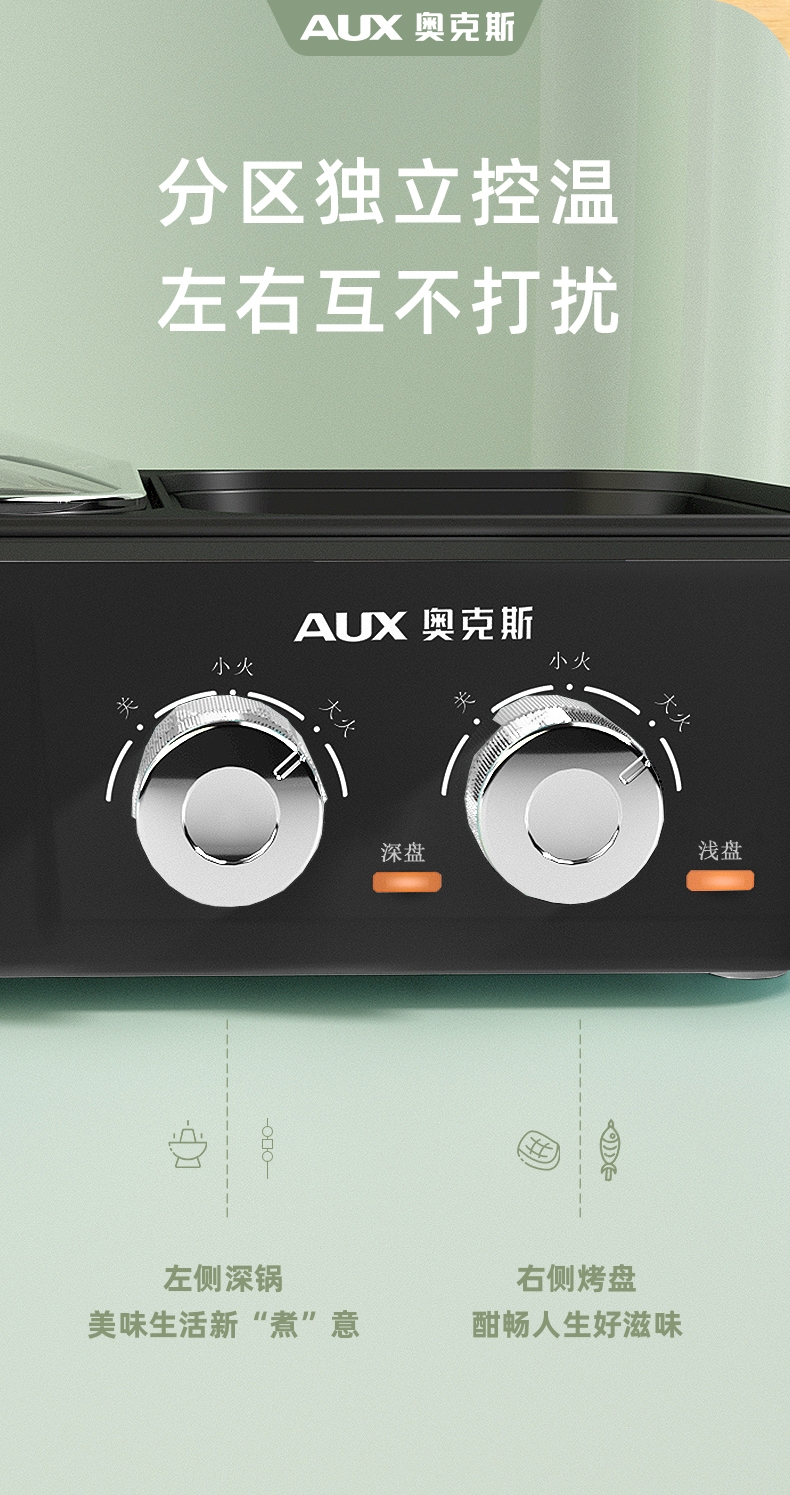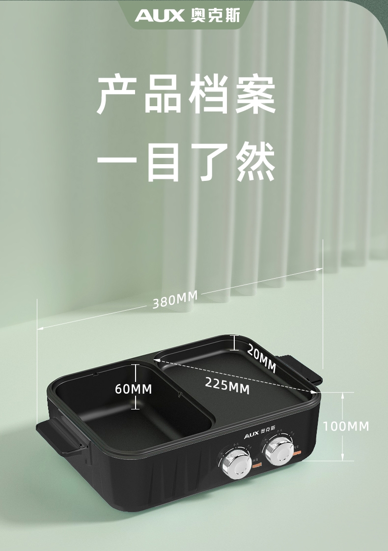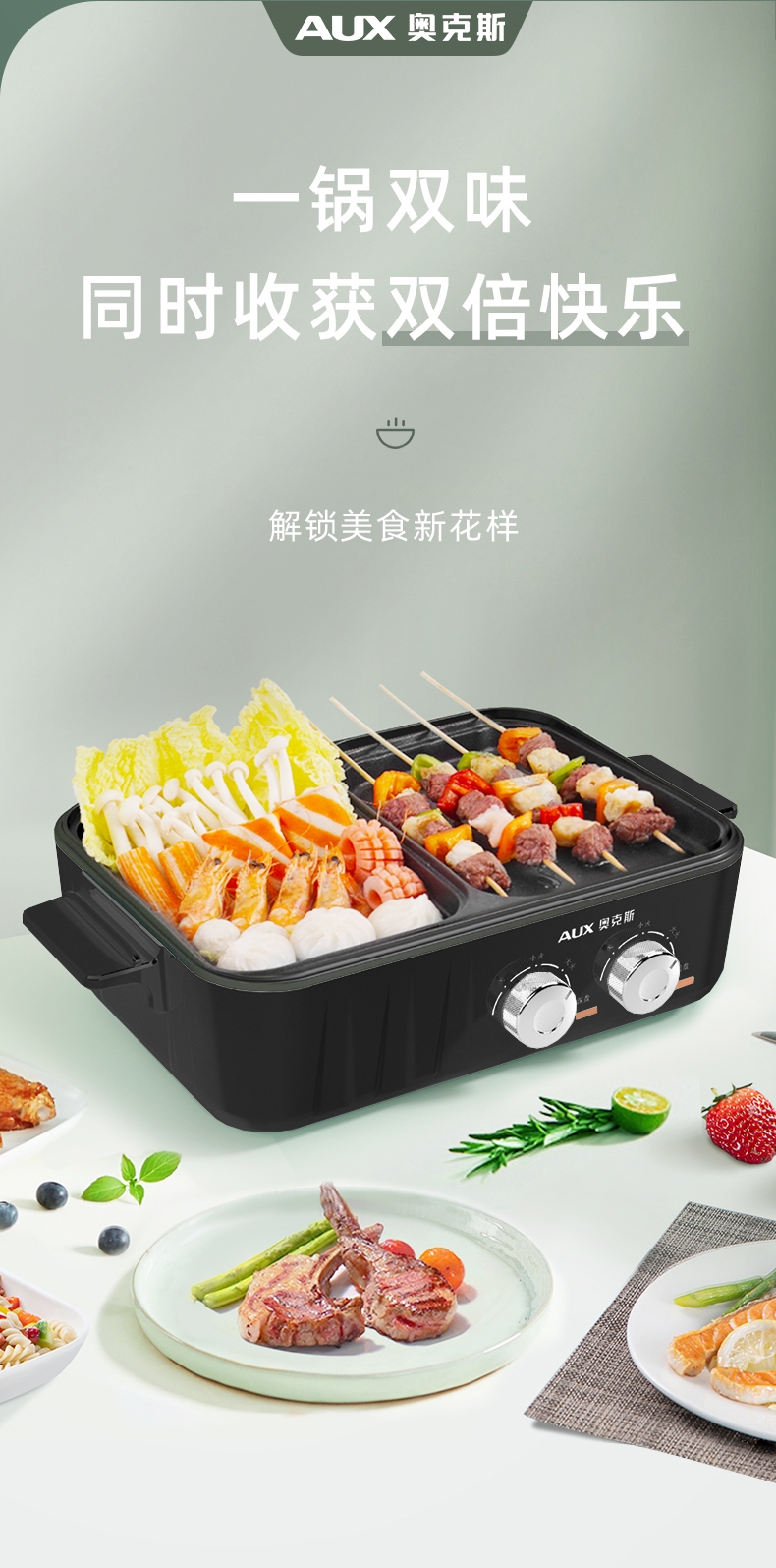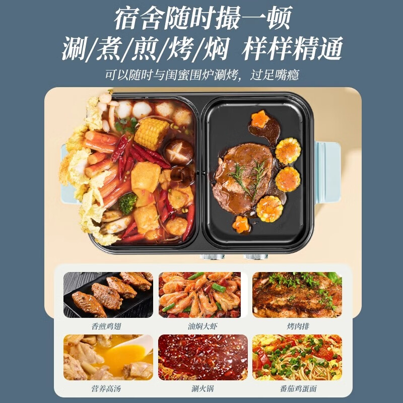 烤涮一体锅,煎/炒/焖/煮/炖/涮;精致容量,可1-3人使用;1200W功率,双旋钮开关;左涮右烤,双区独立控温;食品接触级不粘涂层,易清洁不粘锅