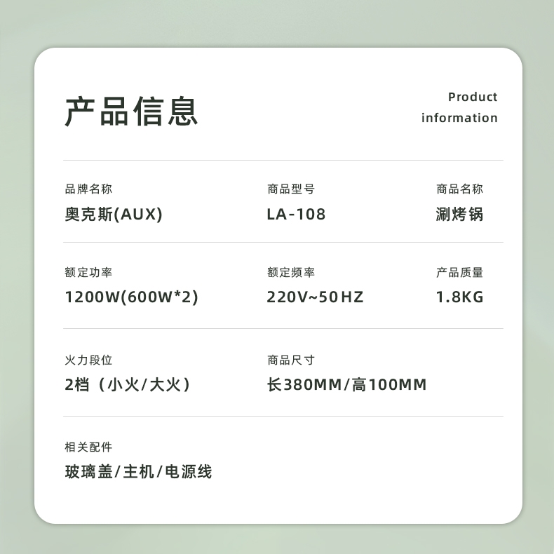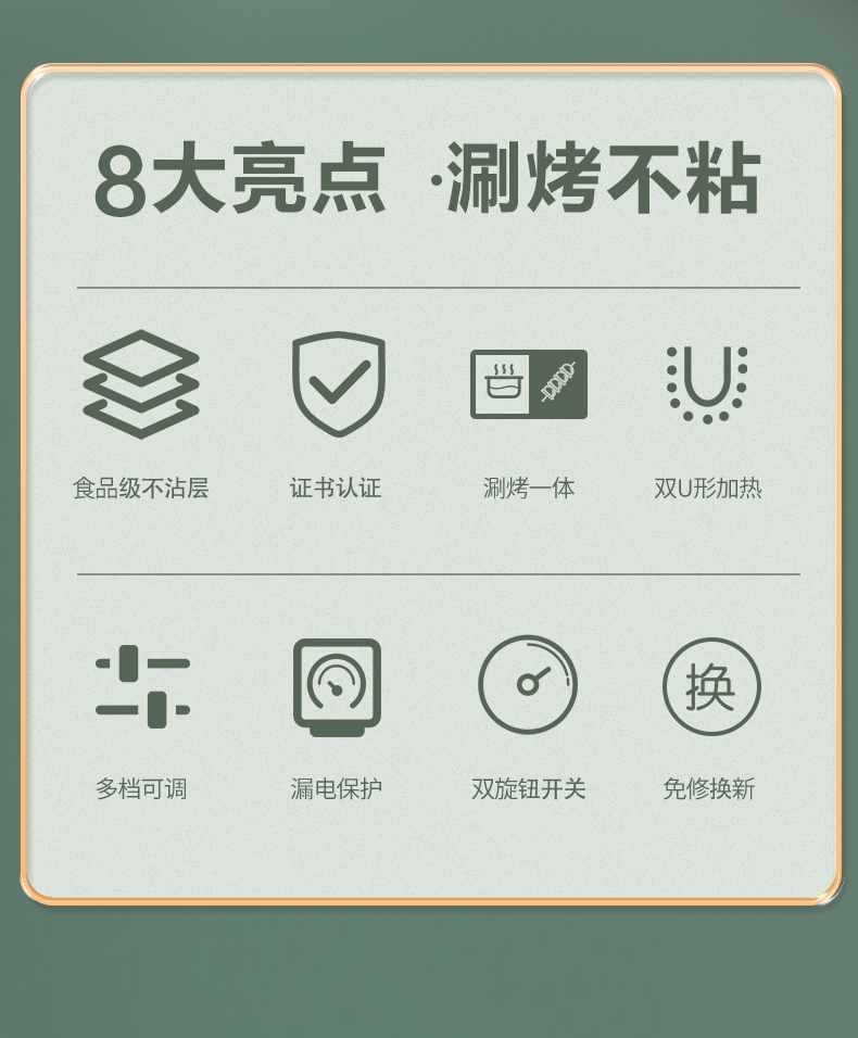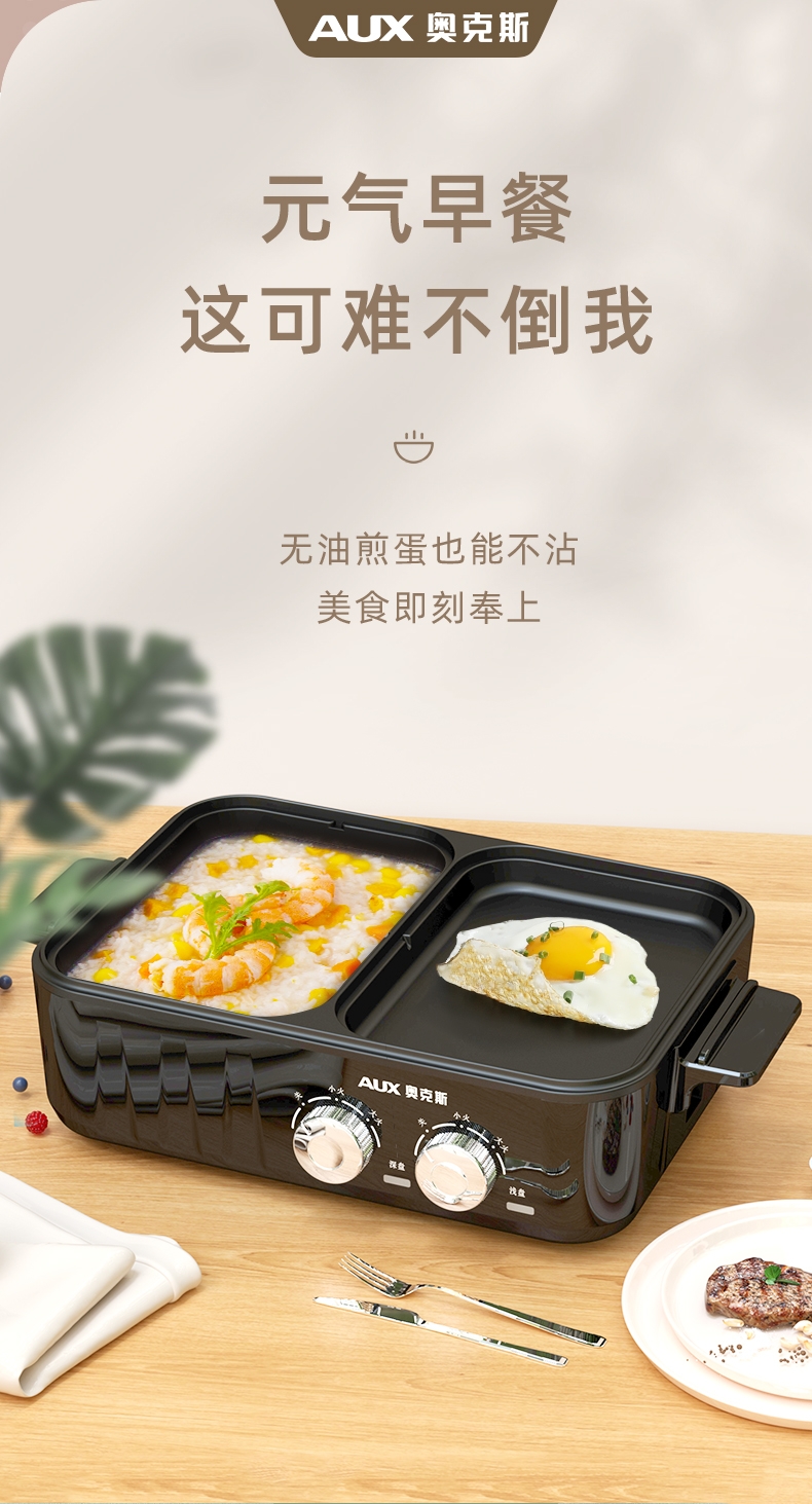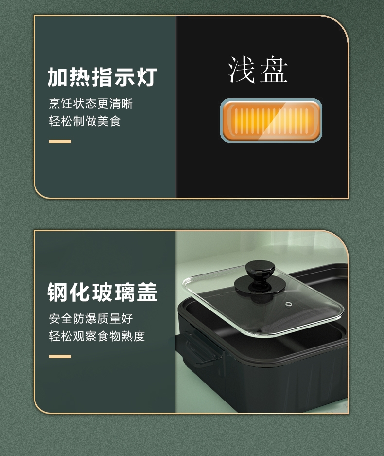 烤涮一体锅,煎/炒/焖/煮/炖/涮;精致容量,可1-3人使用;1200W功率,双旋钮开关;左涮右烤,双区独立控温;食品接触级不粘涂层,易清洁不粘锅