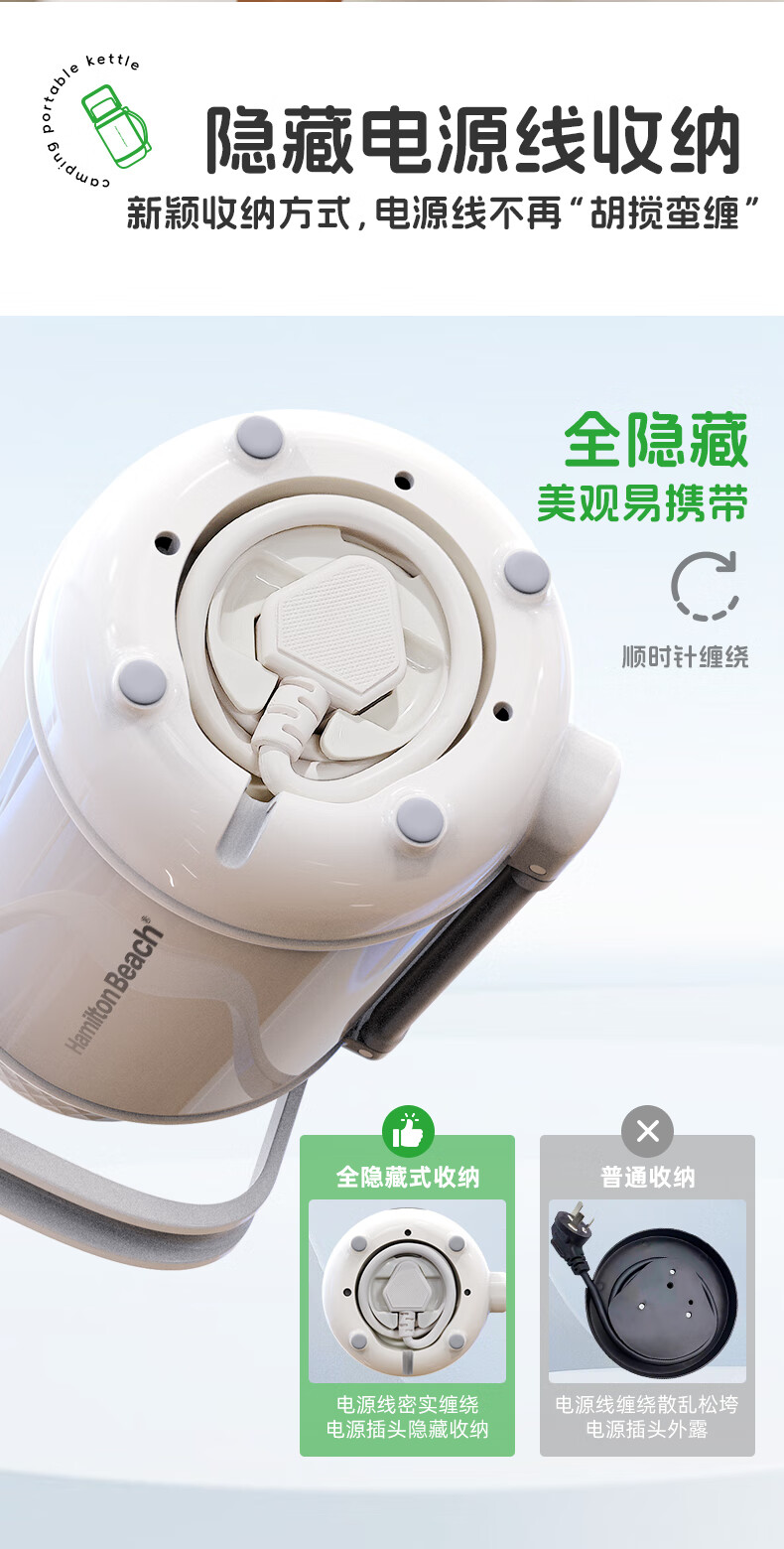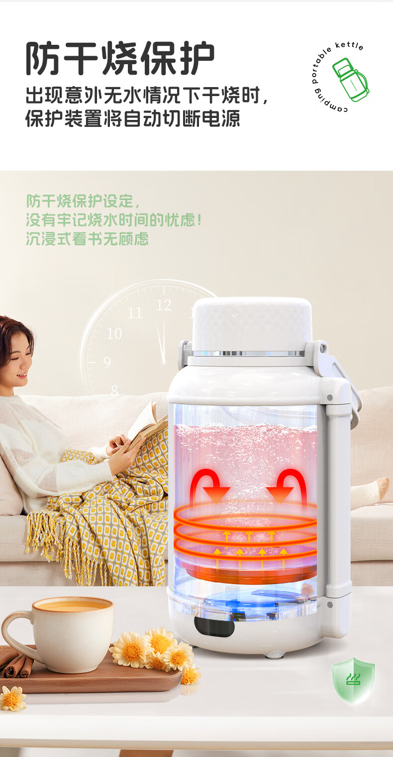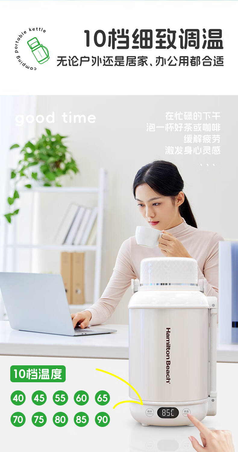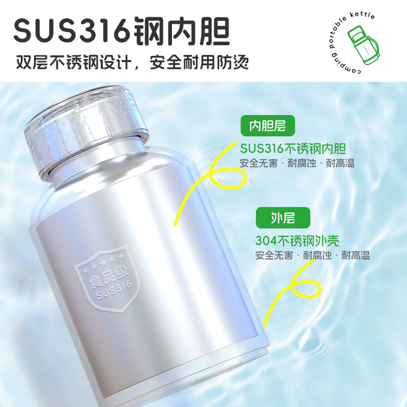 泡茶/喝水/烧水三合一,一机双杯盖,配备茶漏;隐藏式电源收纳线,户外、办公、居家都方便;1200ML大容量,满足家庭畅饮;双层不锈钢,外层304,内胆食品级316;10档温度调节,防干烧保护