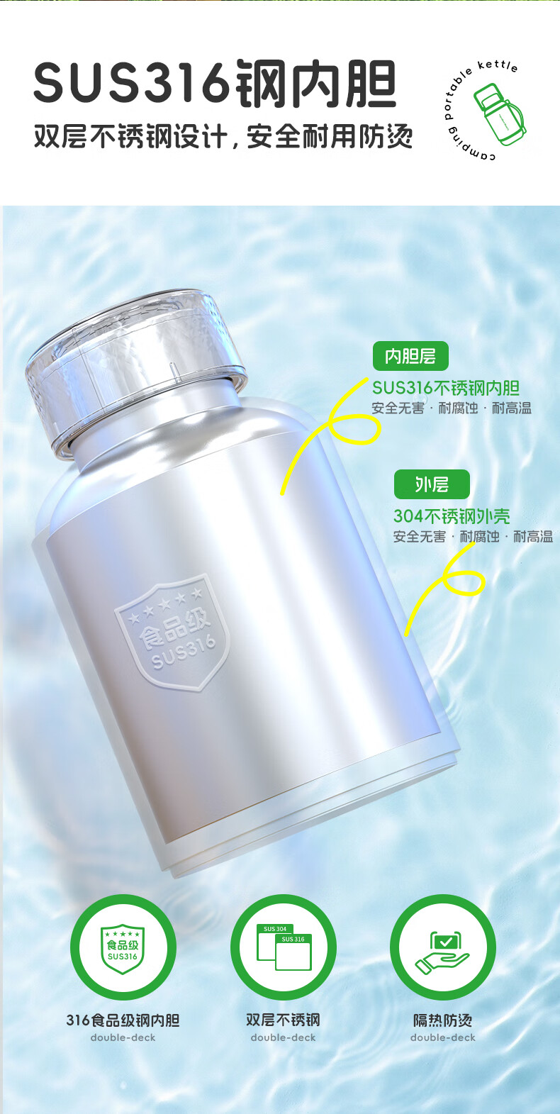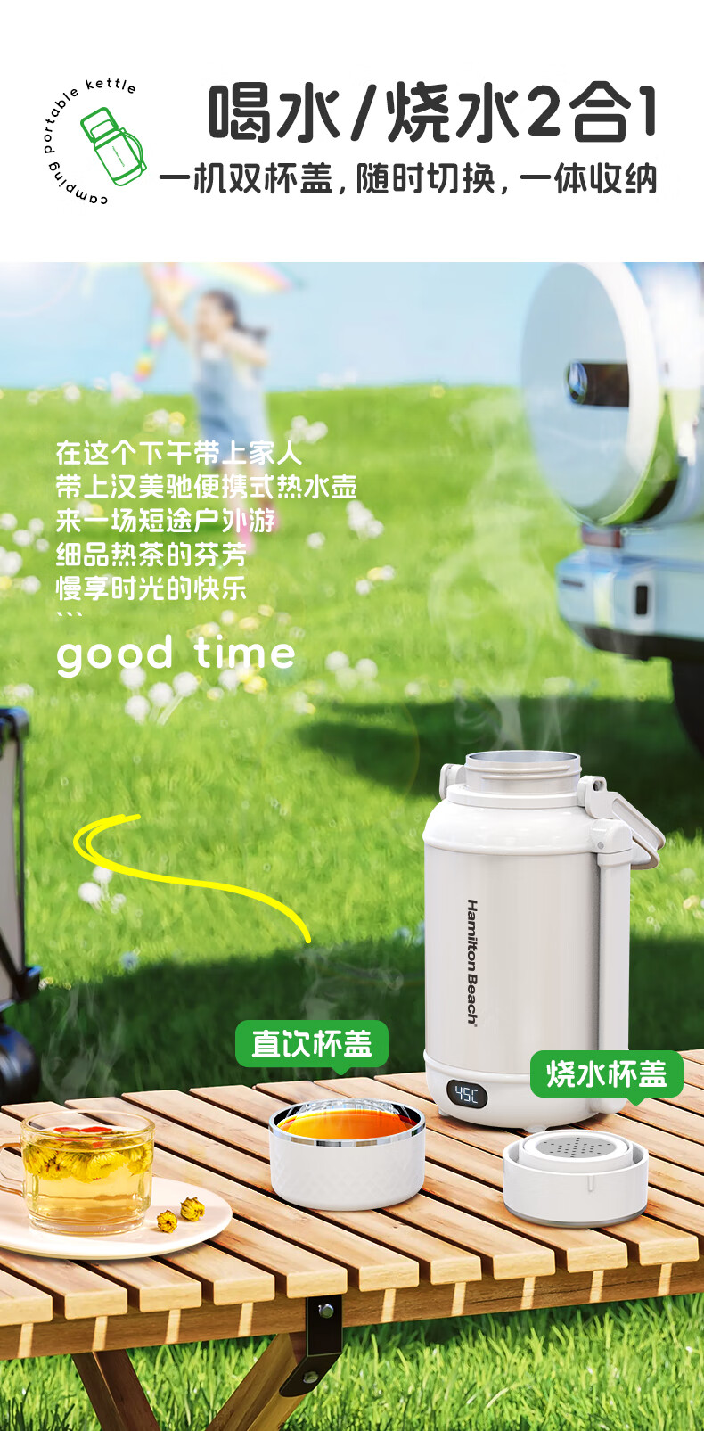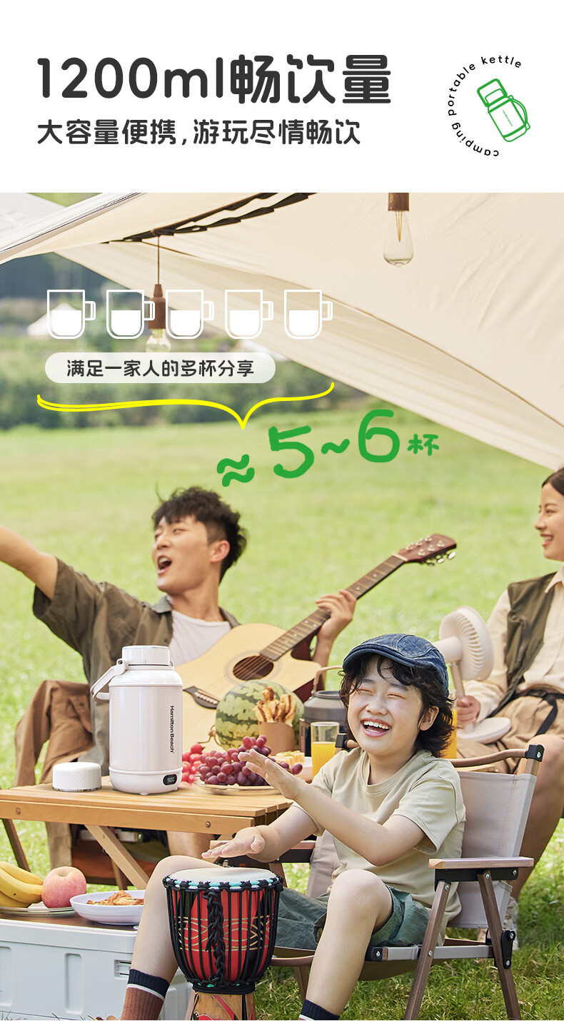 泡茶/喝水/烧水三合一,一机双杯盖,配备茶漏;隐藏式电源收纳线,户外、办公、居家都方便;1200ML大容量,满足家庭畅饮;双层不锈钢,外层304,内胆食品级316;10档温度调节,防干烧保护