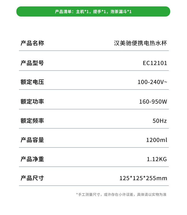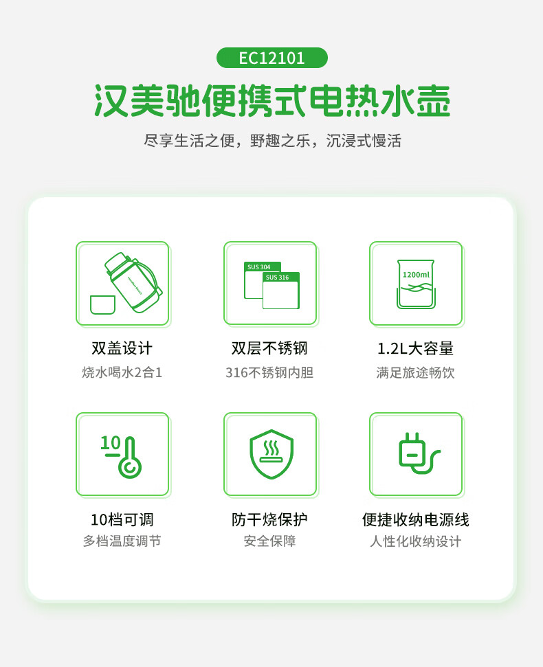 汉美驰 便携式电热水壶1.2LEC12101