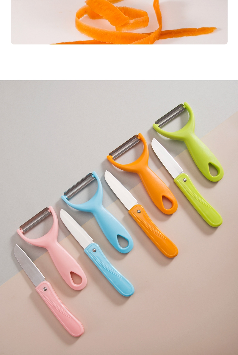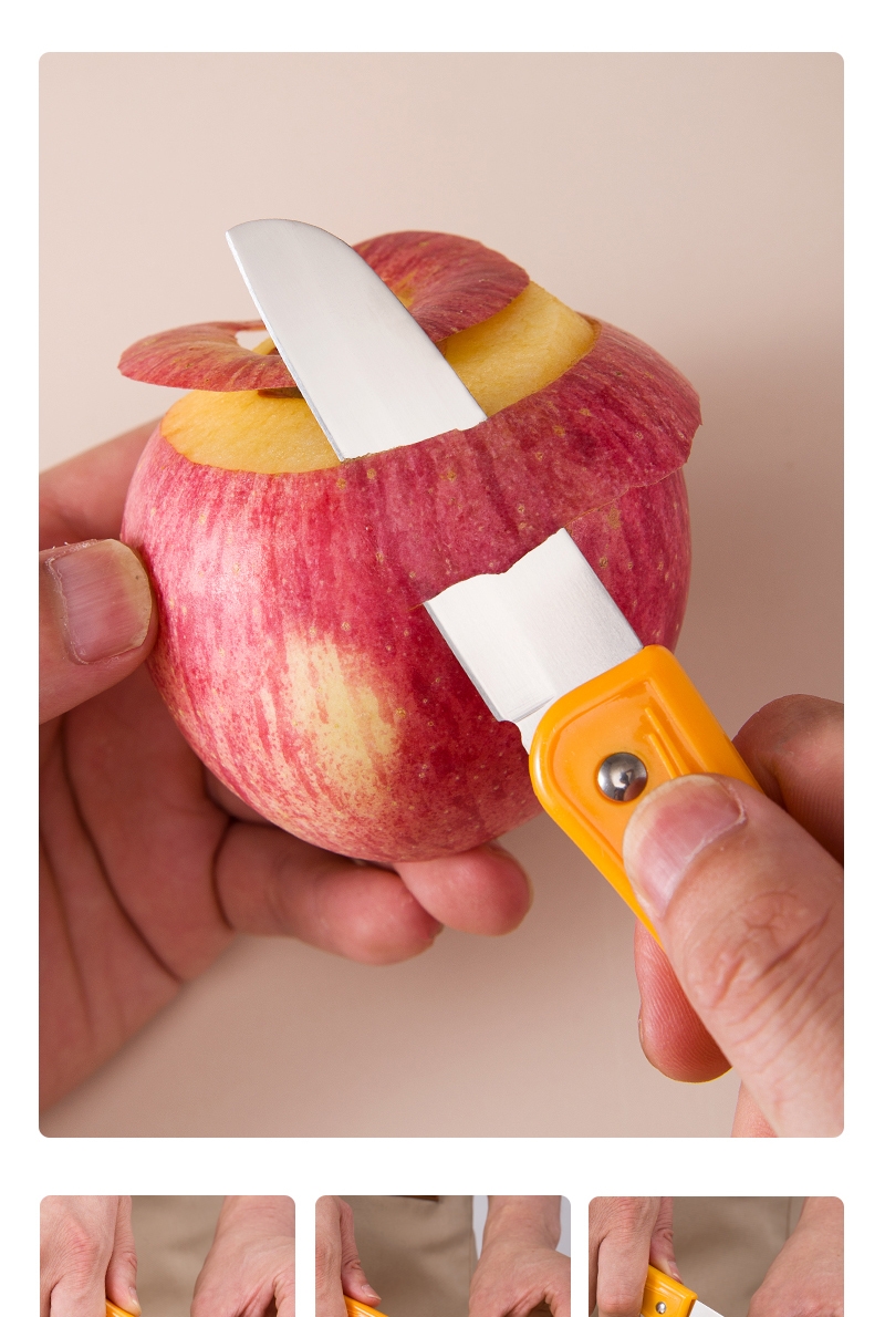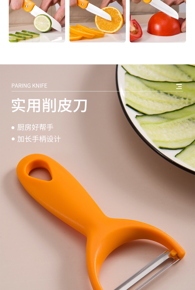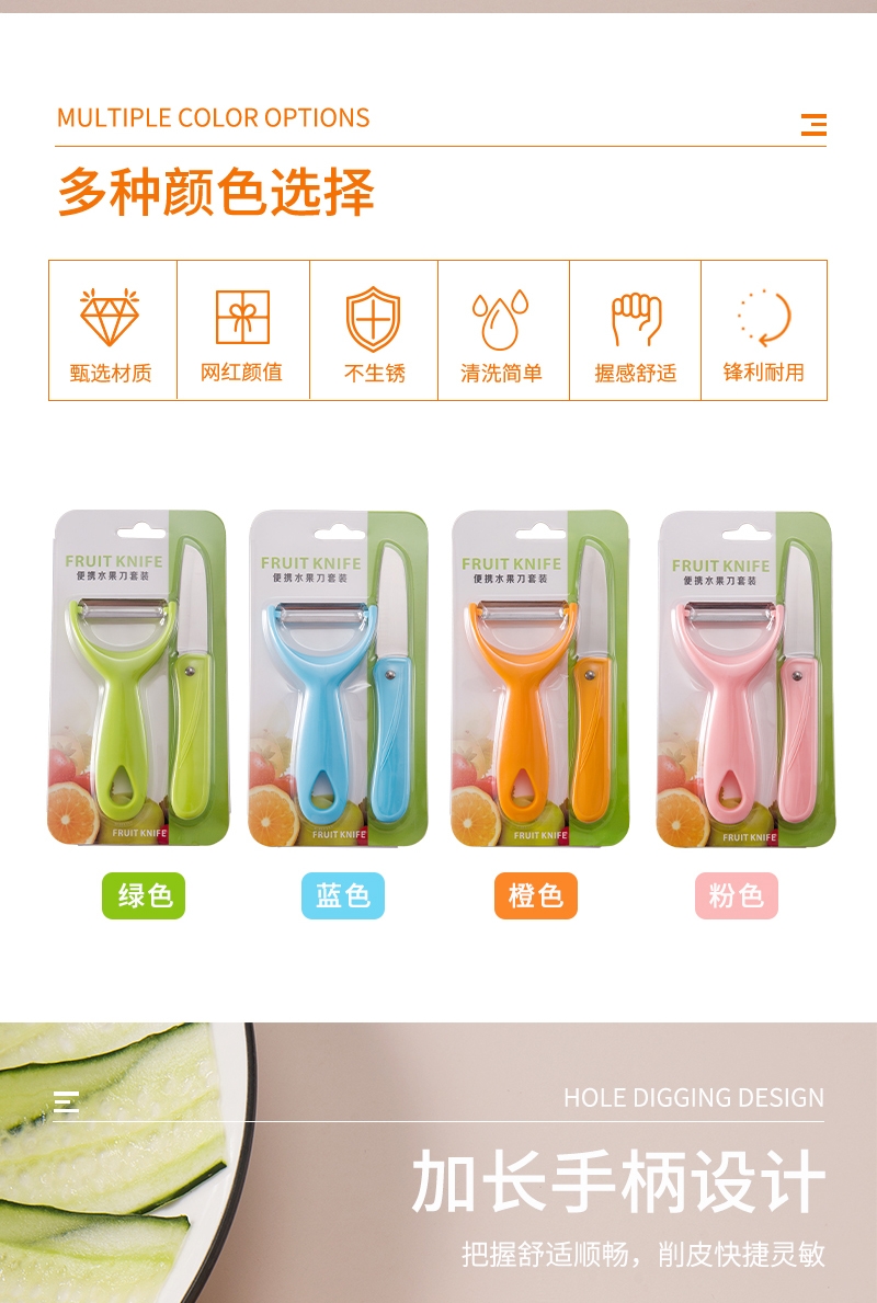 水果刀刀锋锋利持久切片顺滑不粘连可轻松处理各类果蔬;削皮刀头搭配挖眼器,轻松去除果蔬外皮和果蒂果核 ;圆润手柄不硌手,挂孔设计可悬挂收纳,节省厨房空间
